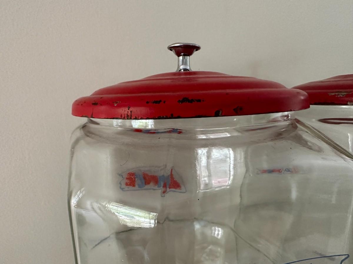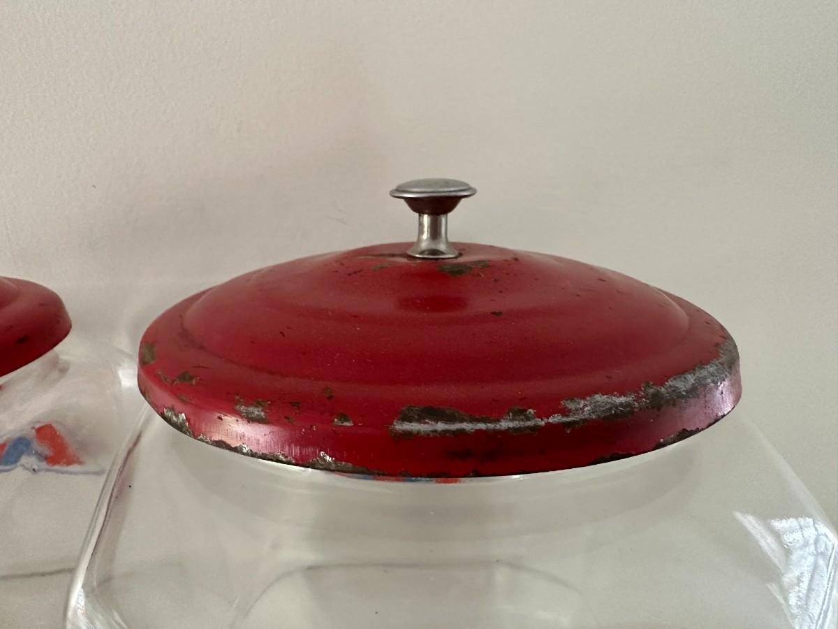 2 Lance Jars with Metal Lids. Jars measure 10.5"h x 7"w x 8.5"d w/o lids. Red lids have silver knob and show some wear
