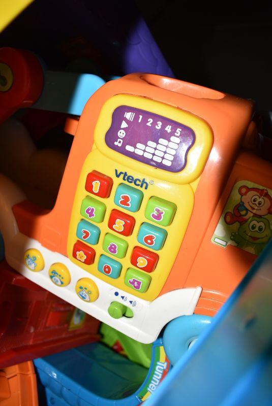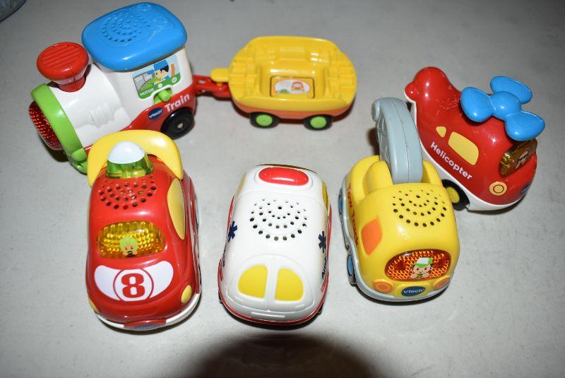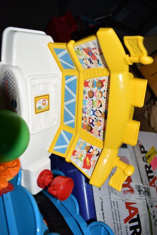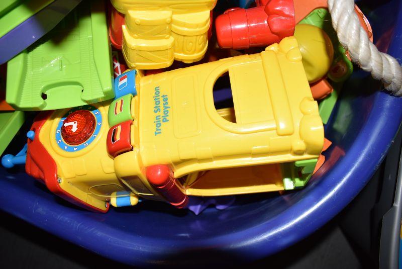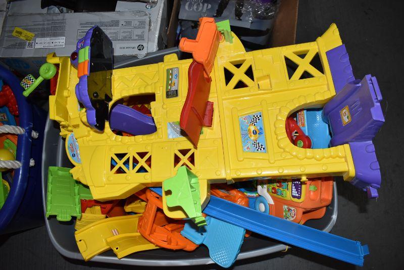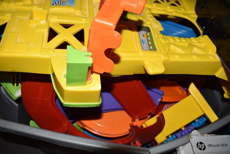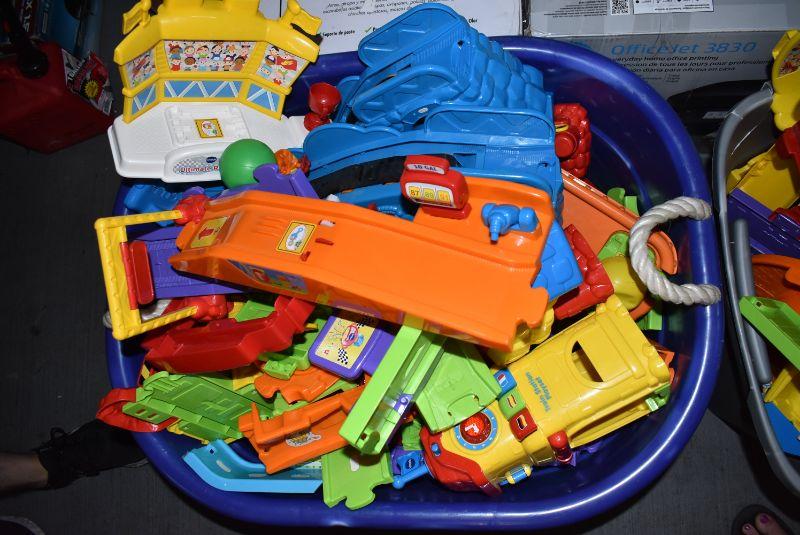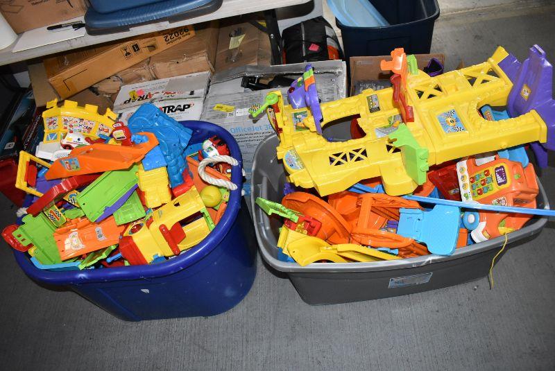 2 Large Bins (Gray, Blue) of VTech Racers, Train Station Playsets, and More