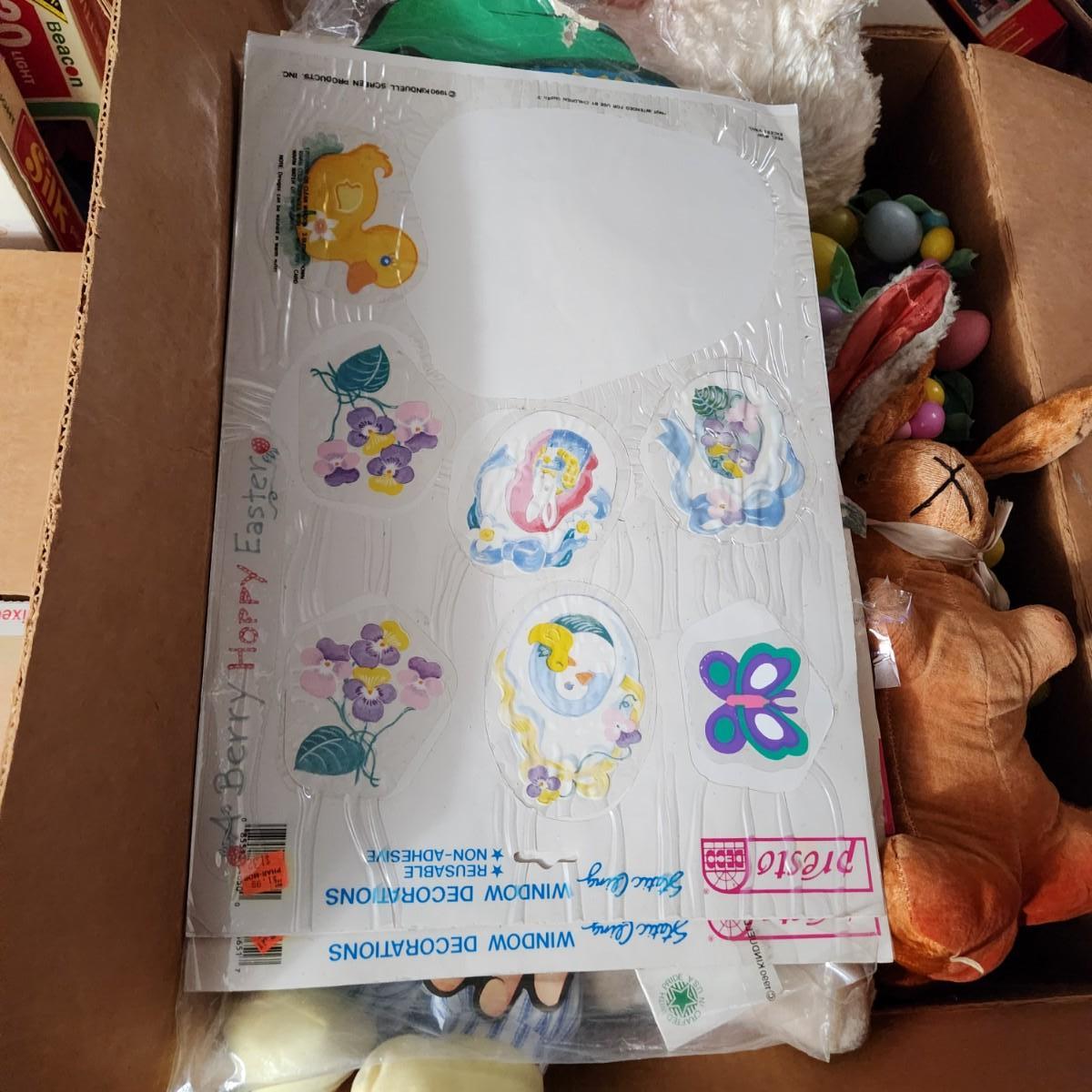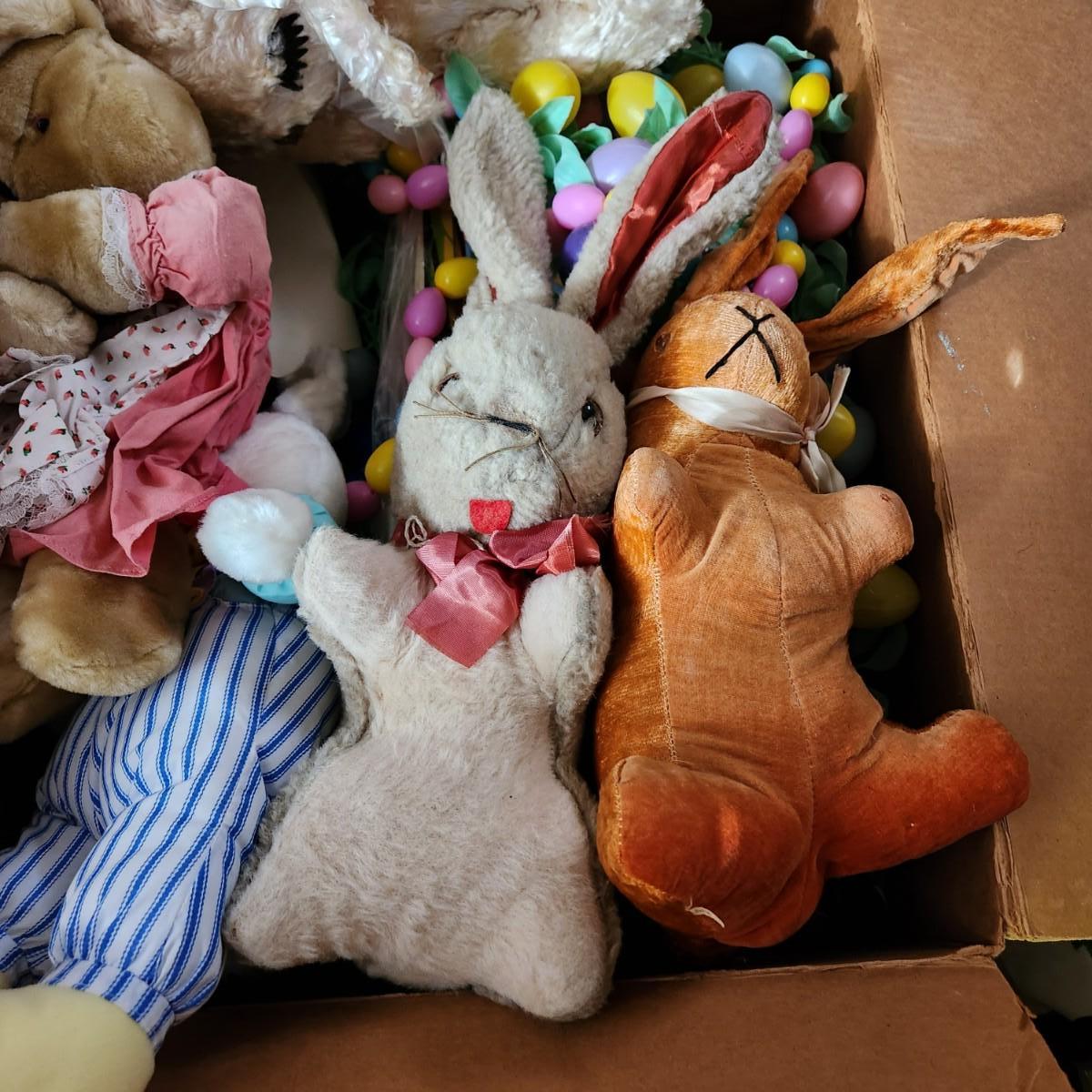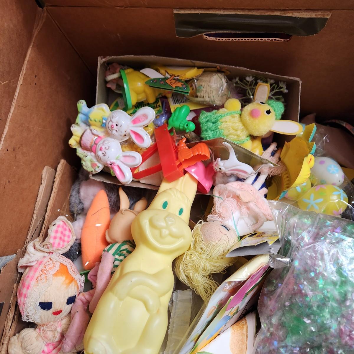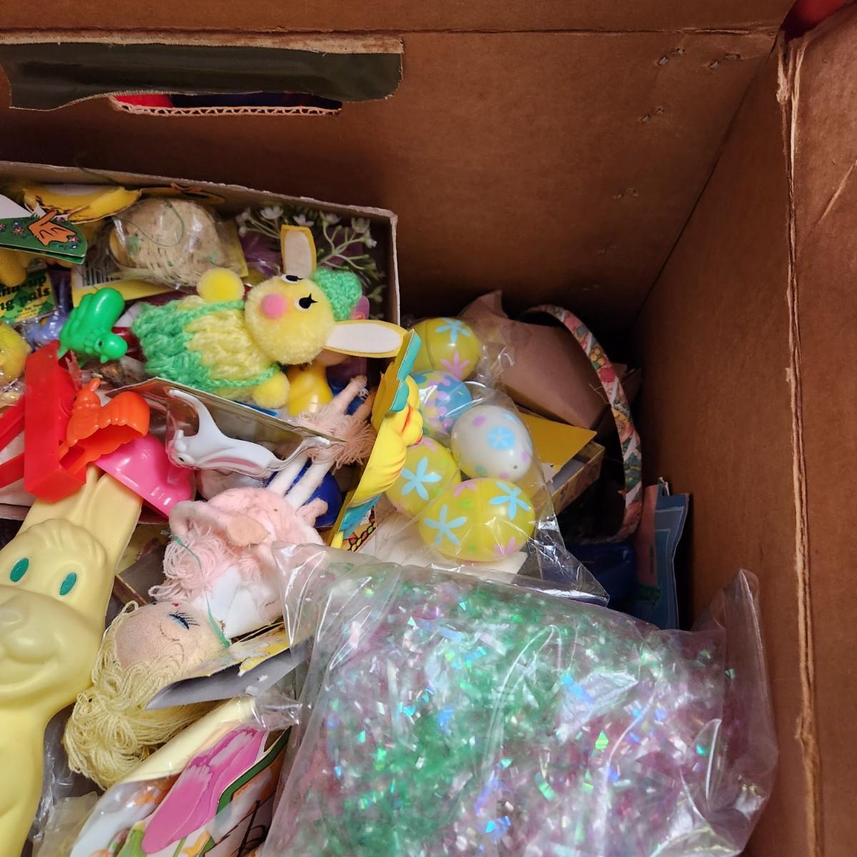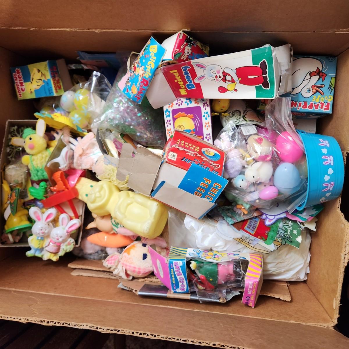 2 Large Boxes of Vintage Easter Decor Decorations Plush, Eggs, Toys, Sticker and More