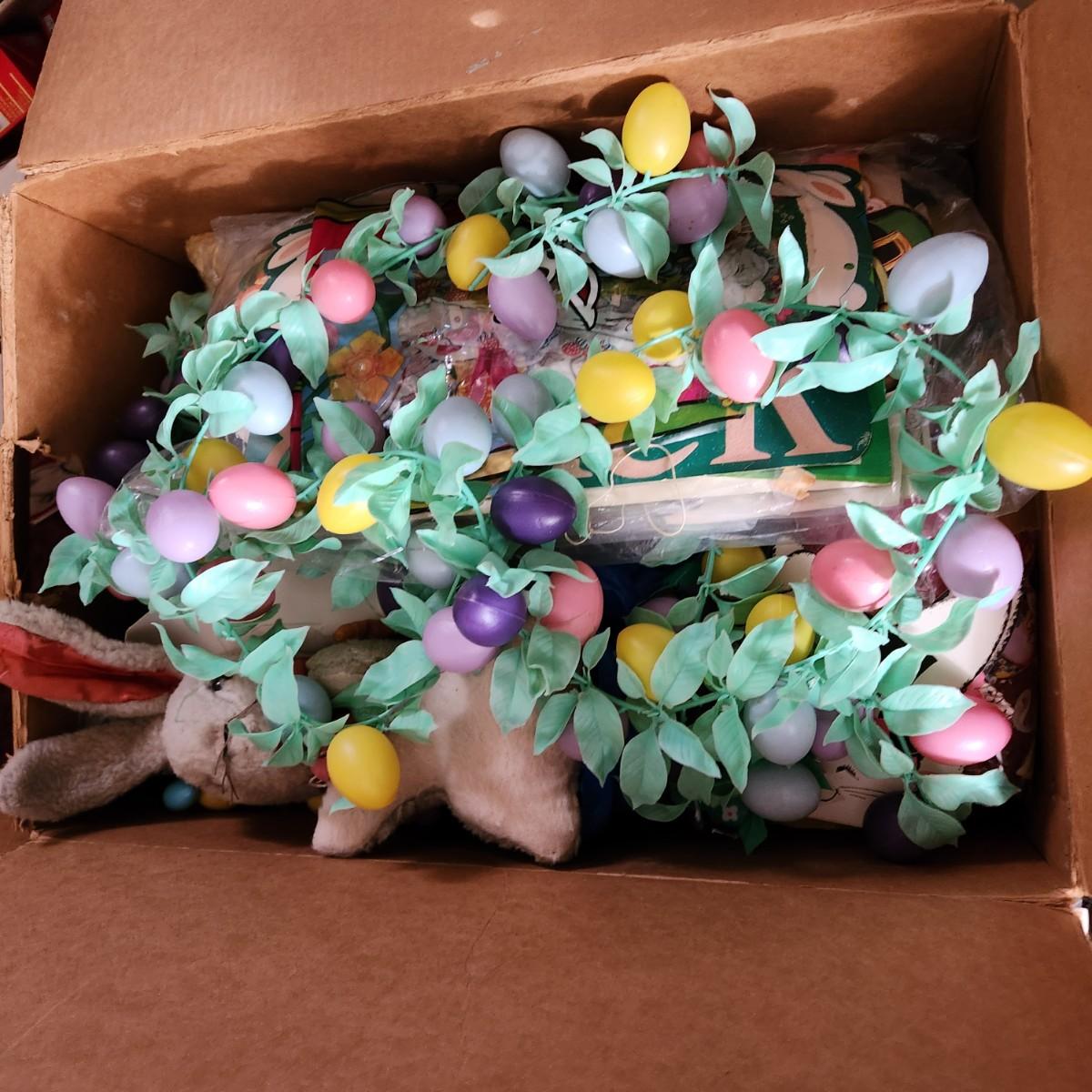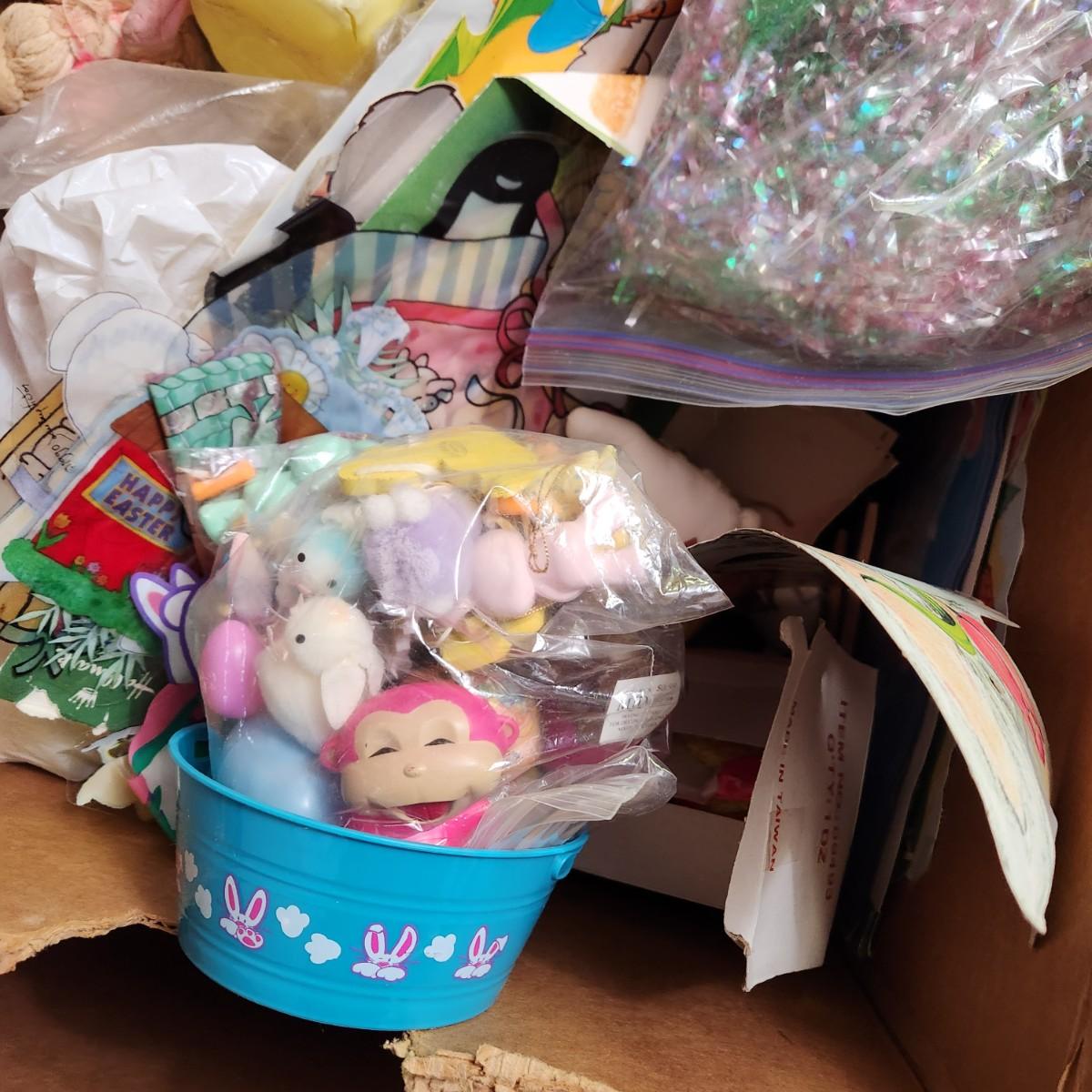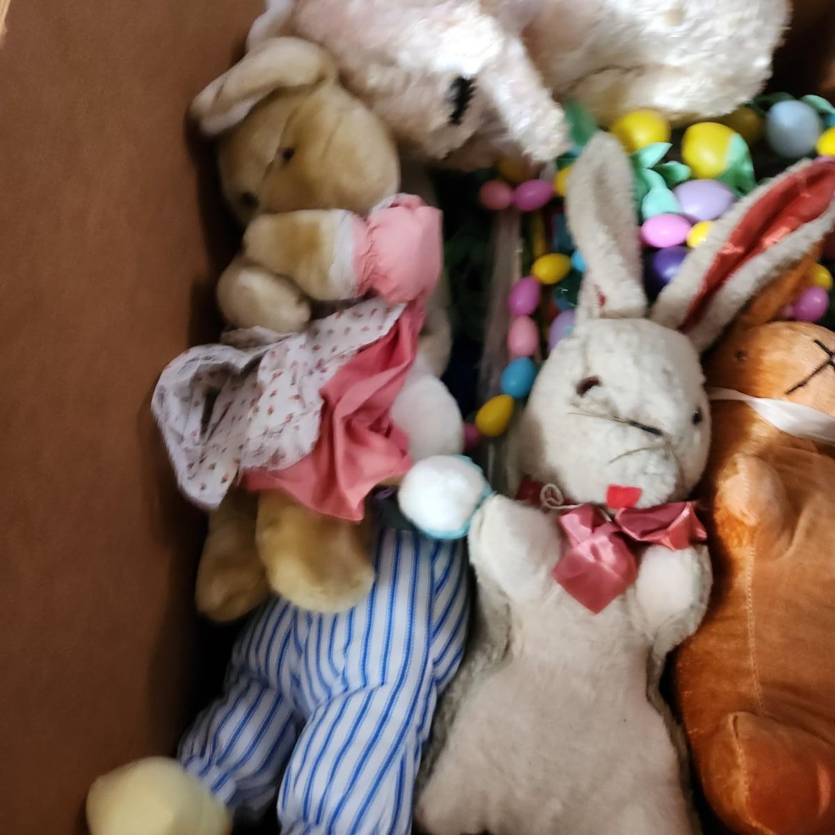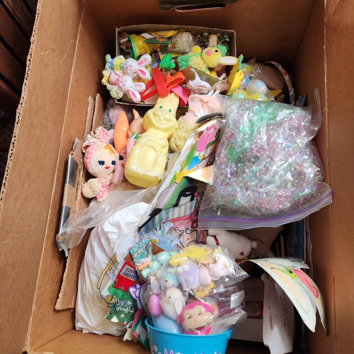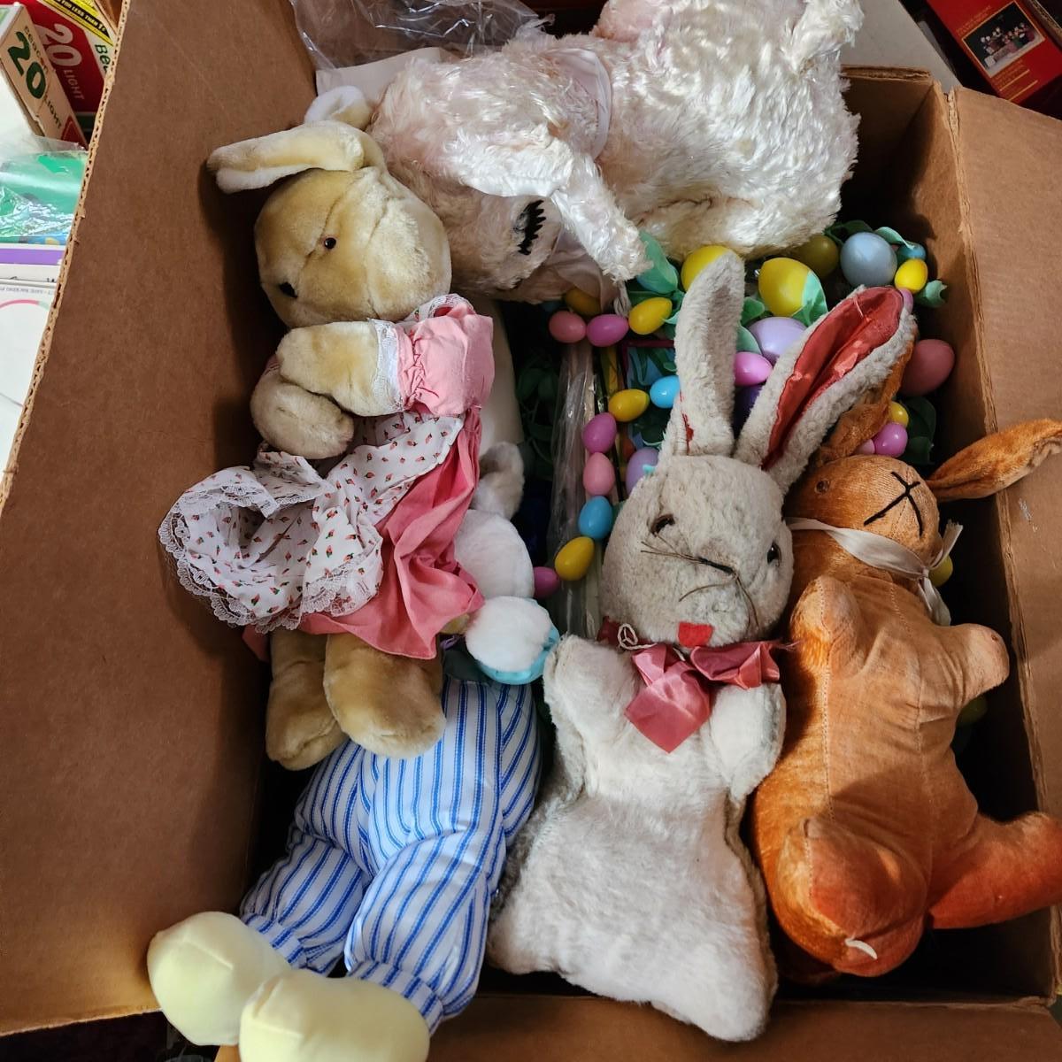 2 Large Boxes of Vintage Easter Decor Decorations Plush, Eggs, Toys, Sticker and More