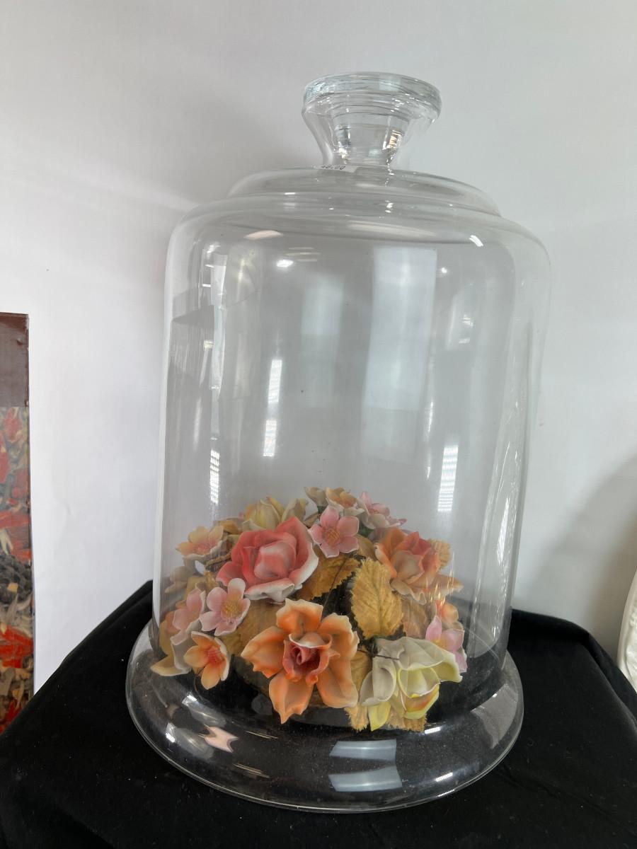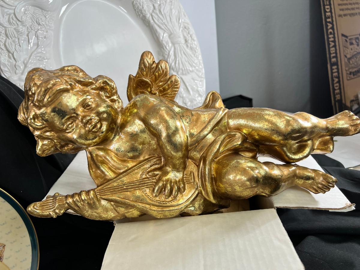Gold Cupid paper mache, Capodimonte flowers under the large glass display.