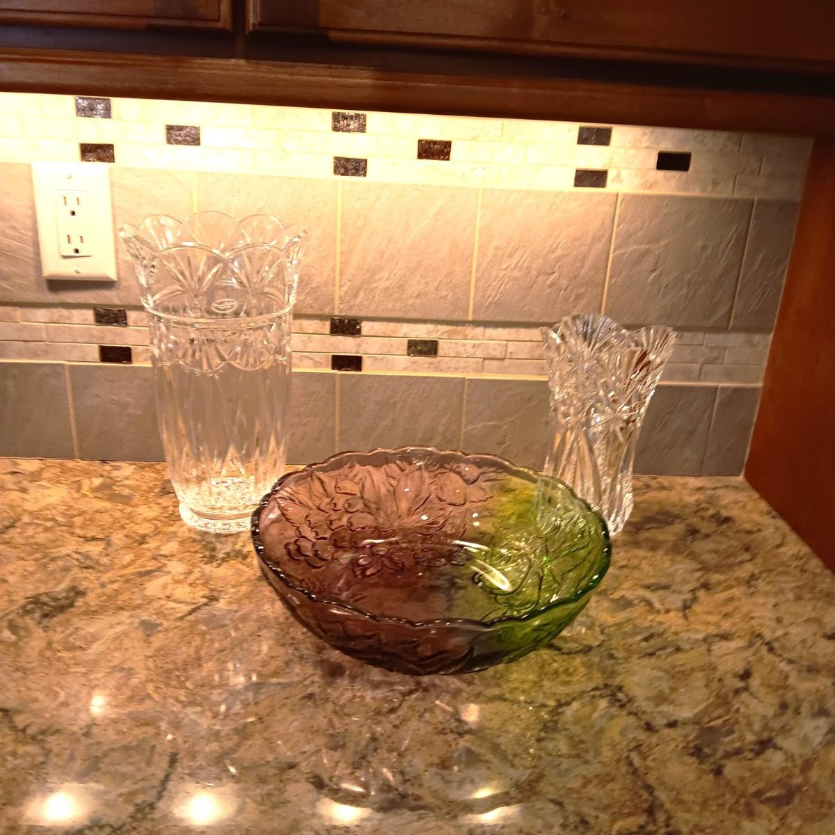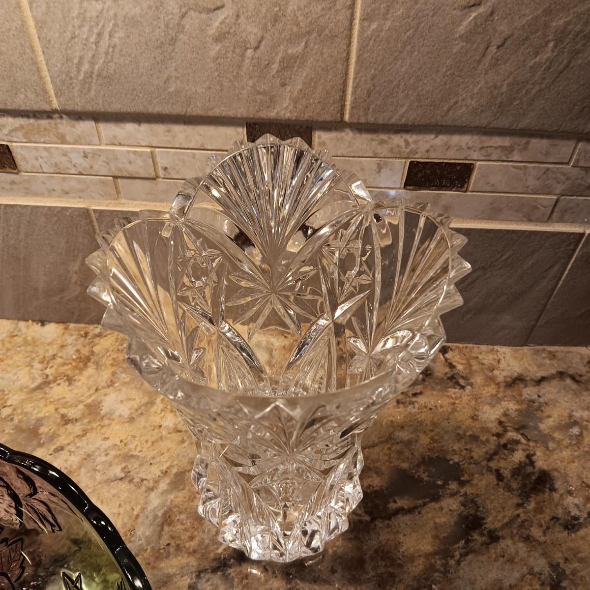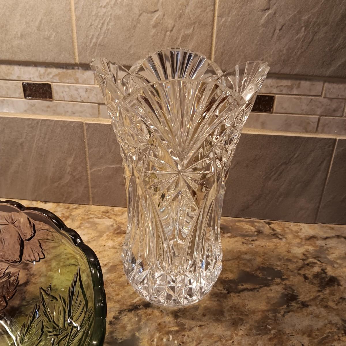2 LARGE CRYSTAL VASES AND A PURPLE AND GREEN GLASS BOWL