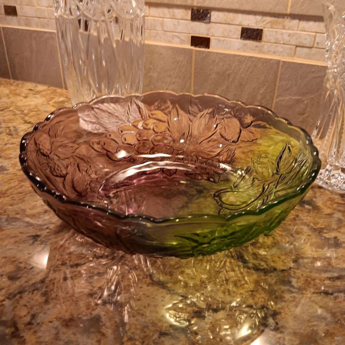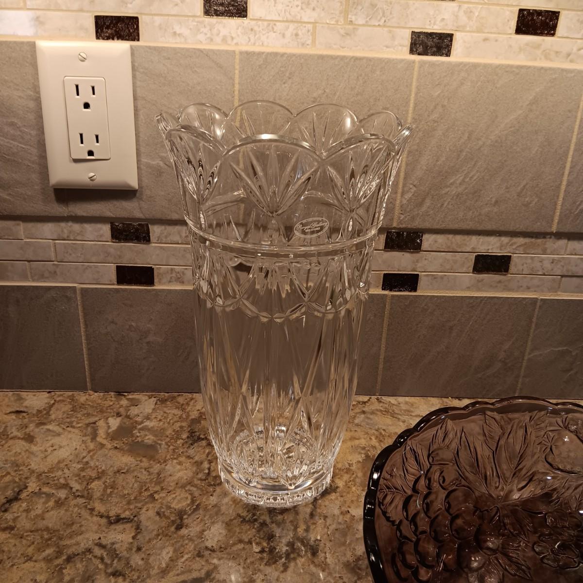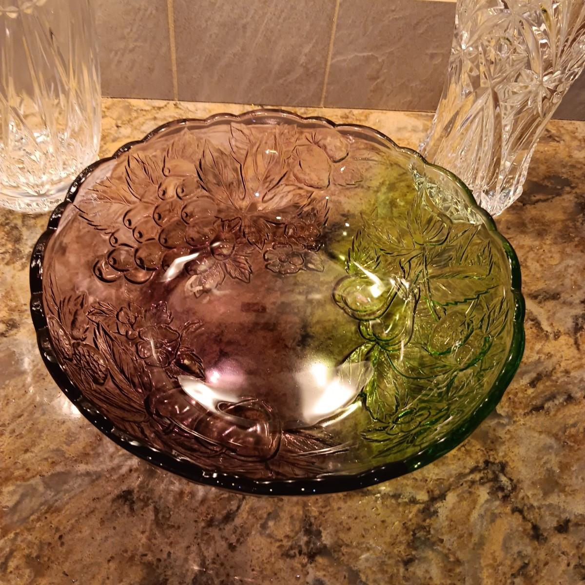 2 LARGE CRYSTAL VASES AND A PURPLE AND GREEN GLASS BOWL