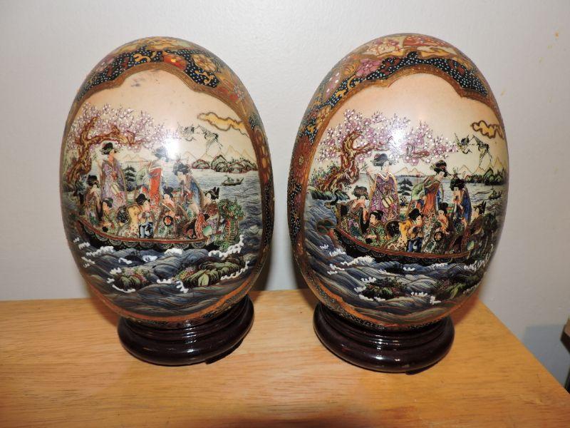 2 Large decorative panted eggs. Stamp says Satsuma, but sticker says Made in China. **Please read Terms and Conditions before placing a bid. Pick up is Thursday, August 15, 2019 from 4pm to 7pm or Sunday, August 18 from 11am-2pm in Mullica Hill. All sales are final. All sales are as is, where is. Please review all photos. Any props included in photos are not included in listing. All measurements are approximate.