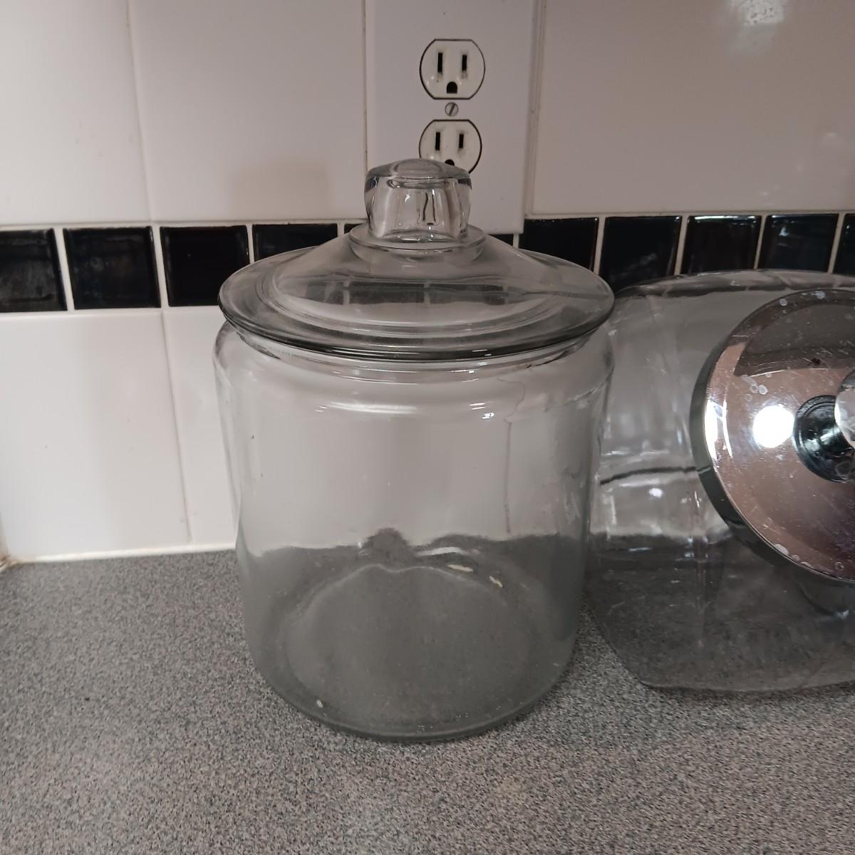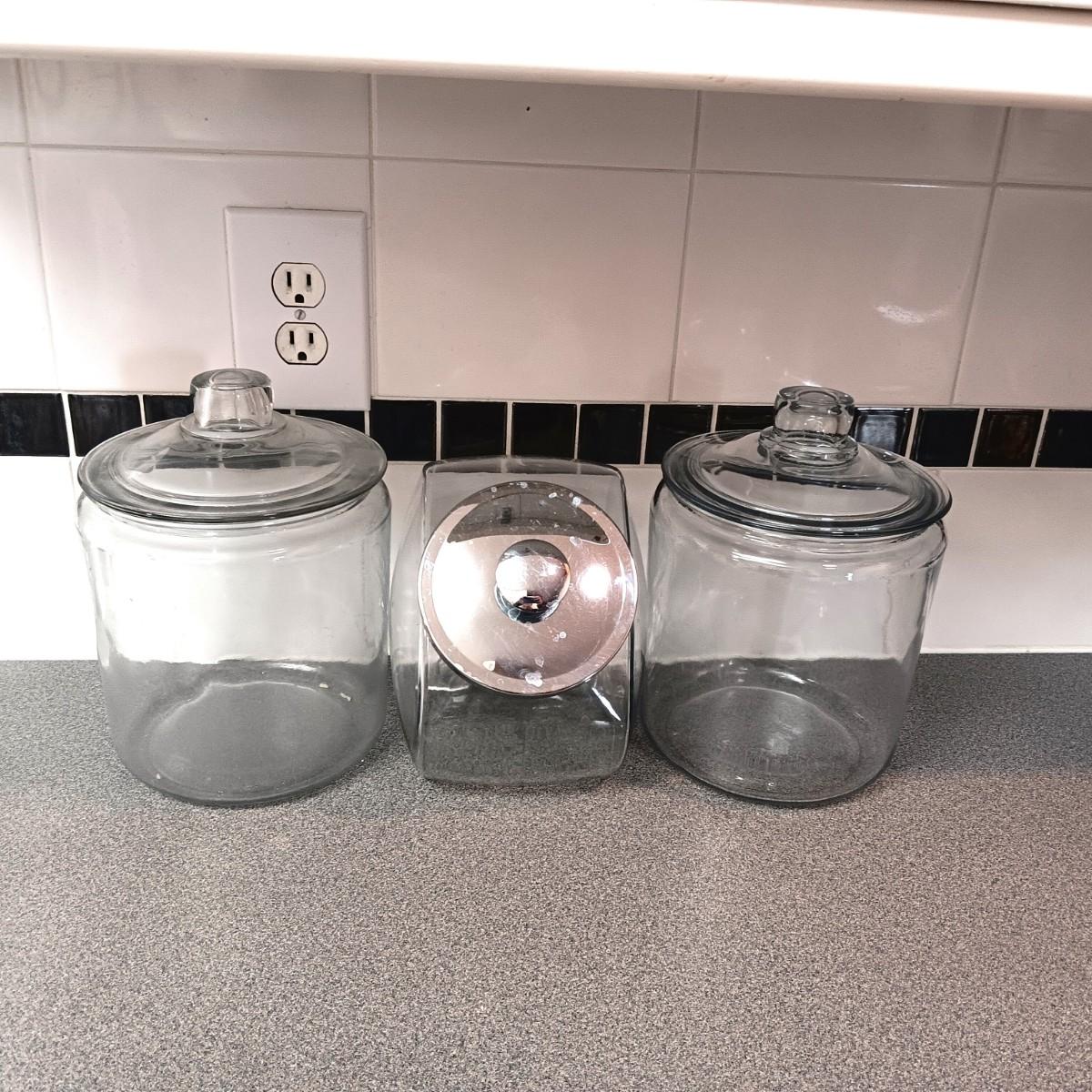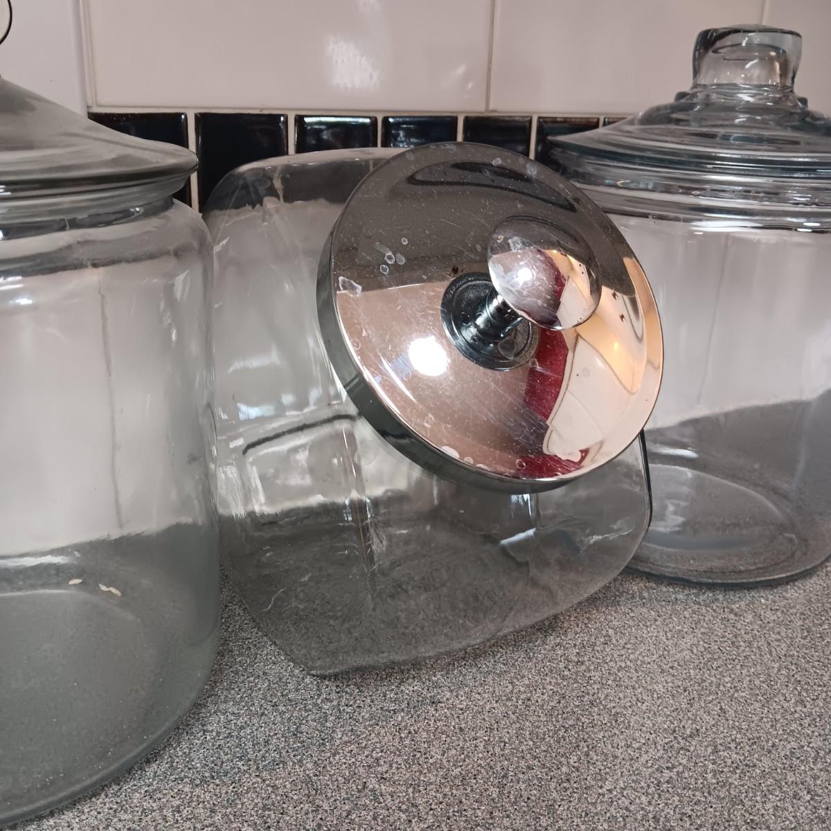 2 LARGE GLASS APOTHECARY JARS AND A GLASS CANISTER