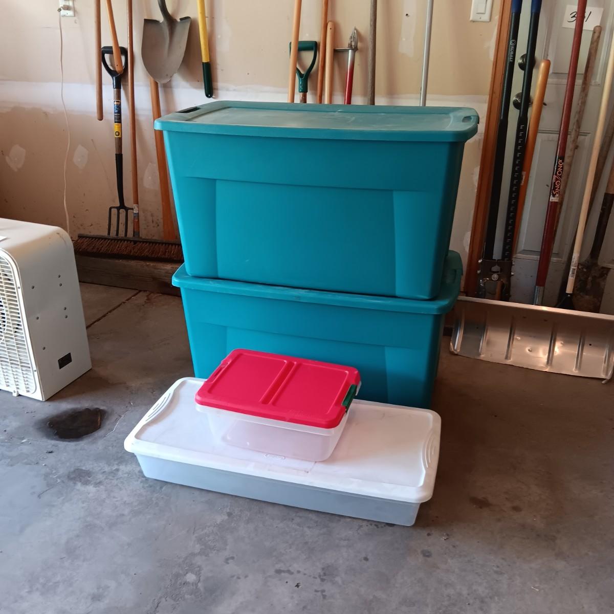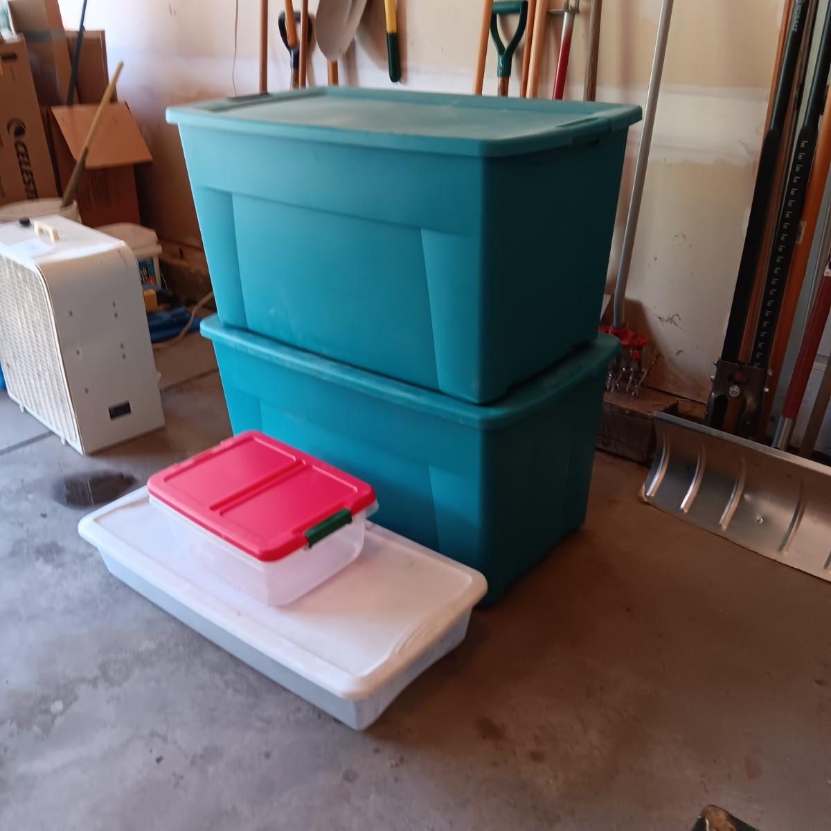 2 LARGE STORAGE CONTAINERS WITH 2 WHEELS ONE END