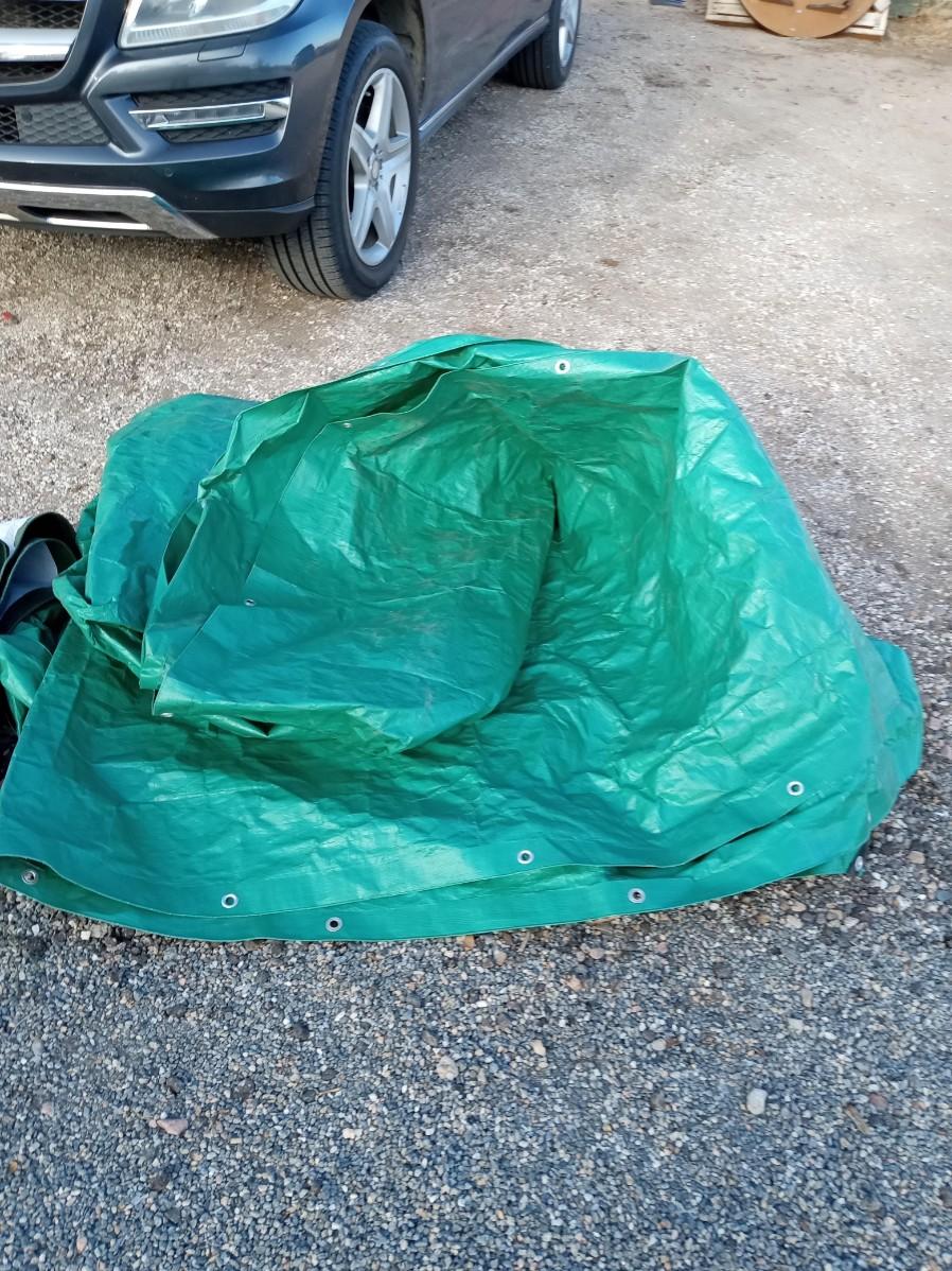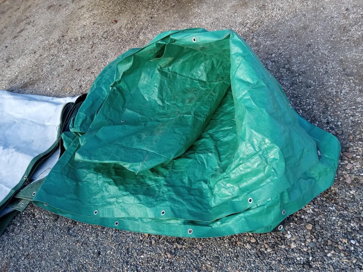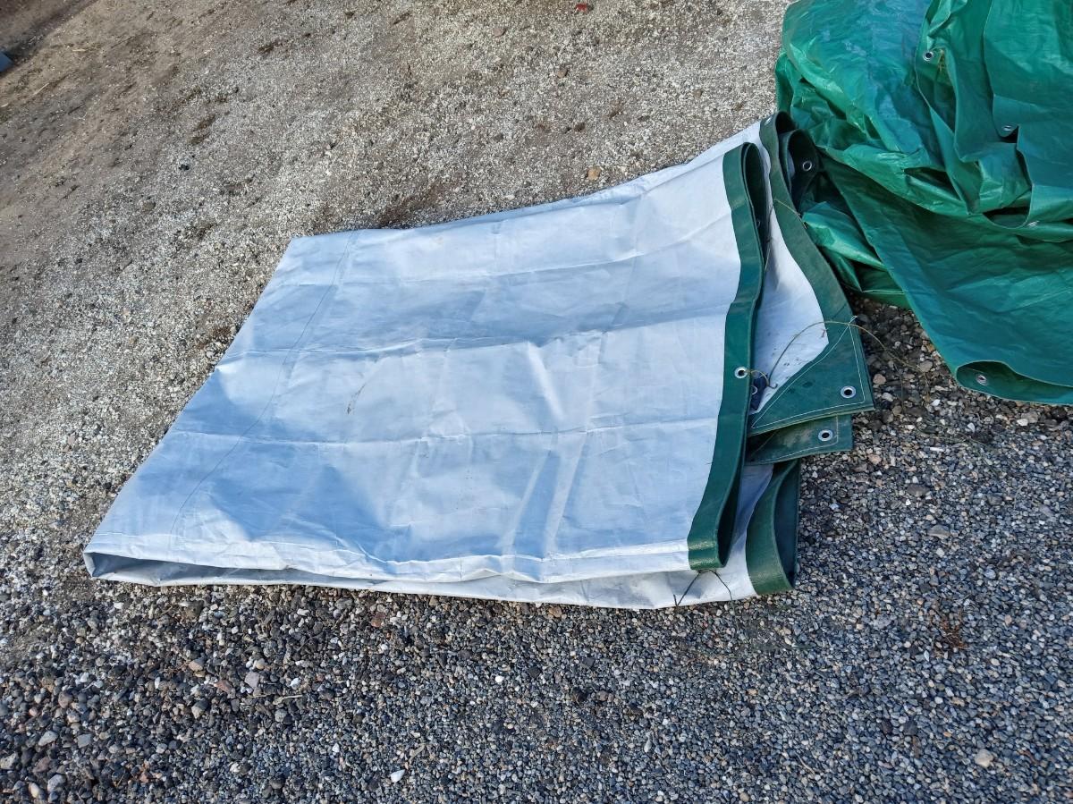THE WHITE BACKED TARP IS VERY THICK THE GREEN TARP IS MEDIUM THICKNESS, BOTH IN GOOD SHAPE