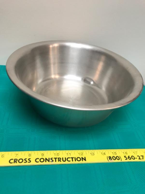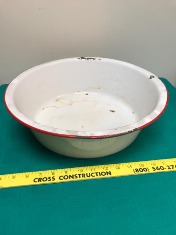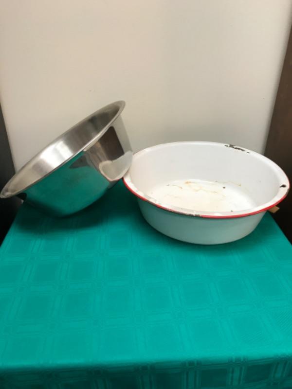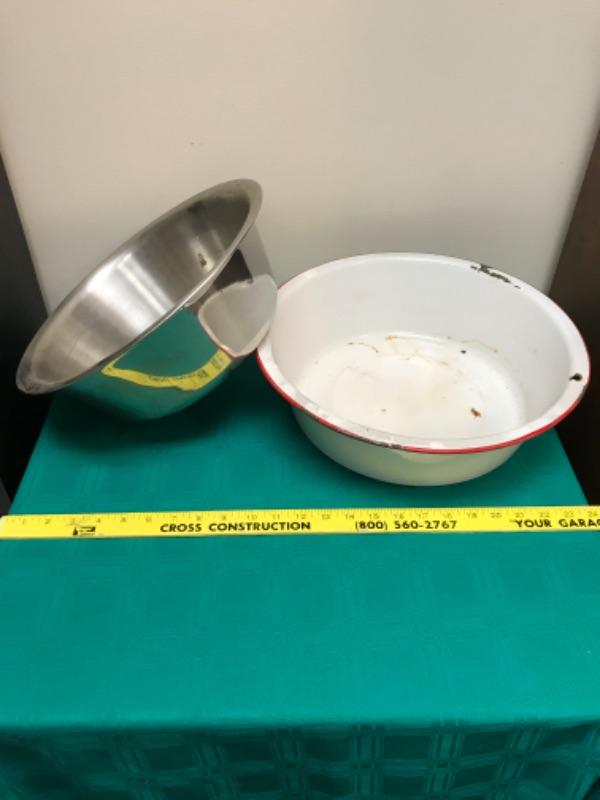 Lot of 2 large vintage bowls. One is stainless steel and made by Vollrath, the other is porcelain with a red rim and is unmarked. The stainless steel one measures 13.5 inches in diameter and stands 4.5 inches high. The porcelain one measures 14.5 inches in diameter, and stands 4.25 inches tall; see pictures.