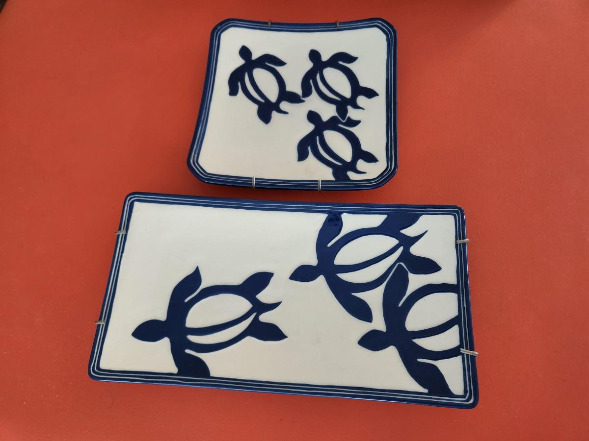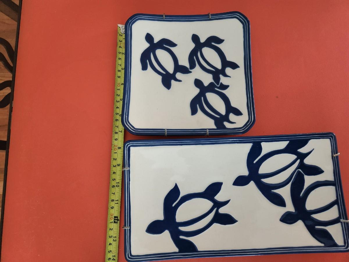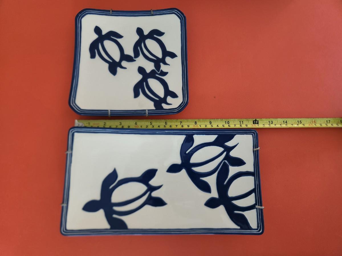 2 Lee Hawaii Pottery Serving Plate Turtles Blue & White Rectangle