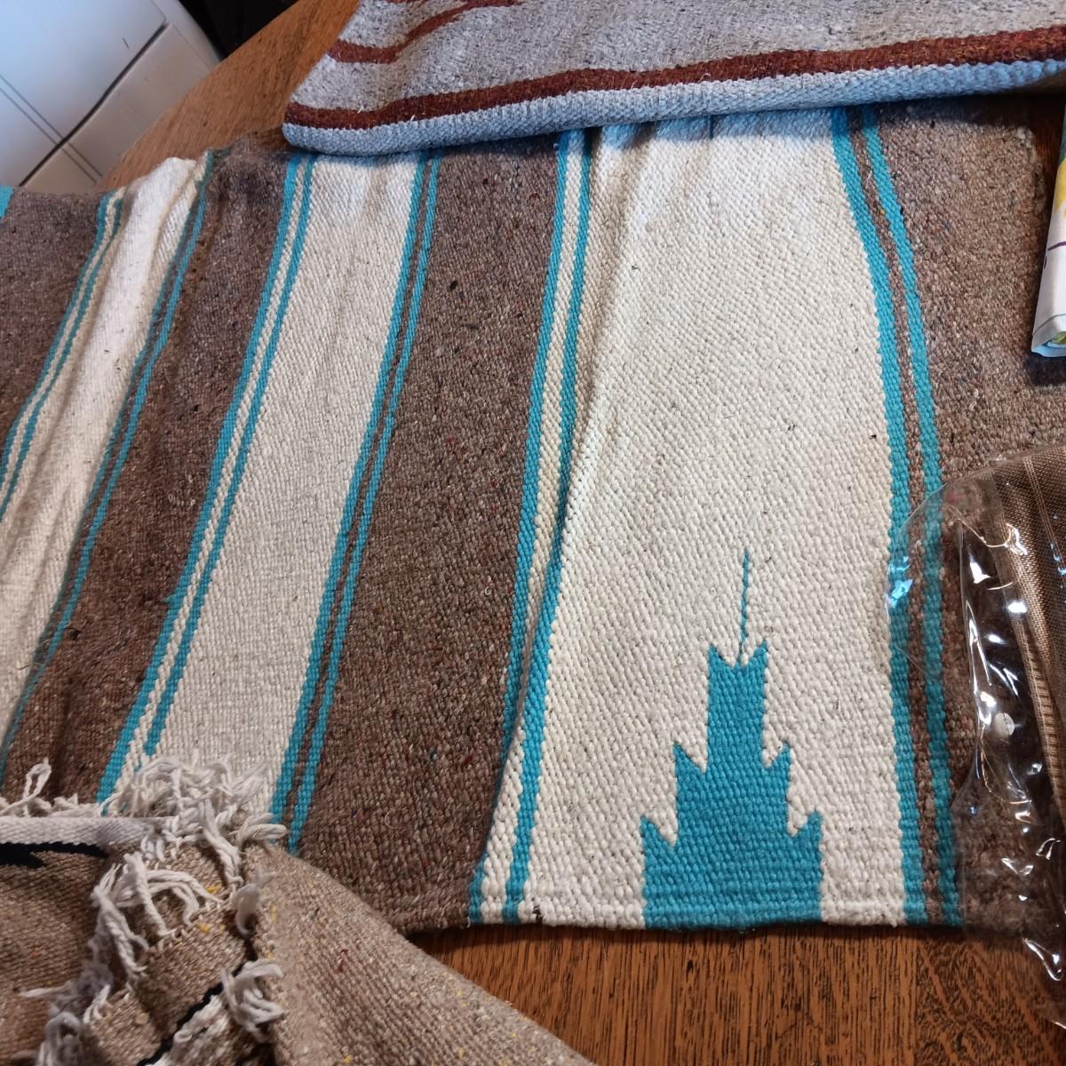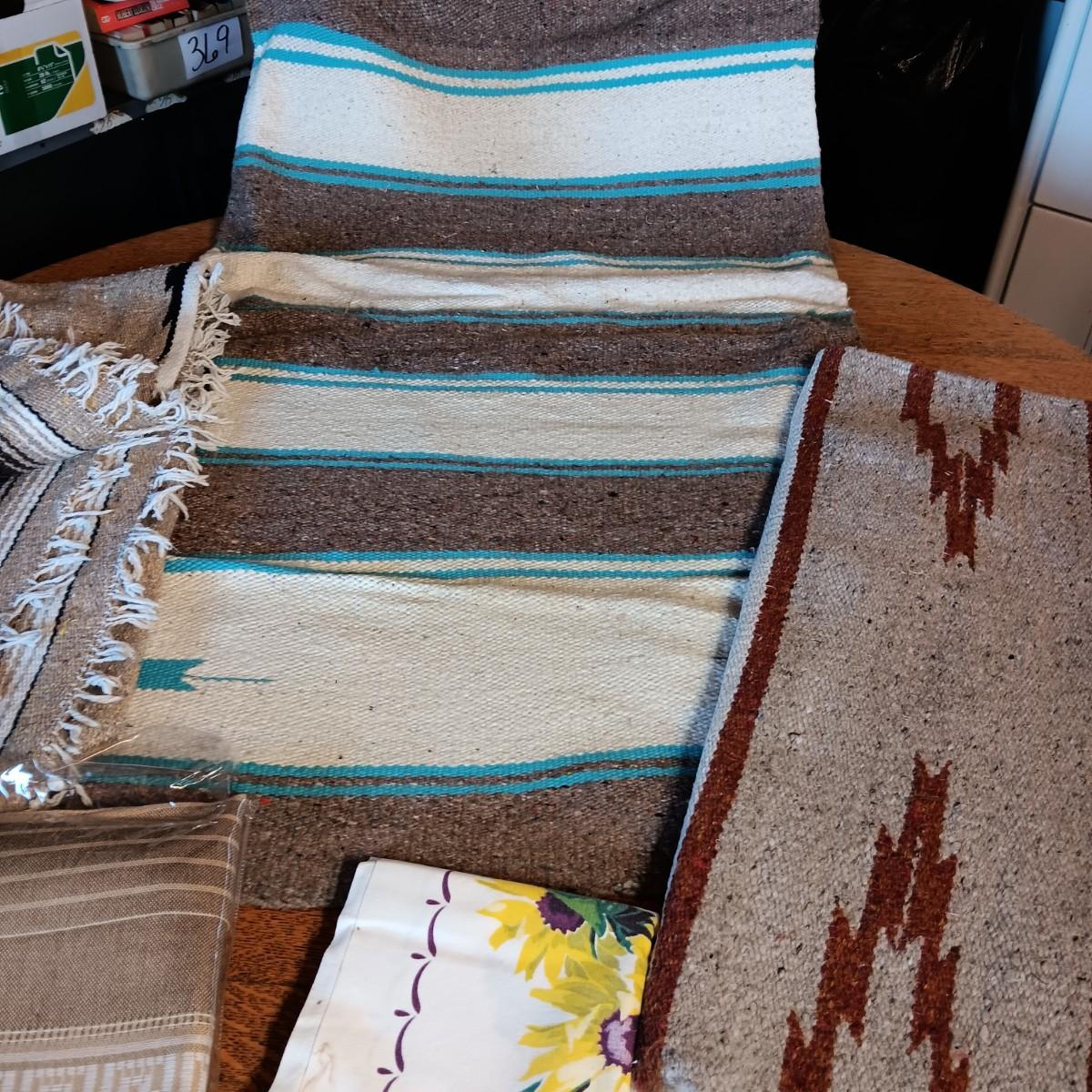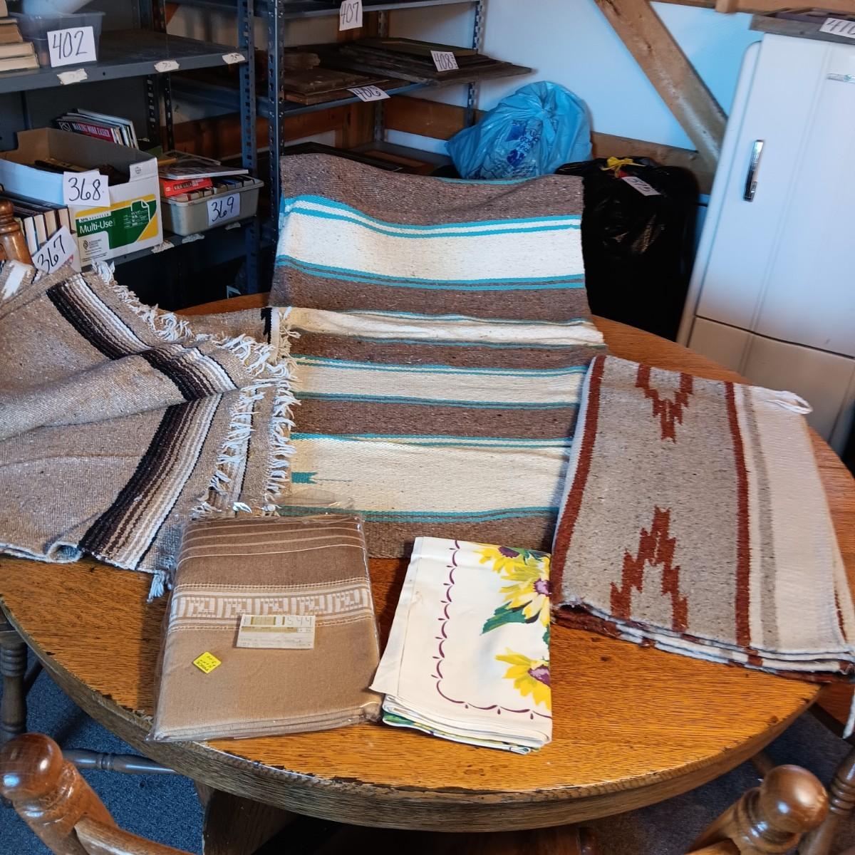 2 LINEN TABLECLOTHS, 2 WOVEN RUGS AND A BLANKET FROM MEXICO