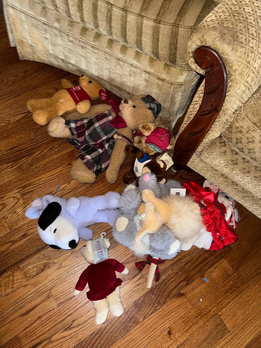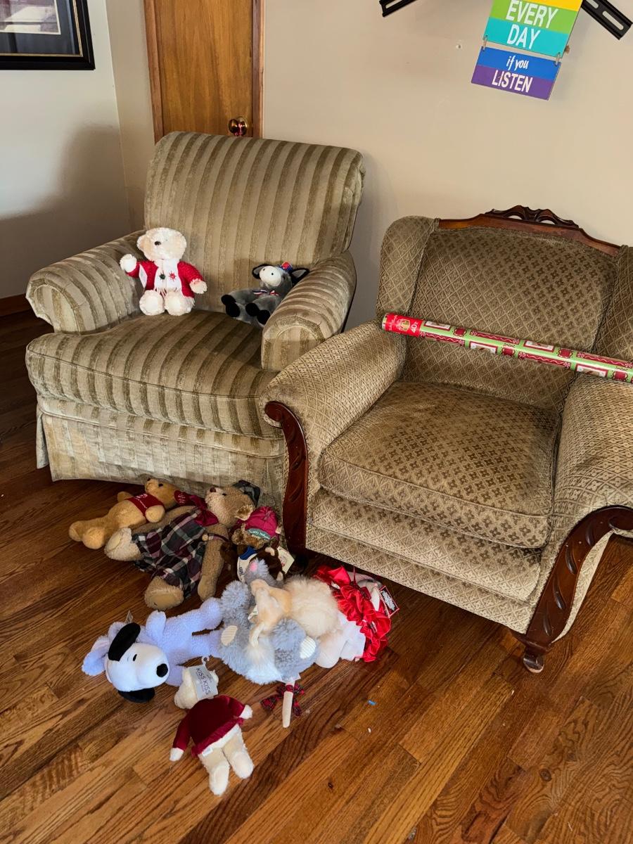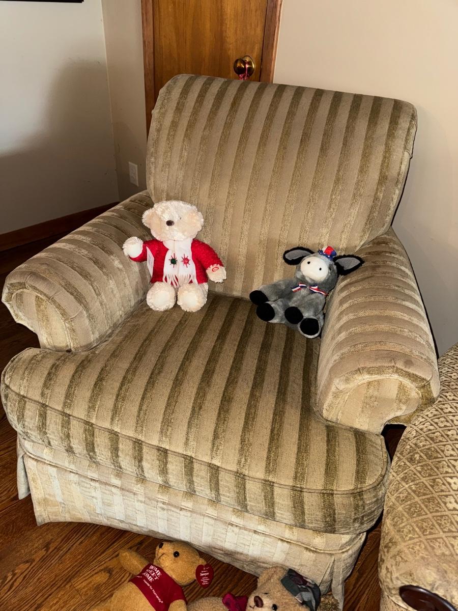 2 LIVING ROOM CHAIRS + STUFFED ANIMALS
