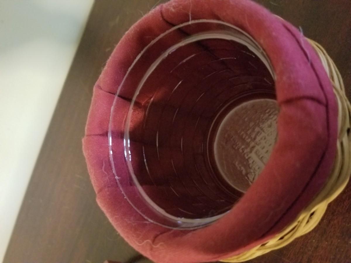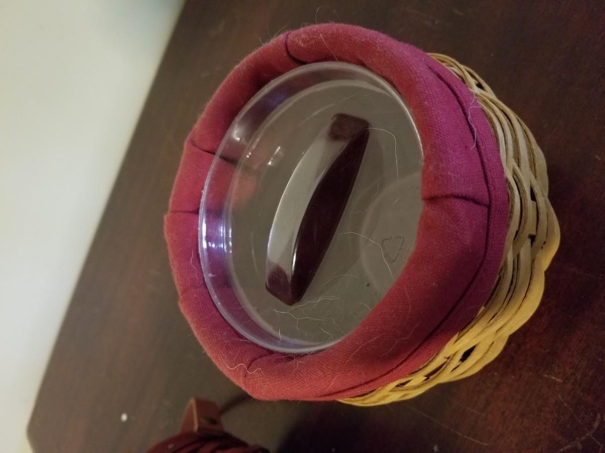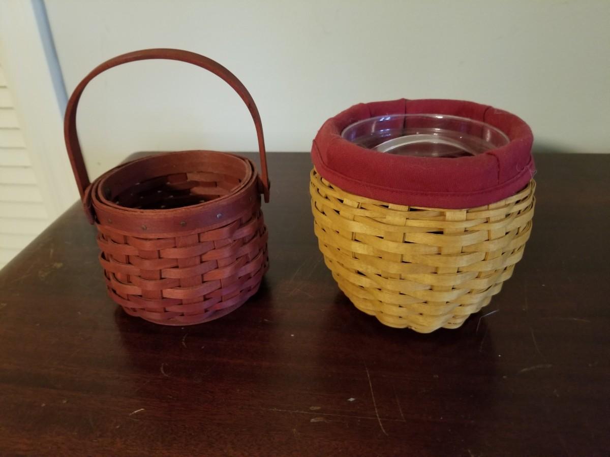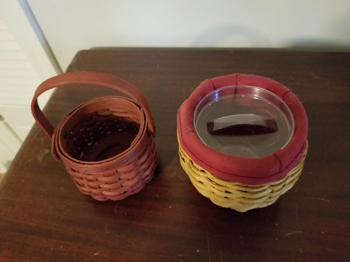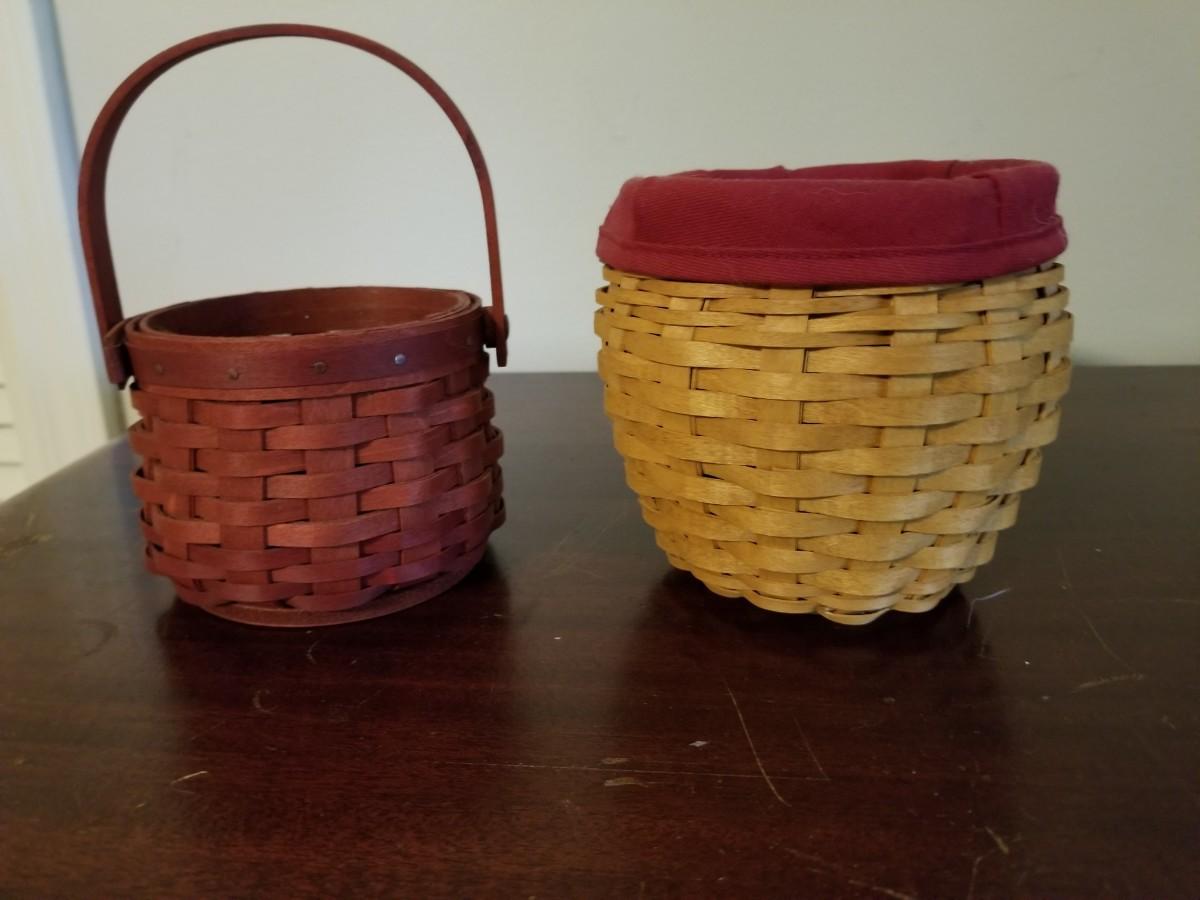 Strawberry Longaberger basket and lidded Longaberger basket with fabric liner.