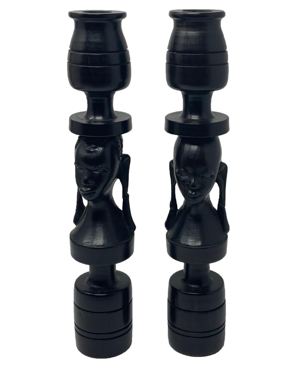 Description: 2 matching candle sticks with facial carving; Materials: Wood; Measurements: 11 3/4 x 2 1/2