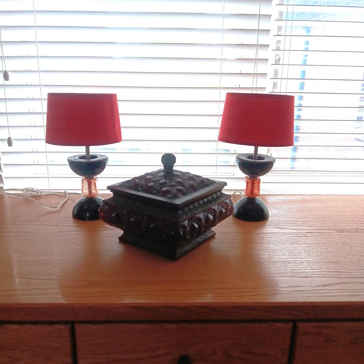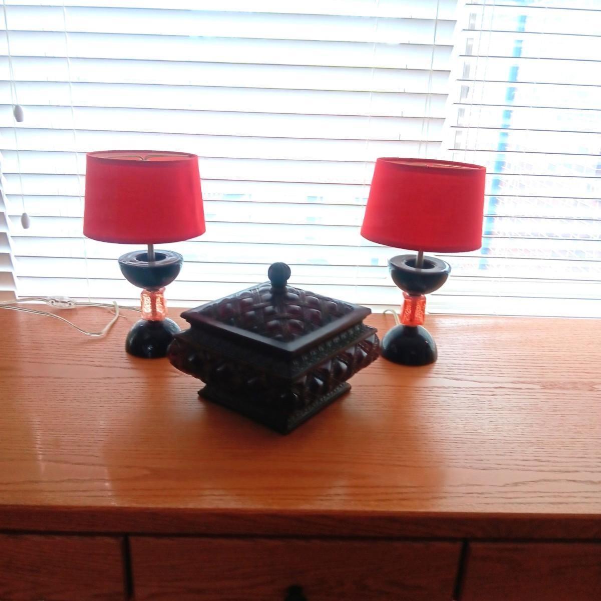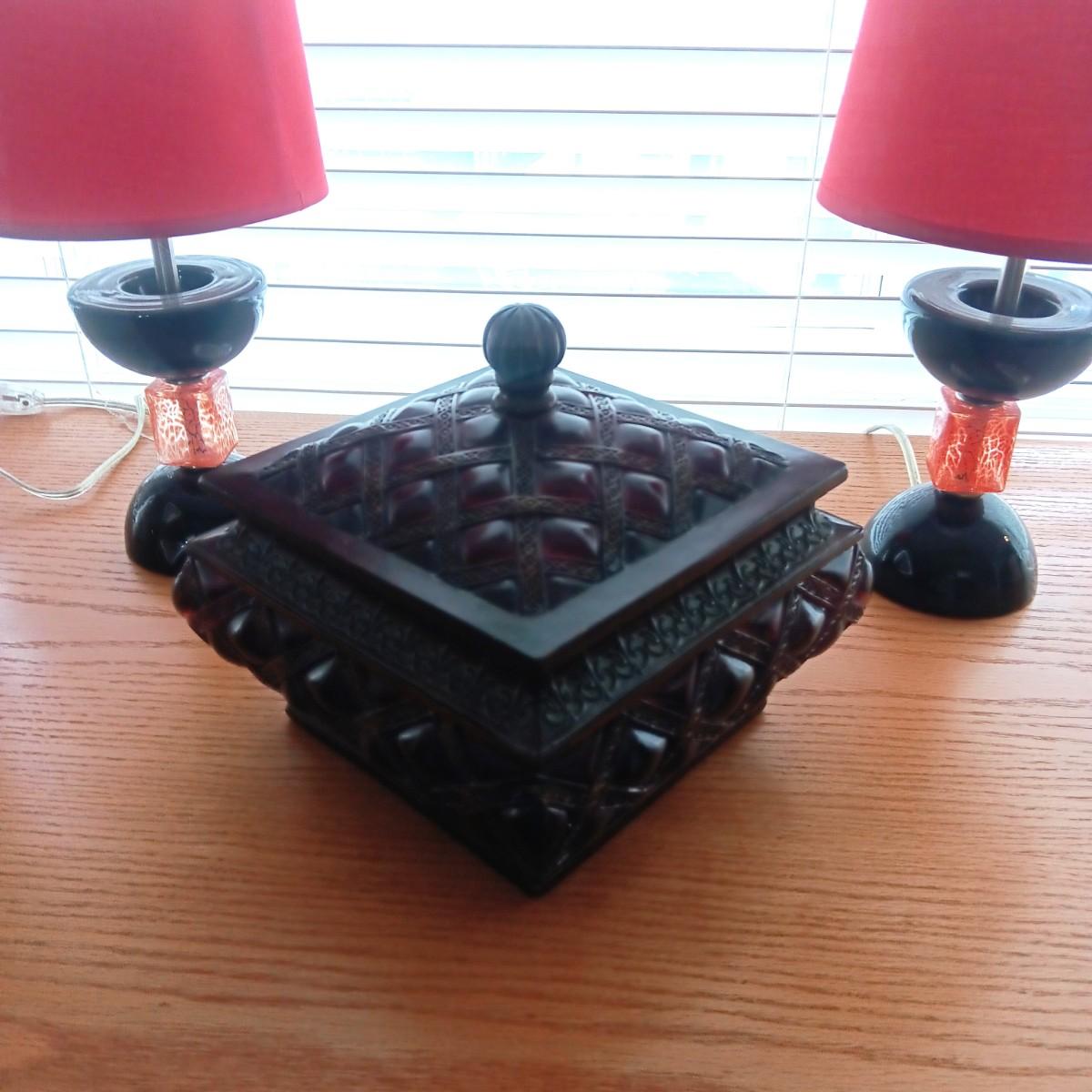 2 MATCHING GLASS BASE LAMPS AND A BOX WITH A LID