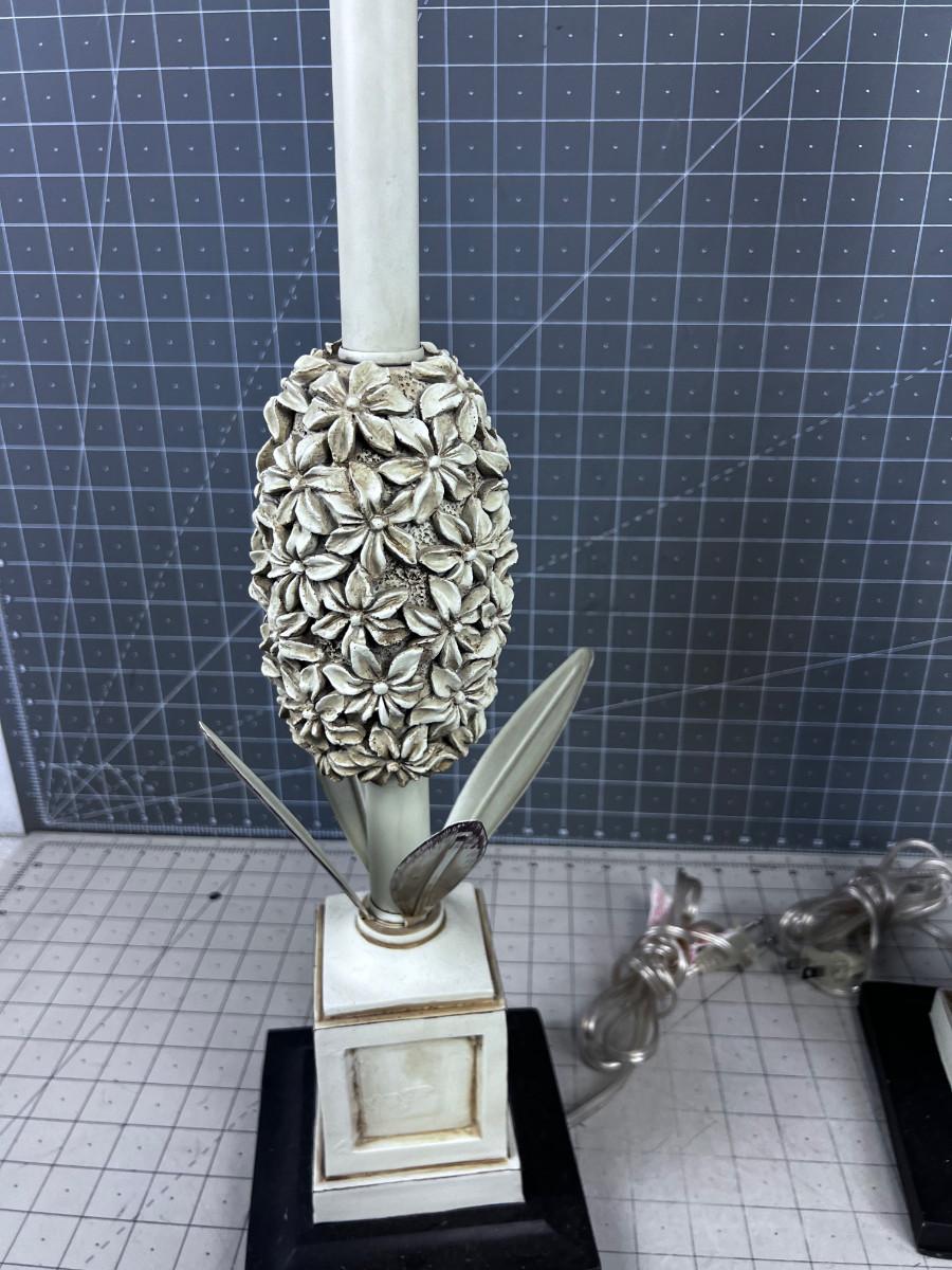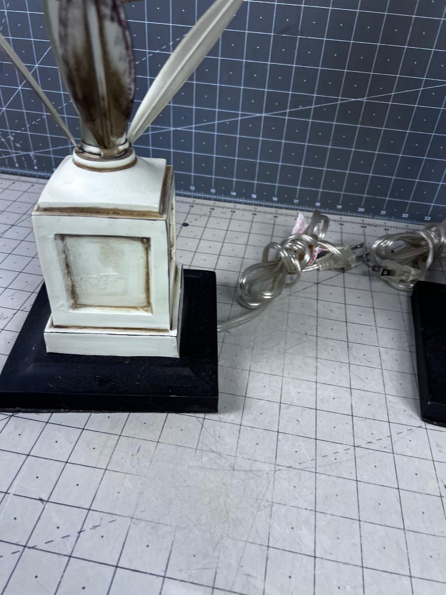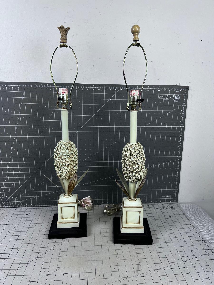 The Finials are not matching but the lamps themselves are. Good Used. Condition. 32" to the Top of the Finial.