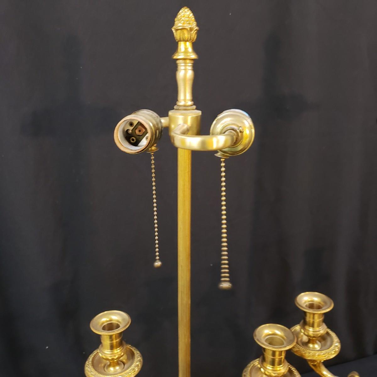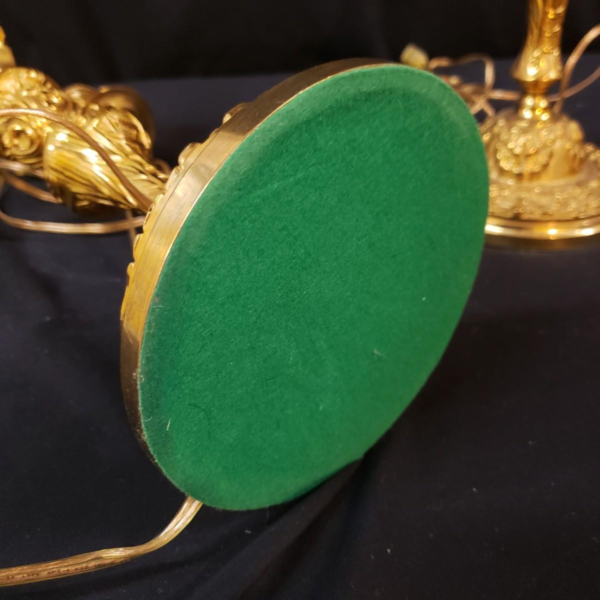These matching solid and heavy brass lamps measure 30"x7" and the middle section with the candelabra's measures 10" across. The light has a 2-way feature with pull chains for each light. There is green felt on the bottom of each lamp. The are rather heavy, so this will affect the shipping costs. Both lamps worked when plugged in. They do not come with lampshades.