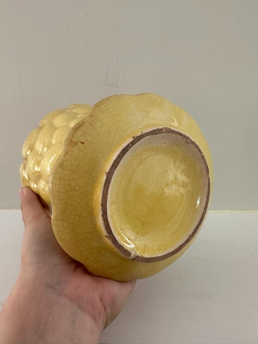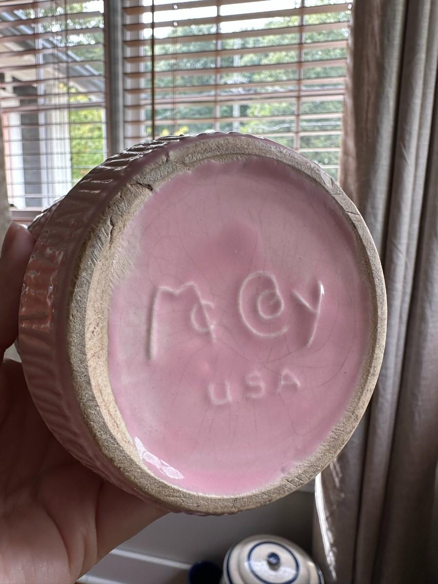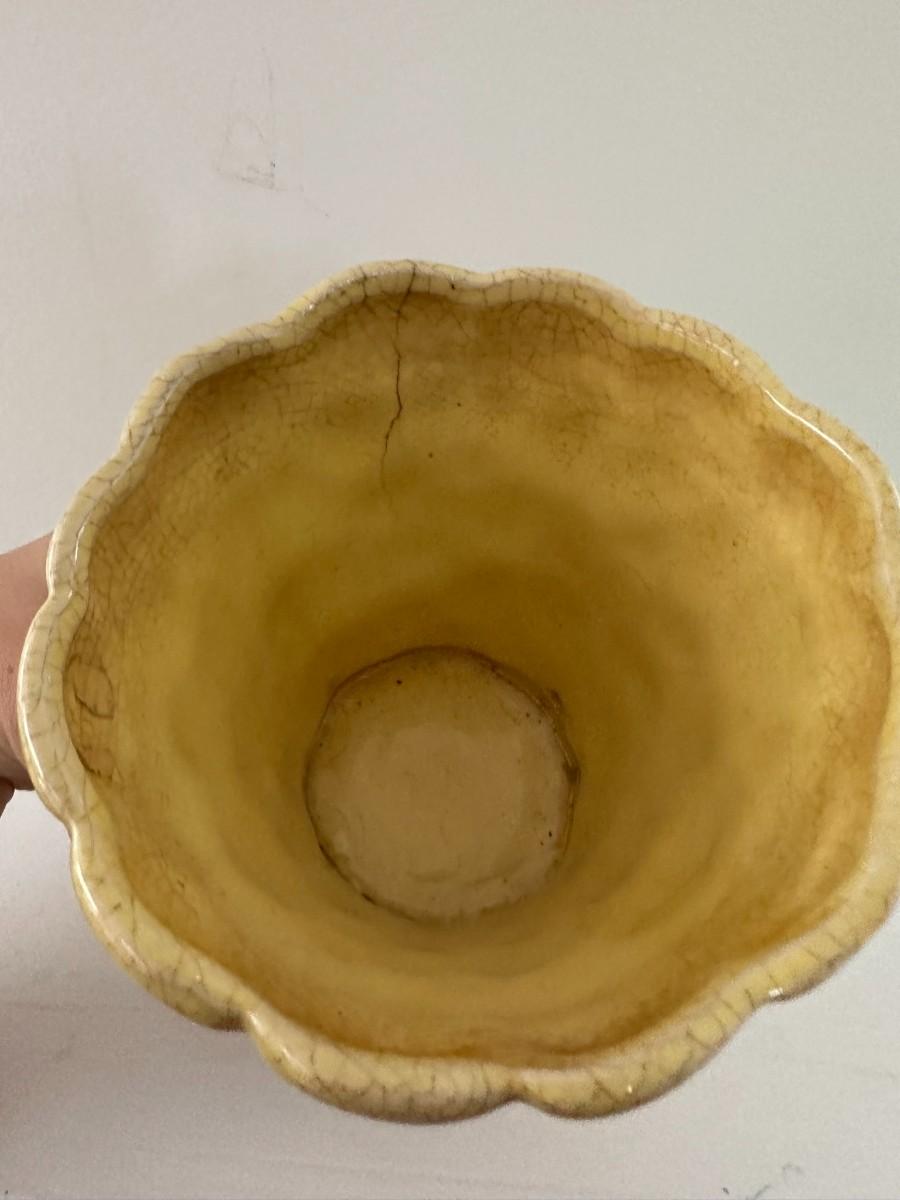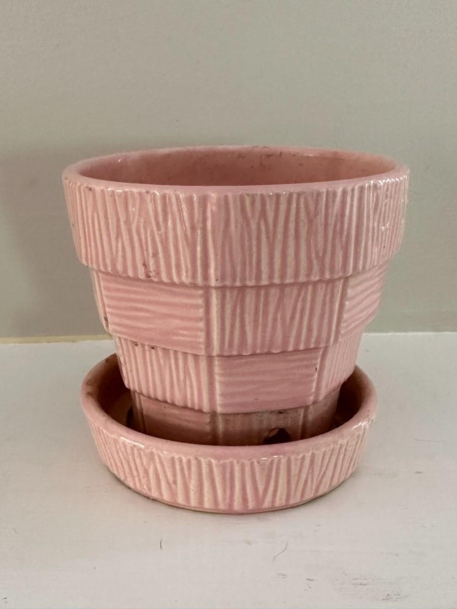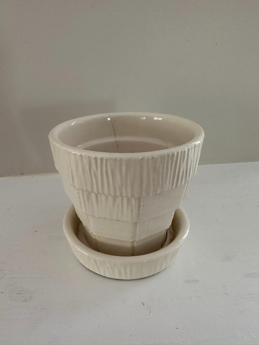 4" White McCoy Pot w/attached drainage plate, small crack on inside. 4" Pink McCoy Pot w/attached drainage plate, small crack in bottom. 5" Yellow pot with drainage plate and small crack on side.