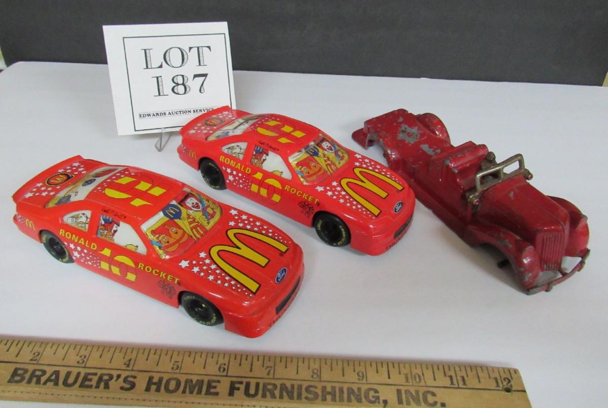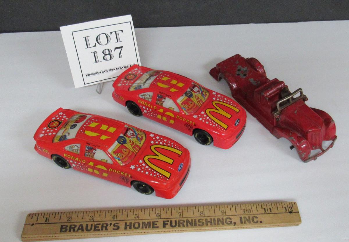 Don't know if the McDonalds cars work or not, 1992 and 1993 versions. The old metal car is for parts only - hoping someone can use the driver, windshield or tires. Shipping is available at shipping cost plus $5.00 handling fee on one box, $10.00 handling fee on two boxes, $15.00 handling fee on 3 boxes. Helps cover shipping materials and labor cost.