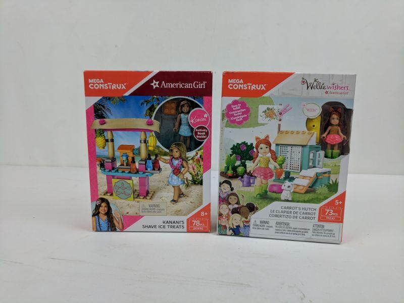 2 Mega Construx, Wellie Wisher American Girl Willa/Carrots Hutch, American Girl Kanani/Shave Ice Treats - New