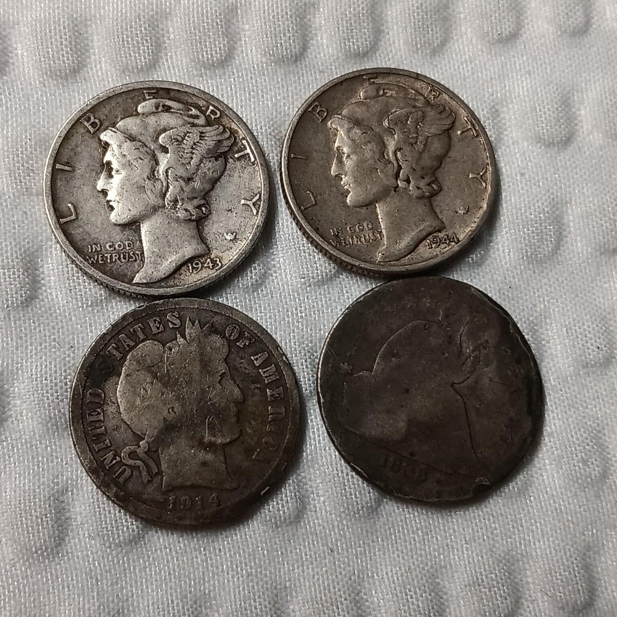 2 MERCURY DIMES, 1 BARBER DIME AND AN EARLY DIME