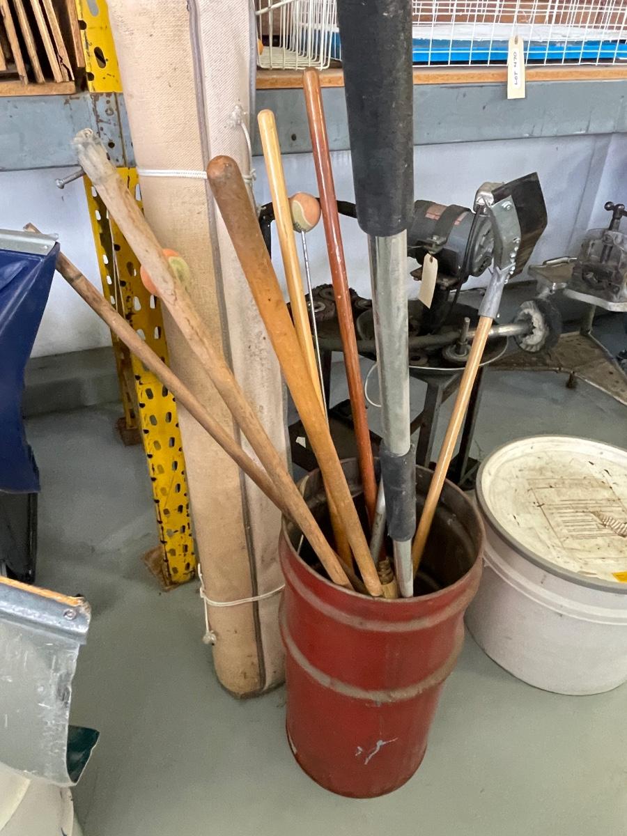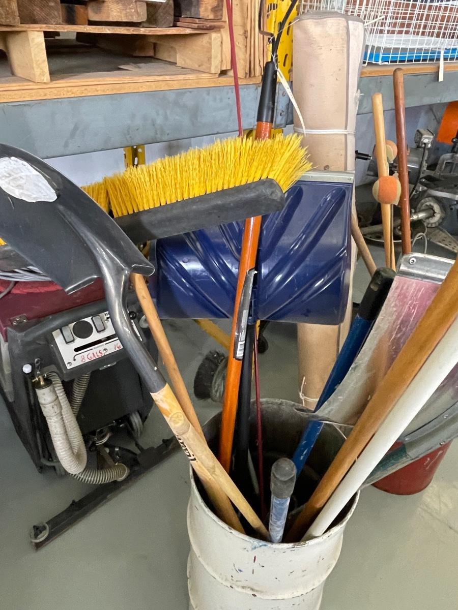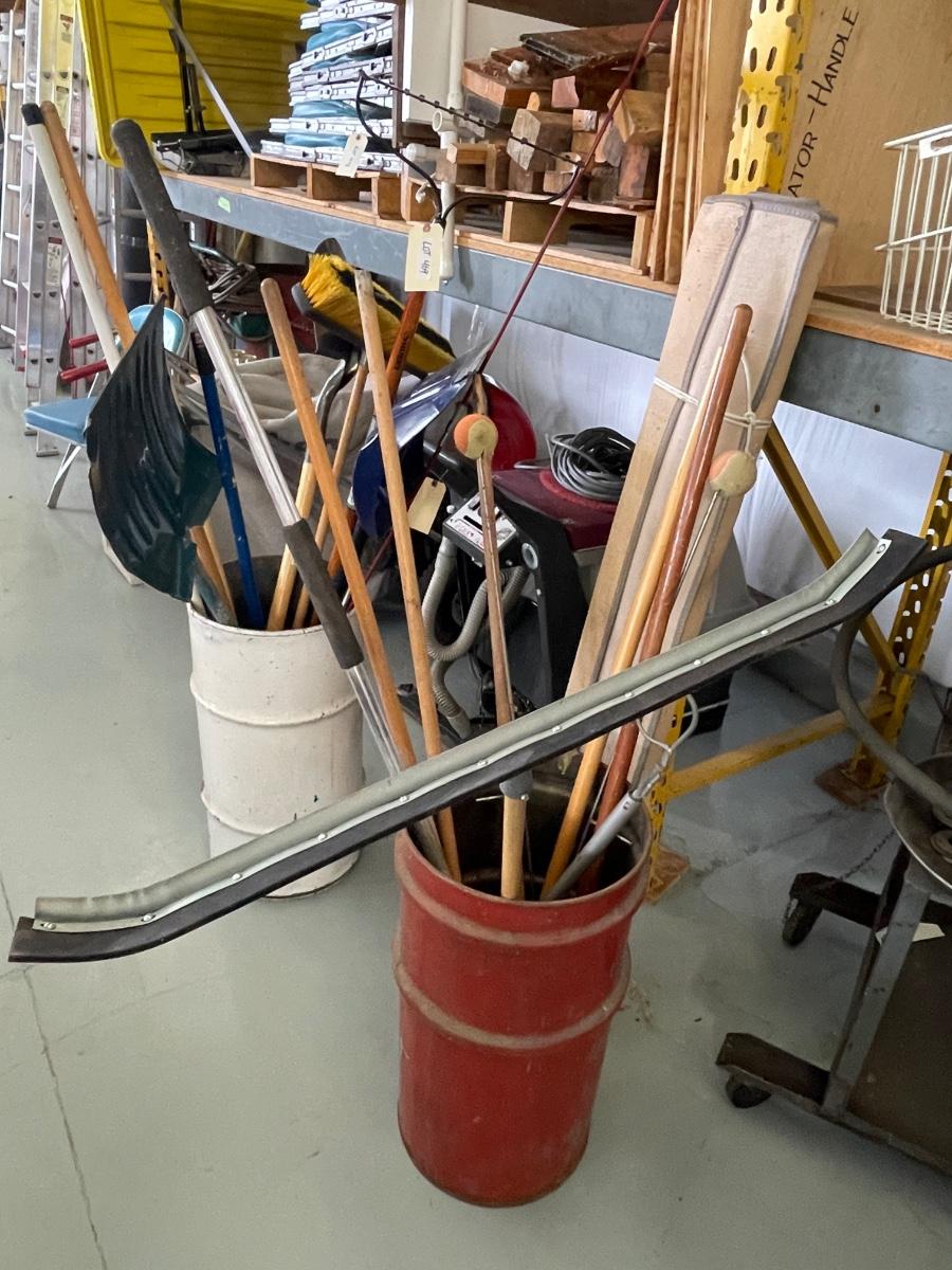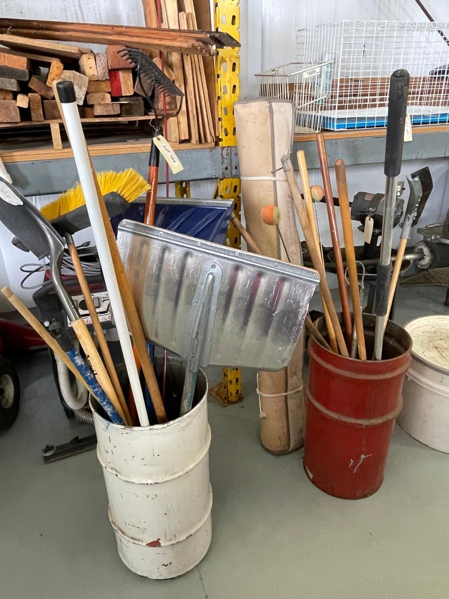 2 Metal Drums with outdoor Tools/Squeegies/extension poles/Snow Shovel