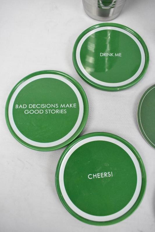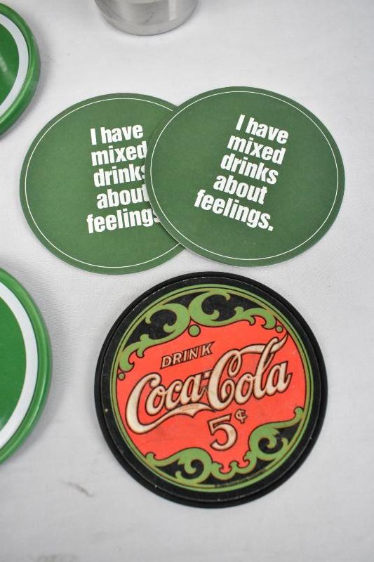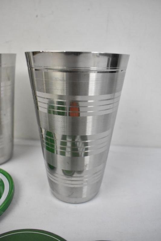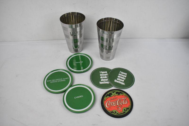 2 Metal Glasses, 3 Glass Coasters, 3 Cardboard Coasters