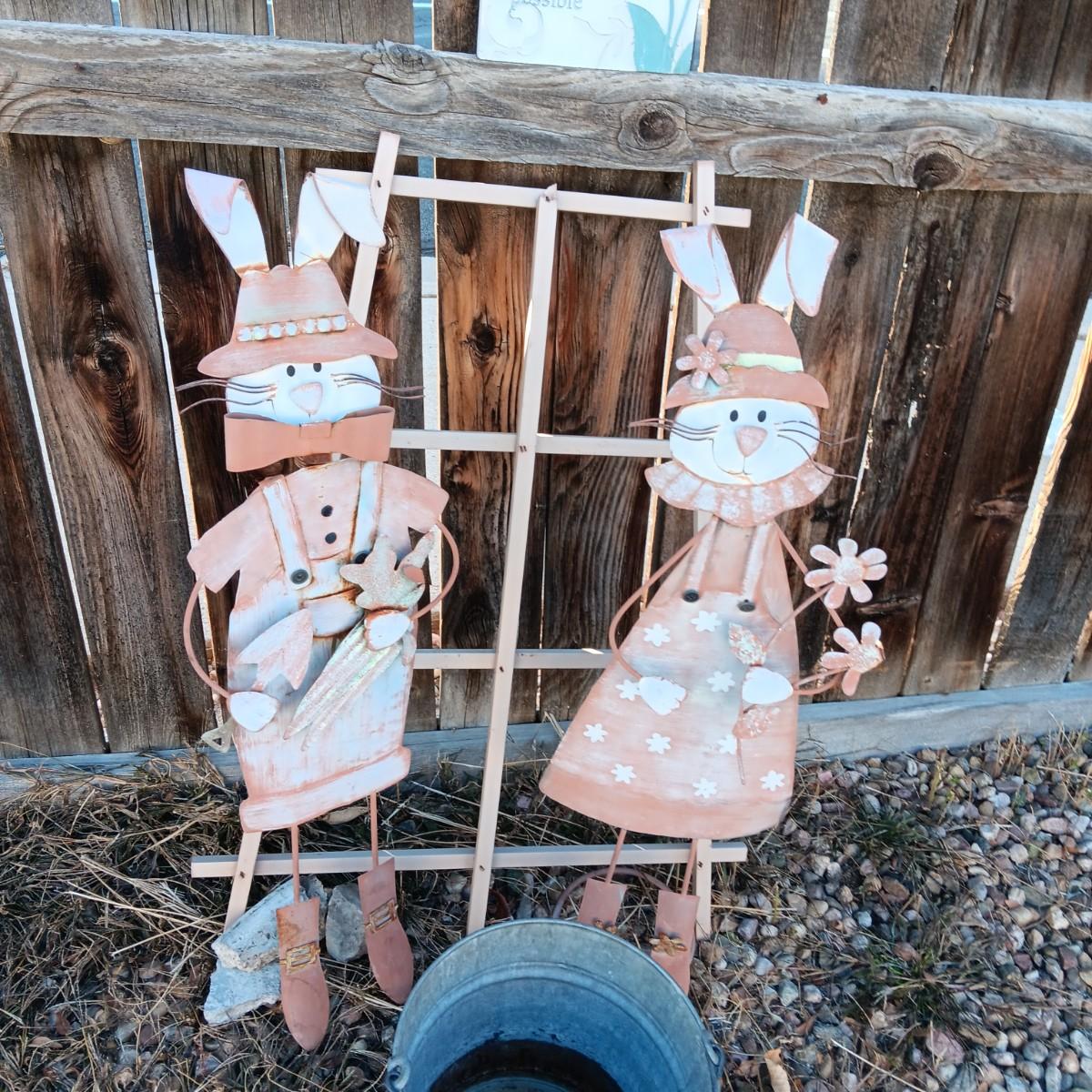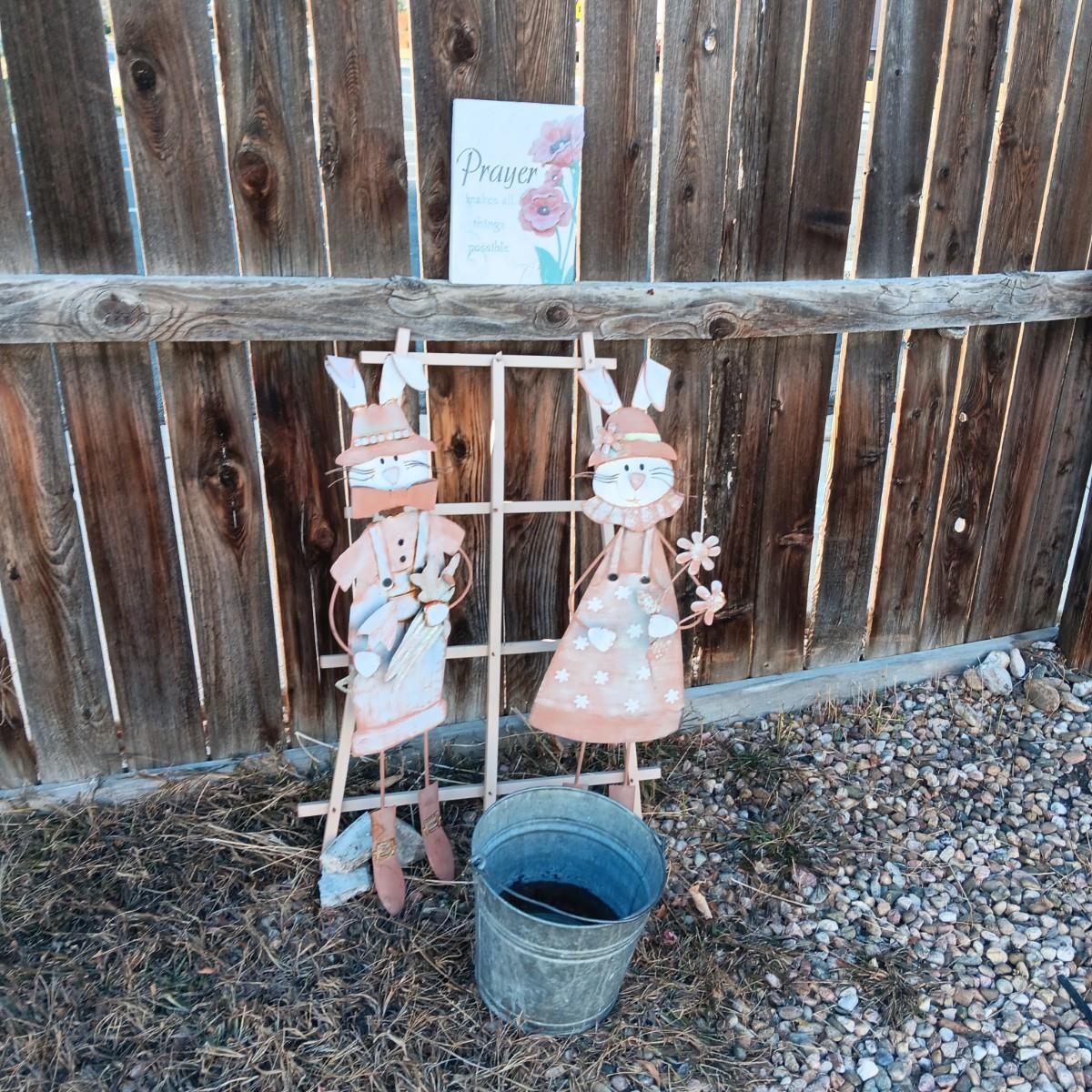 2 METAL STAKED YARD RABBITS, GALVANIZED BUCKET AND WALL HANGING