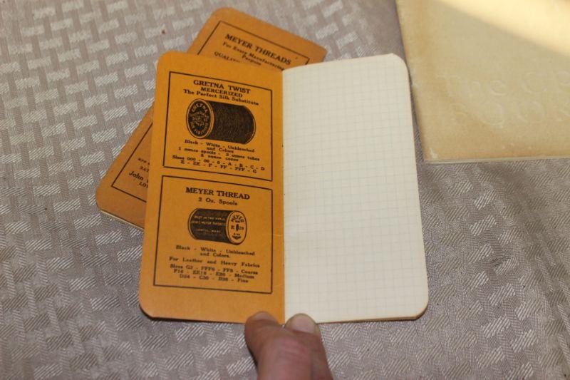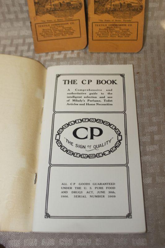 Pair of Meyer Threads Advertising Grid Notepads from 1941. The CP Book is a 1908 catalog from California Perfumes. All are in great condition.