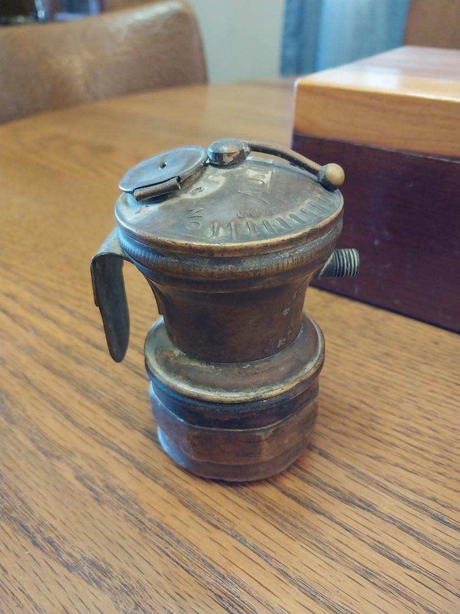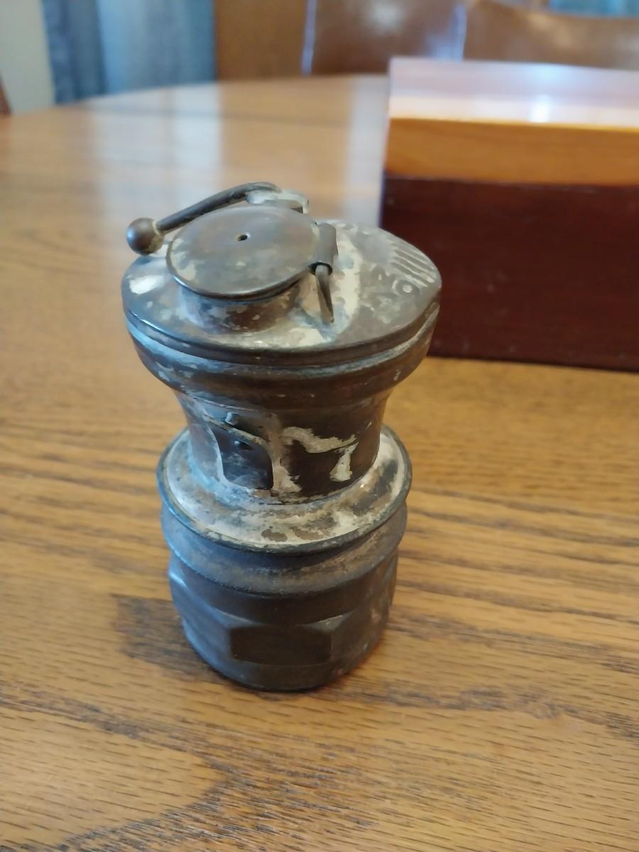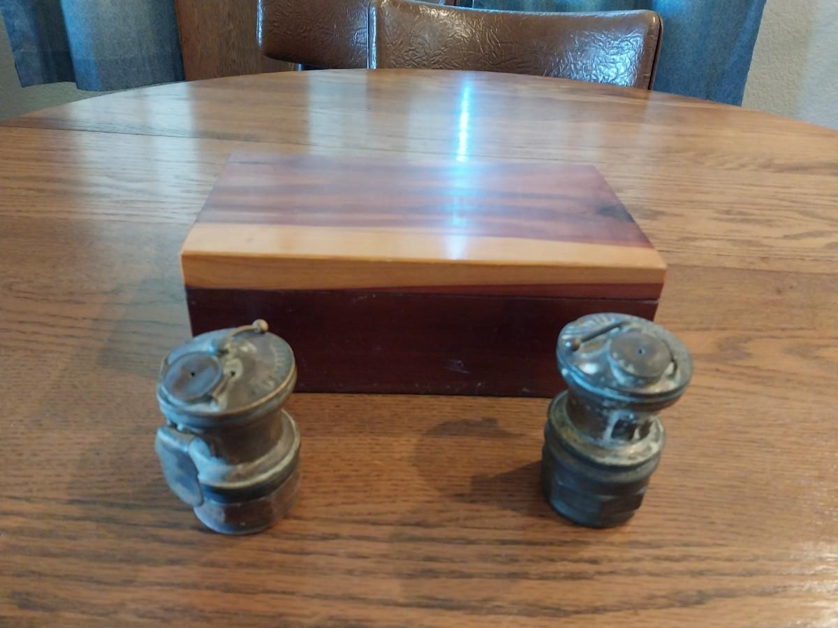 2 MINERS CARBIDE LAMPS AND A CEDAR BOX