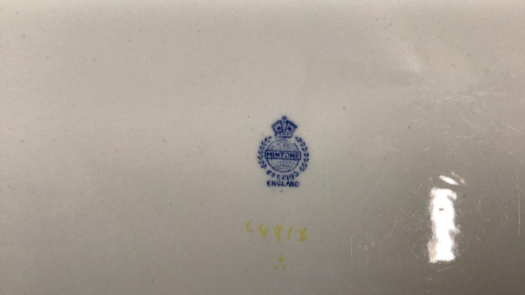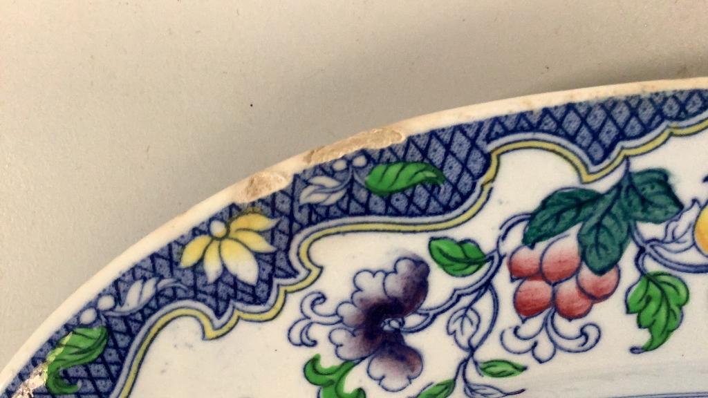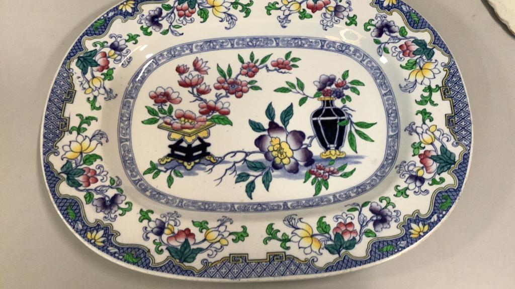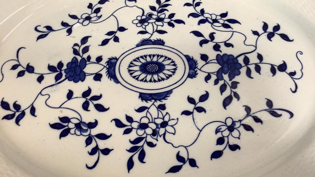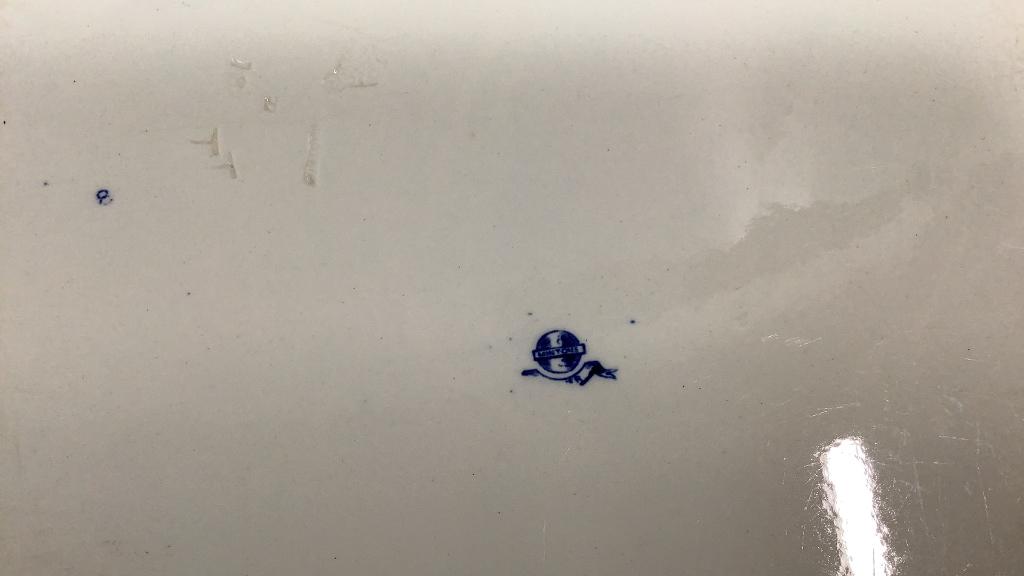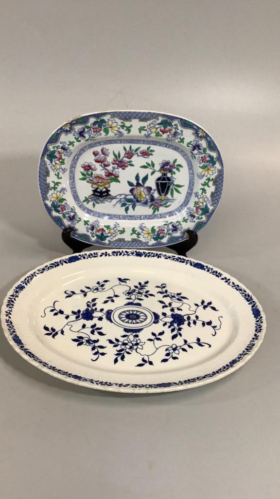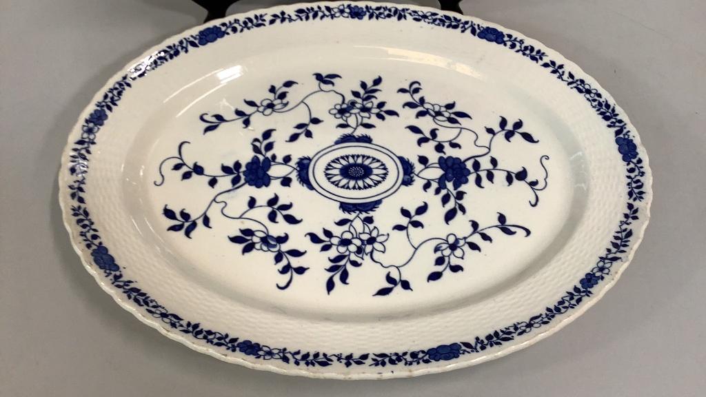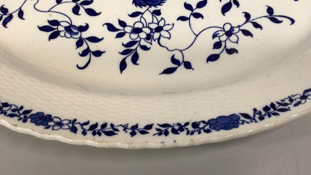 17 inch with cobalt blue design, basket weave borderÂ…13 inch platter with Asian designs on a white ground * minor rim chip