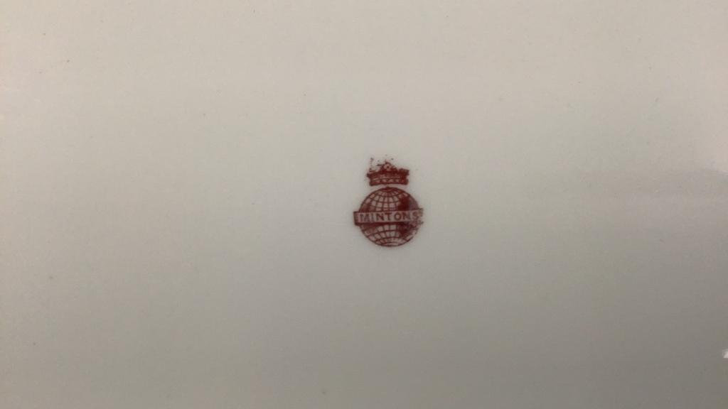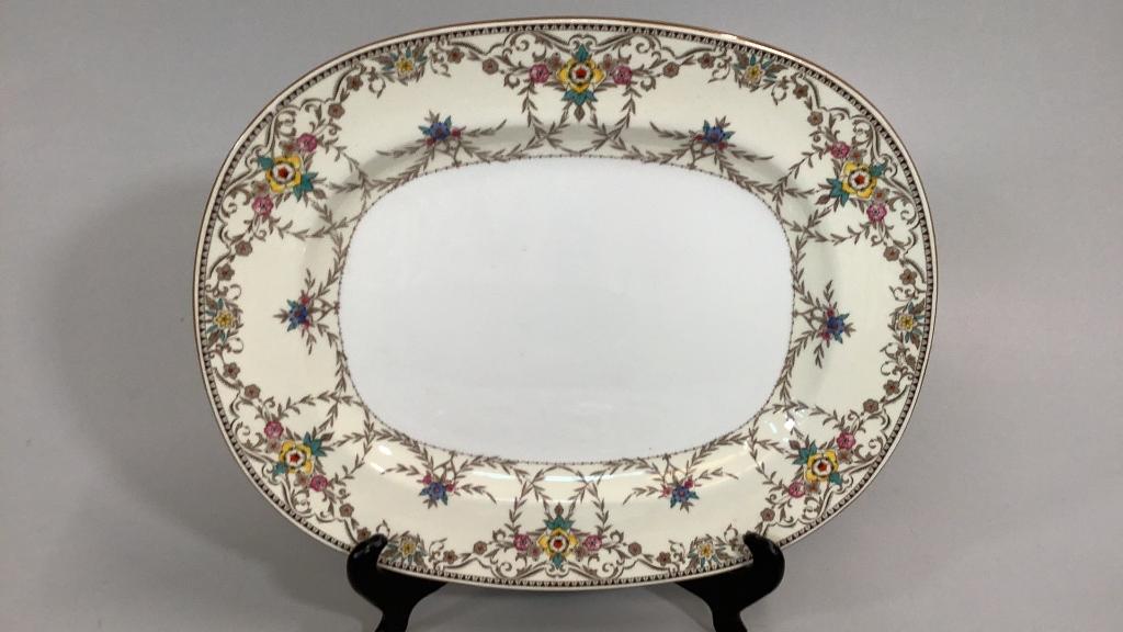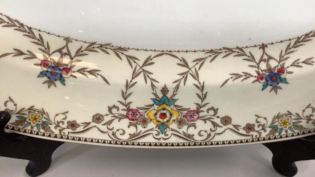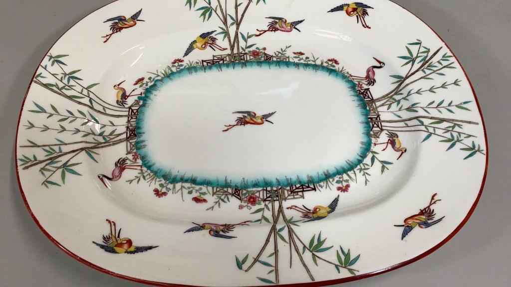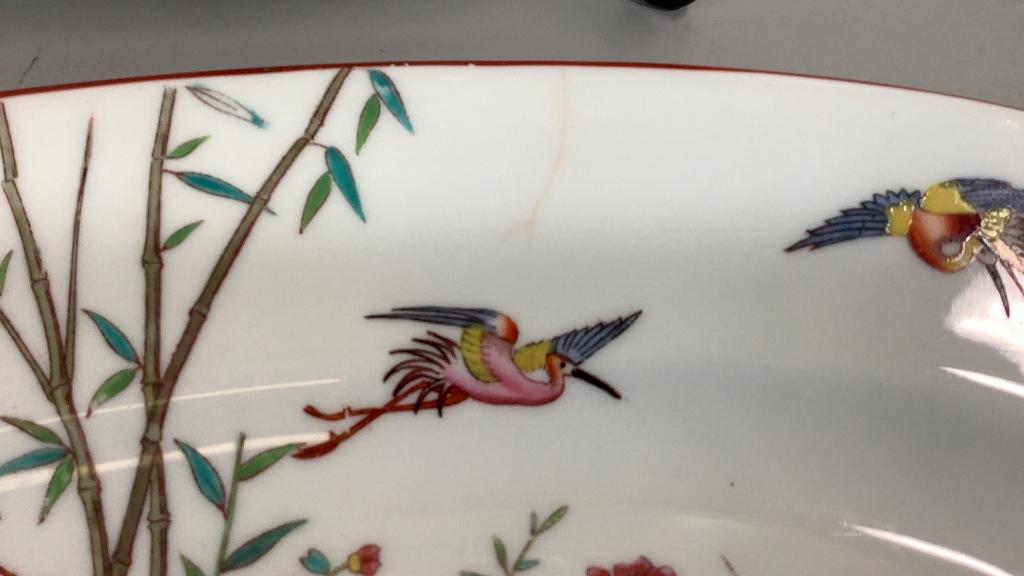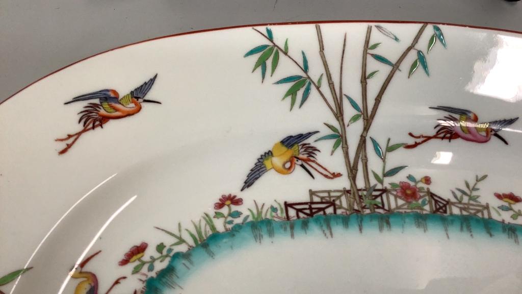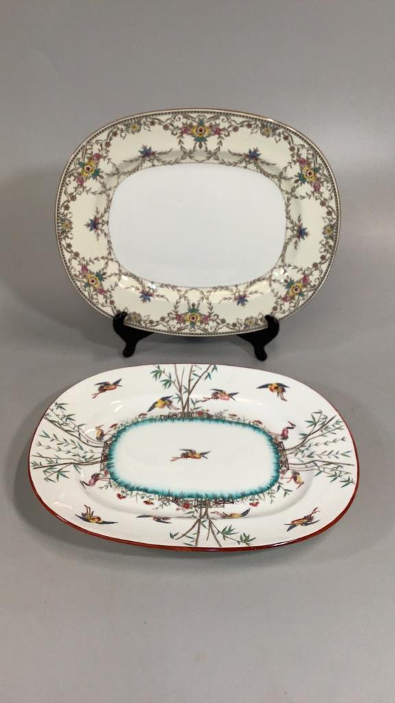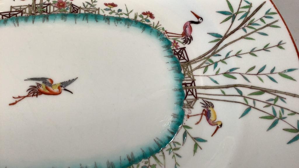 15 inch Wilmington pattern with foliate and floral on a cream ground, brown rim..15 inch Platter with a bamboo and crane design..multi colors with a center oval in teal * small hairline upper rim