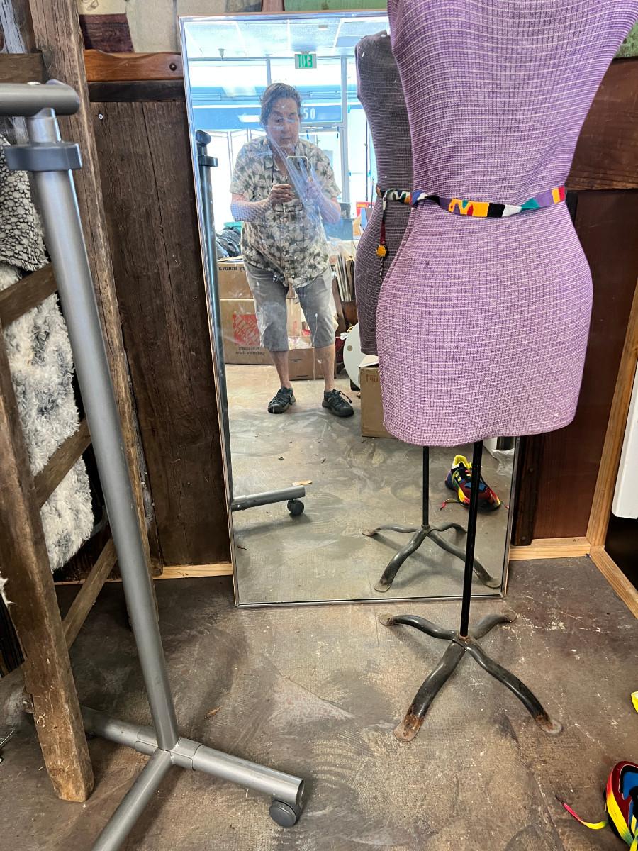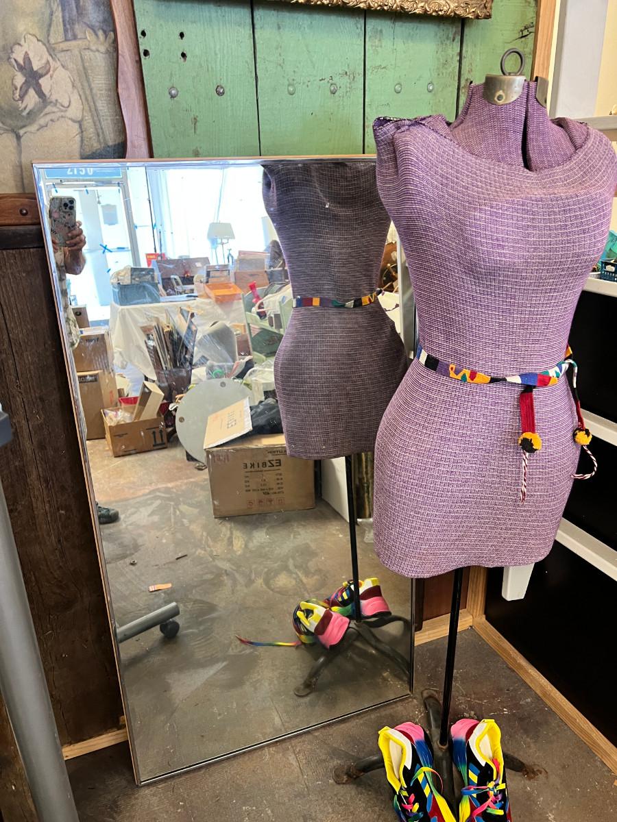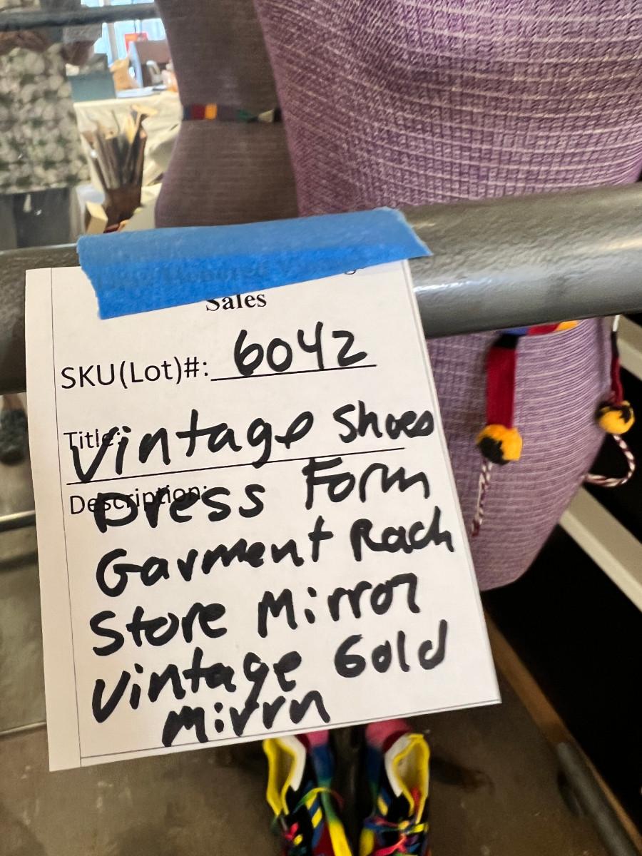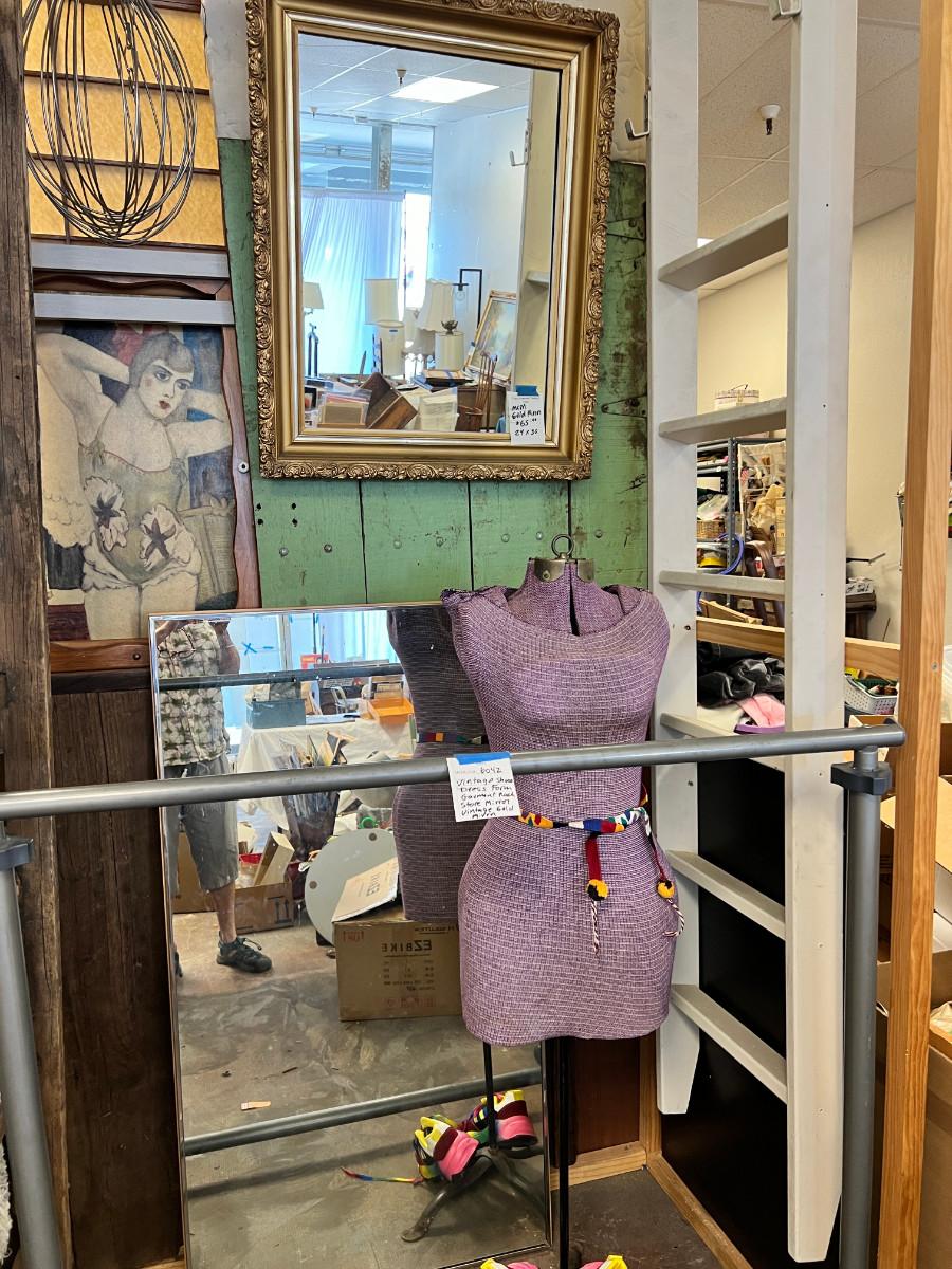 This is taken in the store display I made out of recycled wood. The green panel, bathing beauty, and large industrial mixer are not part of this auction. You get a True shape "adjustable" mannequin. in vintage condition great for display. 1 Large rectangular store vertical wall mirror, very heavy, 1 vintage framed mirror gold, portable garment rack which breaks into 2 pieces. 1 pair of shoes bright rainbow size 8. They say "41" but they are small on my size 8.5 foot, worn once. No Shipping.