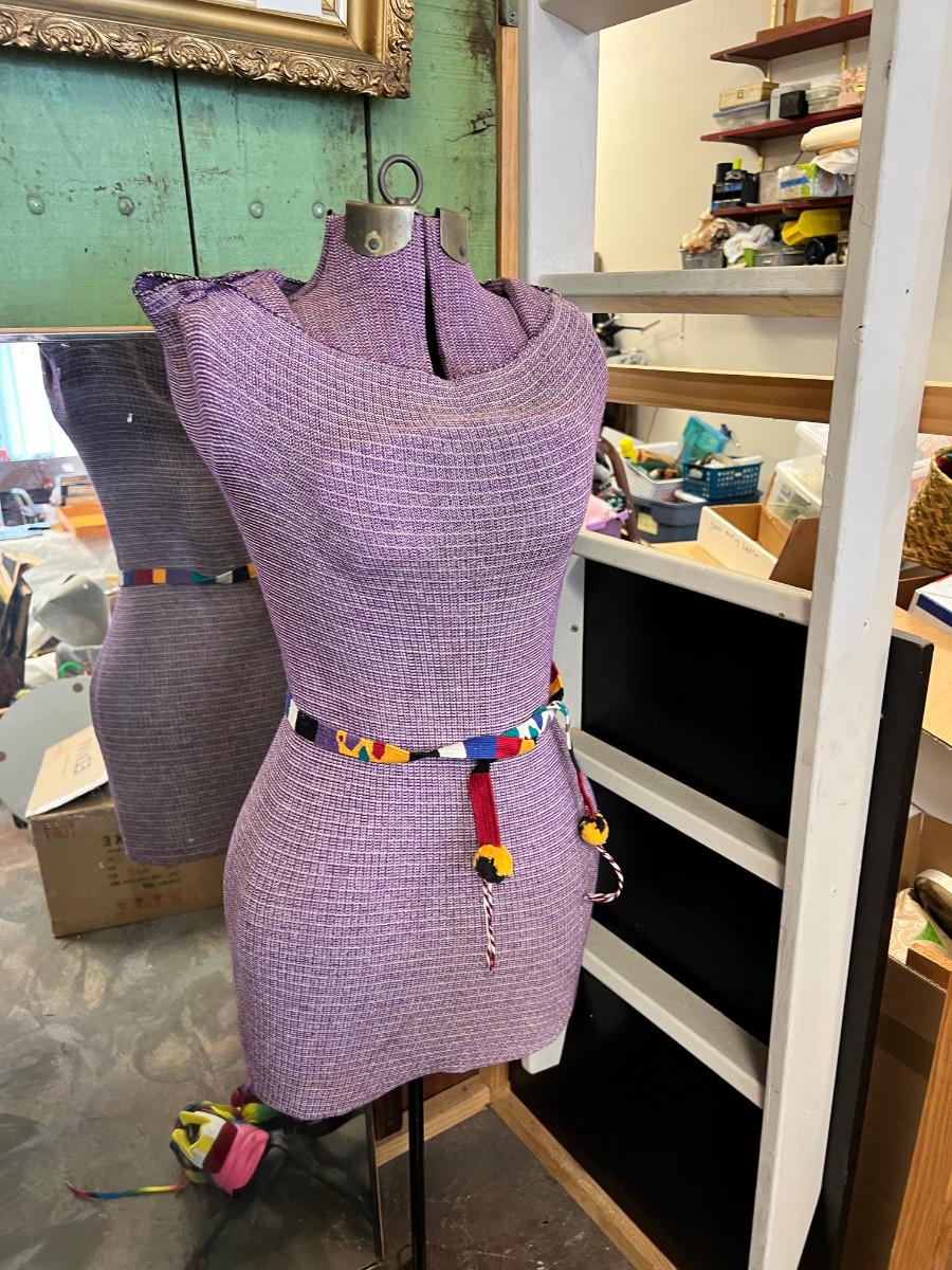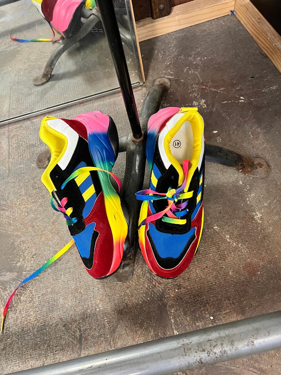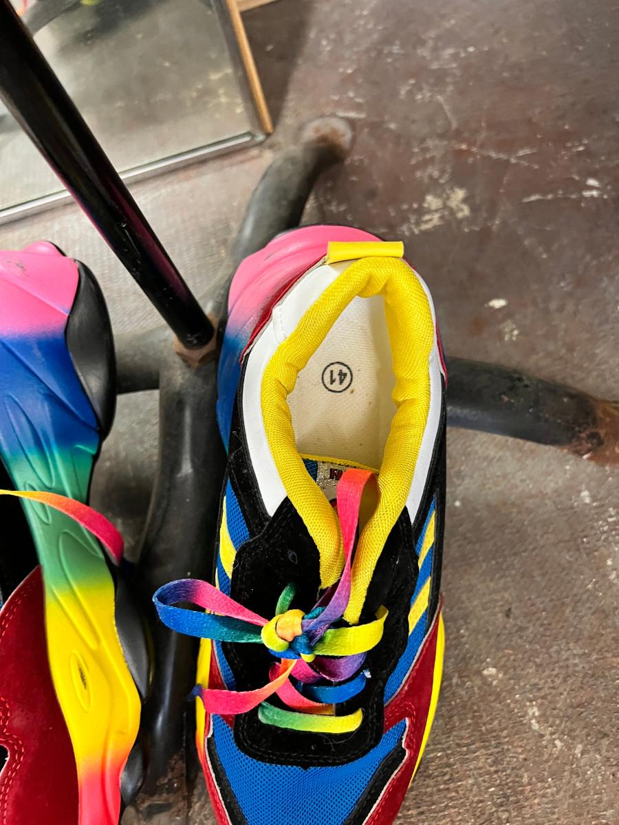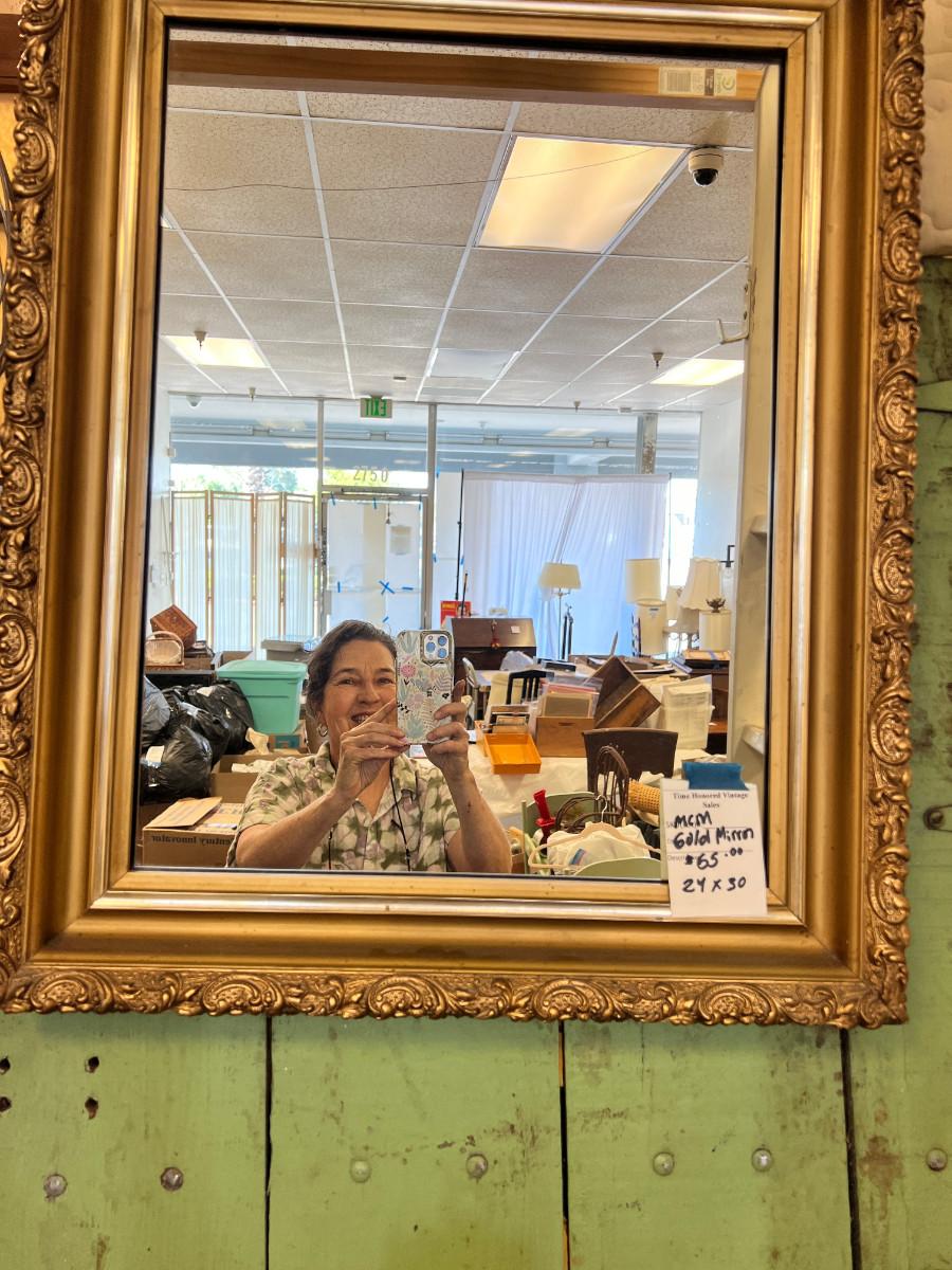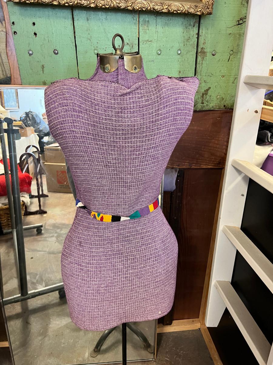 This is taken in the store display I made out of recycled wood. The green panel, bathing beauty, and large industrial mixer are not part of this auction. You get a True shape "adjustable" mannequin. in vintage condition great for display. 1 Large rectangular store vertical wall mirror, very heavy, 1 vintage framed mirror gold, portable garment rack which breaks into 2 pieces. 1 pair of shoes bright rainbow size 8. They say "41" but they are small on my size 8.5 foot, worn once. No Shipping.