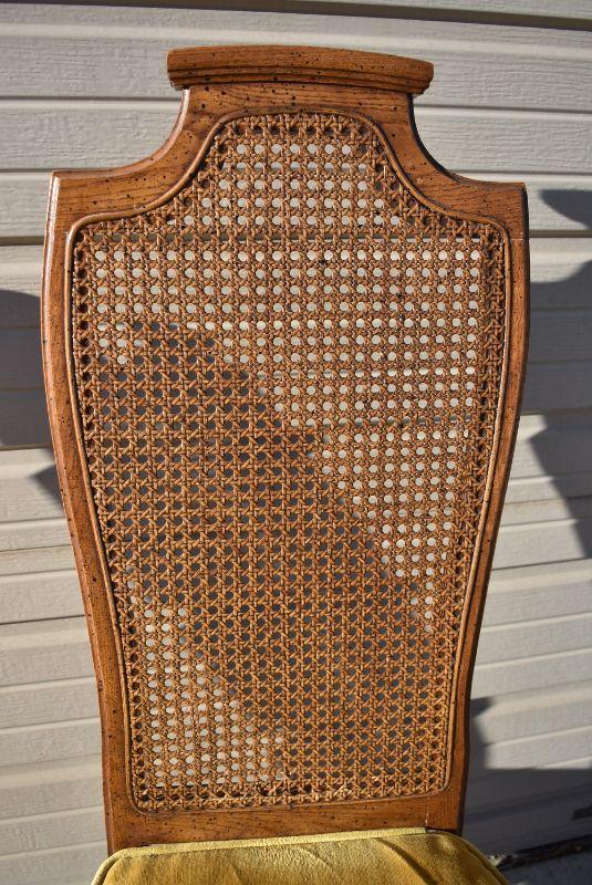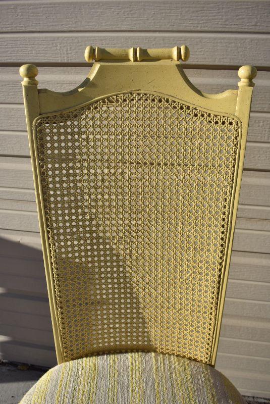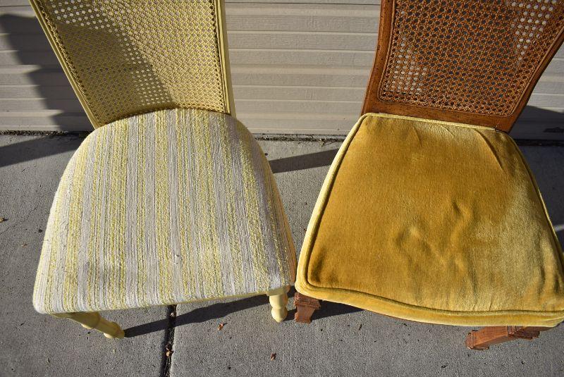 2 Mismatched Rattan Dining Chairs, Cream, Brown w/ Mustard Seat. Vintage