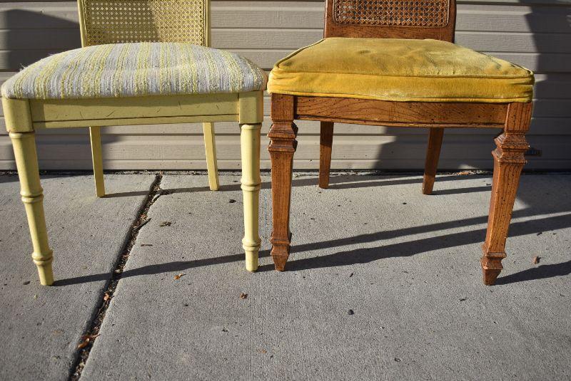 2 Mismatched Dining Chairs, Cream with Striped Seat, Brown Wood with Mustard Seat. Vintage