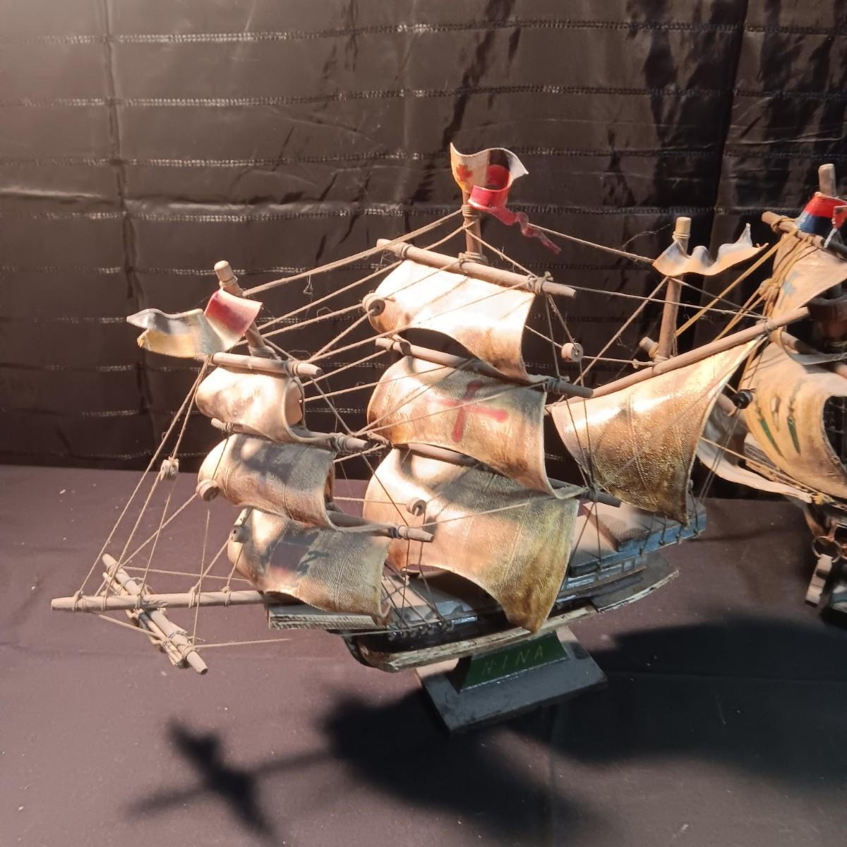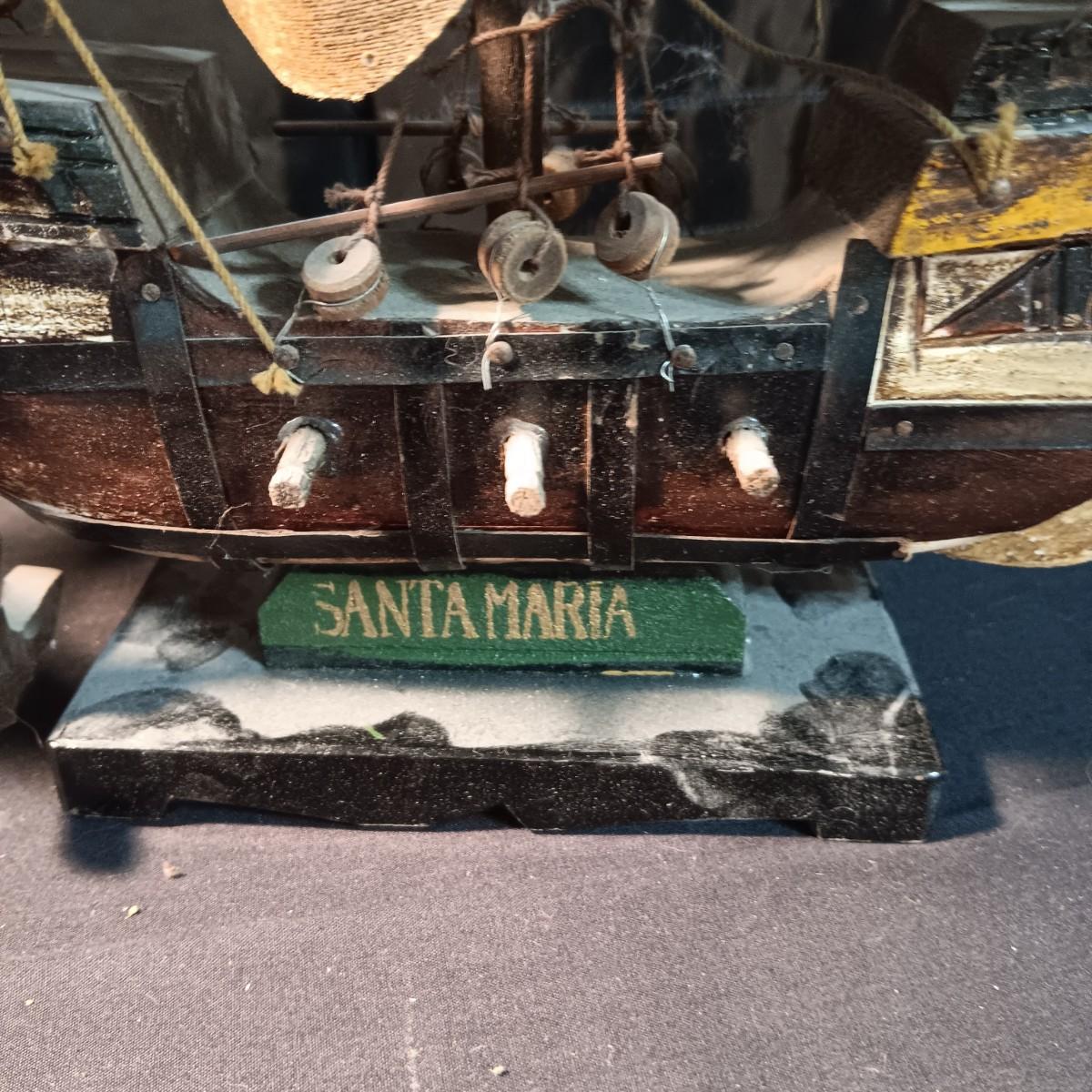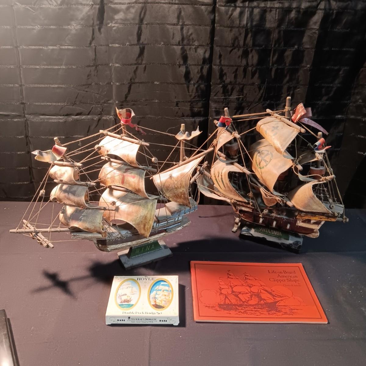 2 MODEL SHIPS "NINA AND SANTA MARIA", PLAYING CARDS, HINGED LID TIN AND A BOOK
