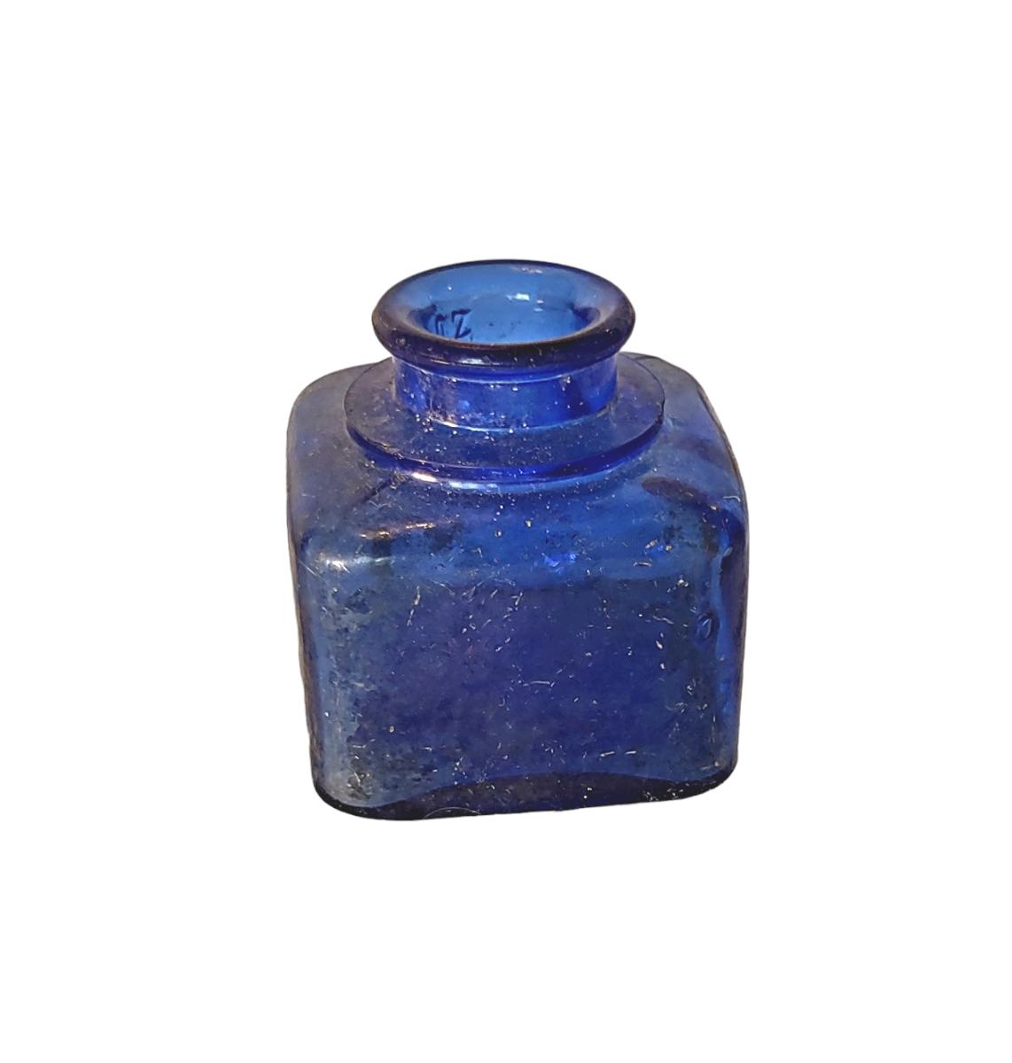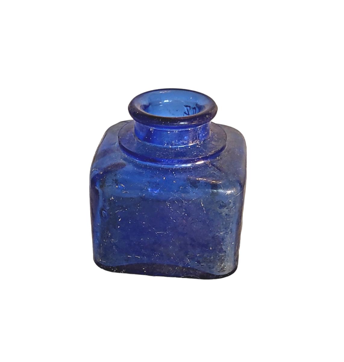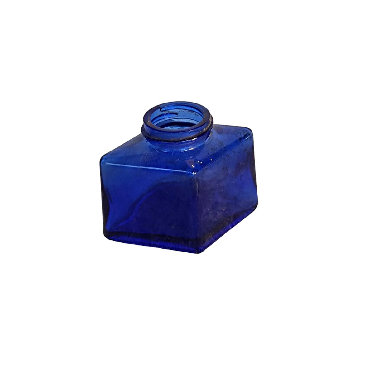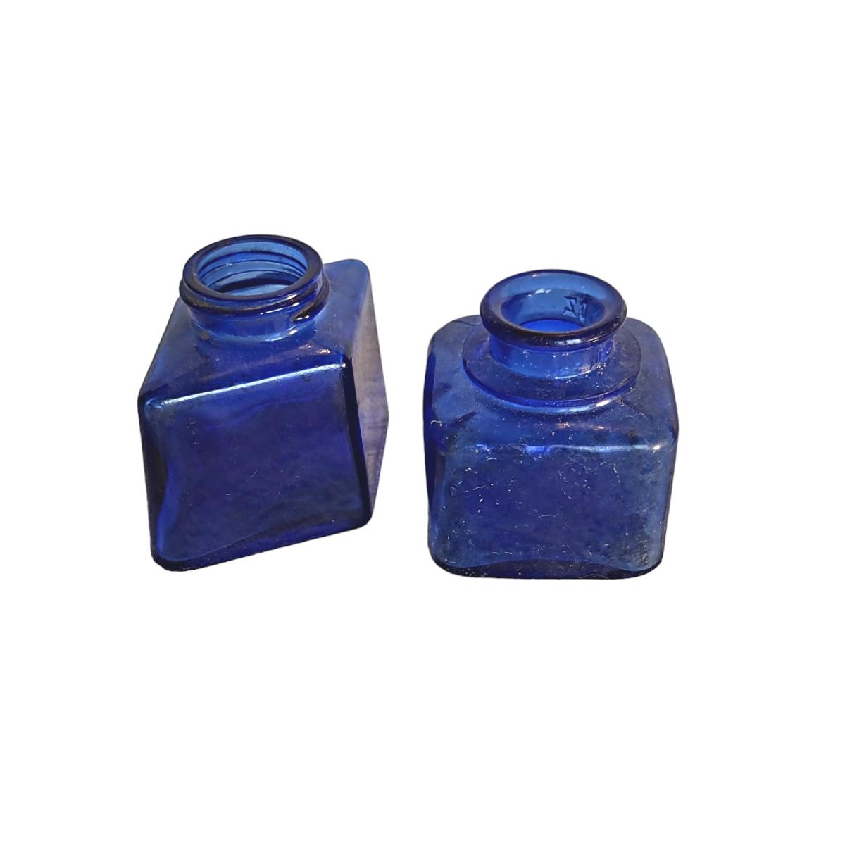 2. Vintage Cobalt Blue Glass Rounded Square Inkwell - 2.5"H x 2"W - Marked "2 OZ" on the Neck