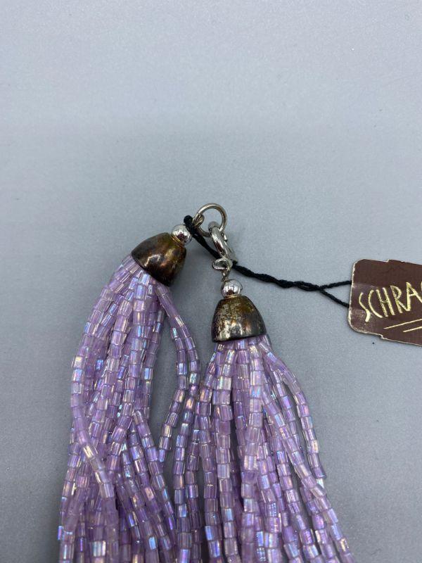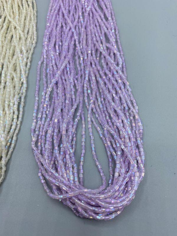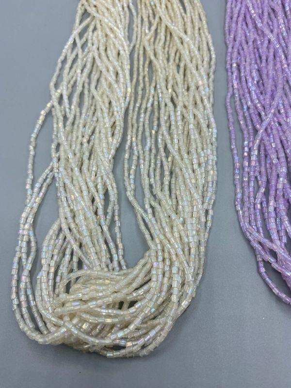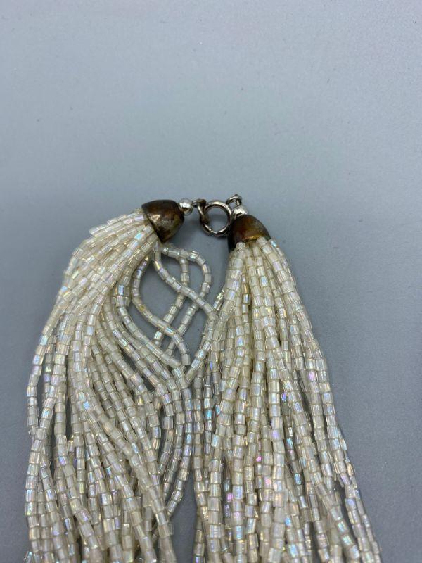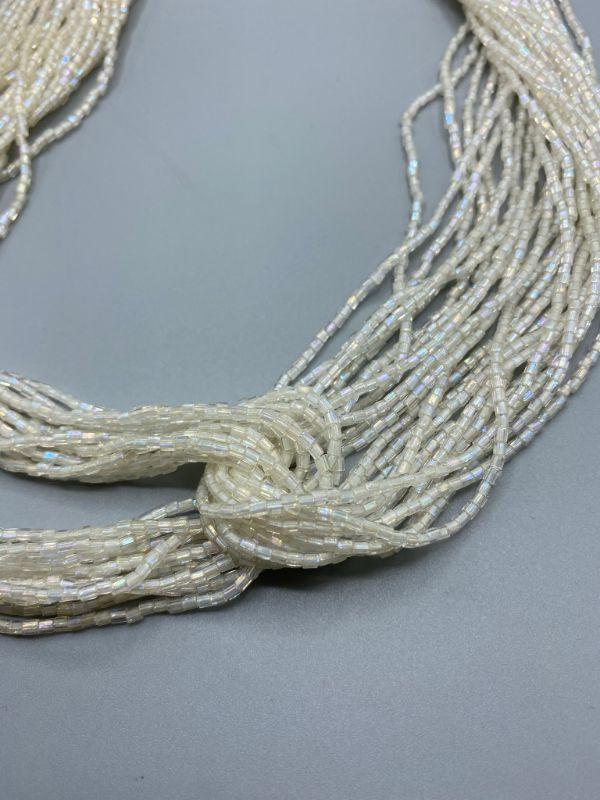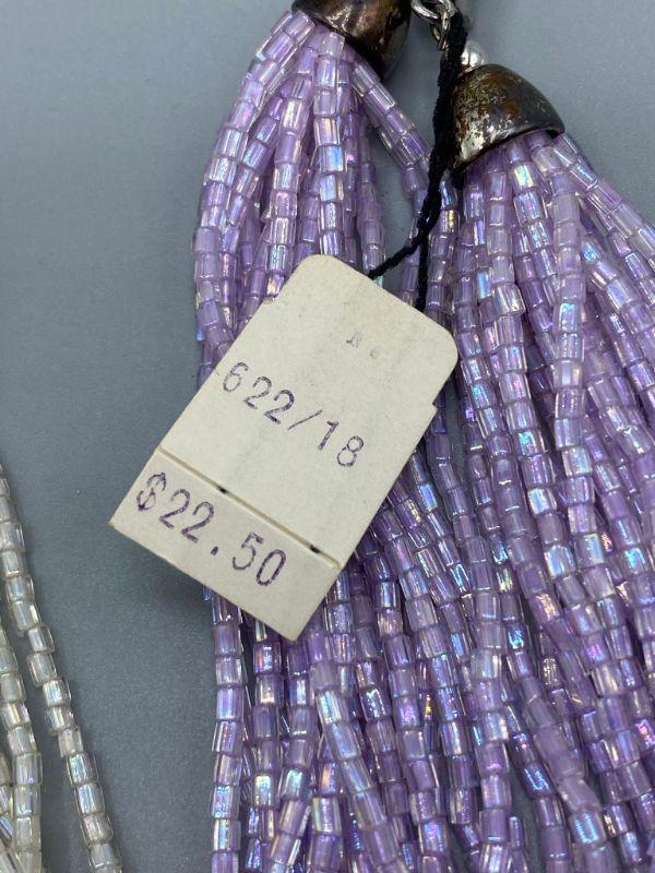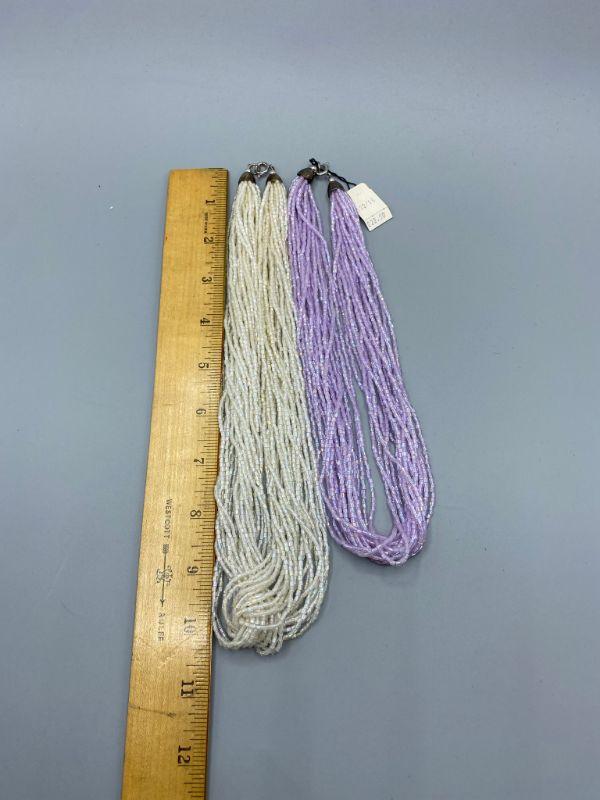 2 multistrand seed bead necklaces. One has original tag attached. One is pearlized white, the other light purple.