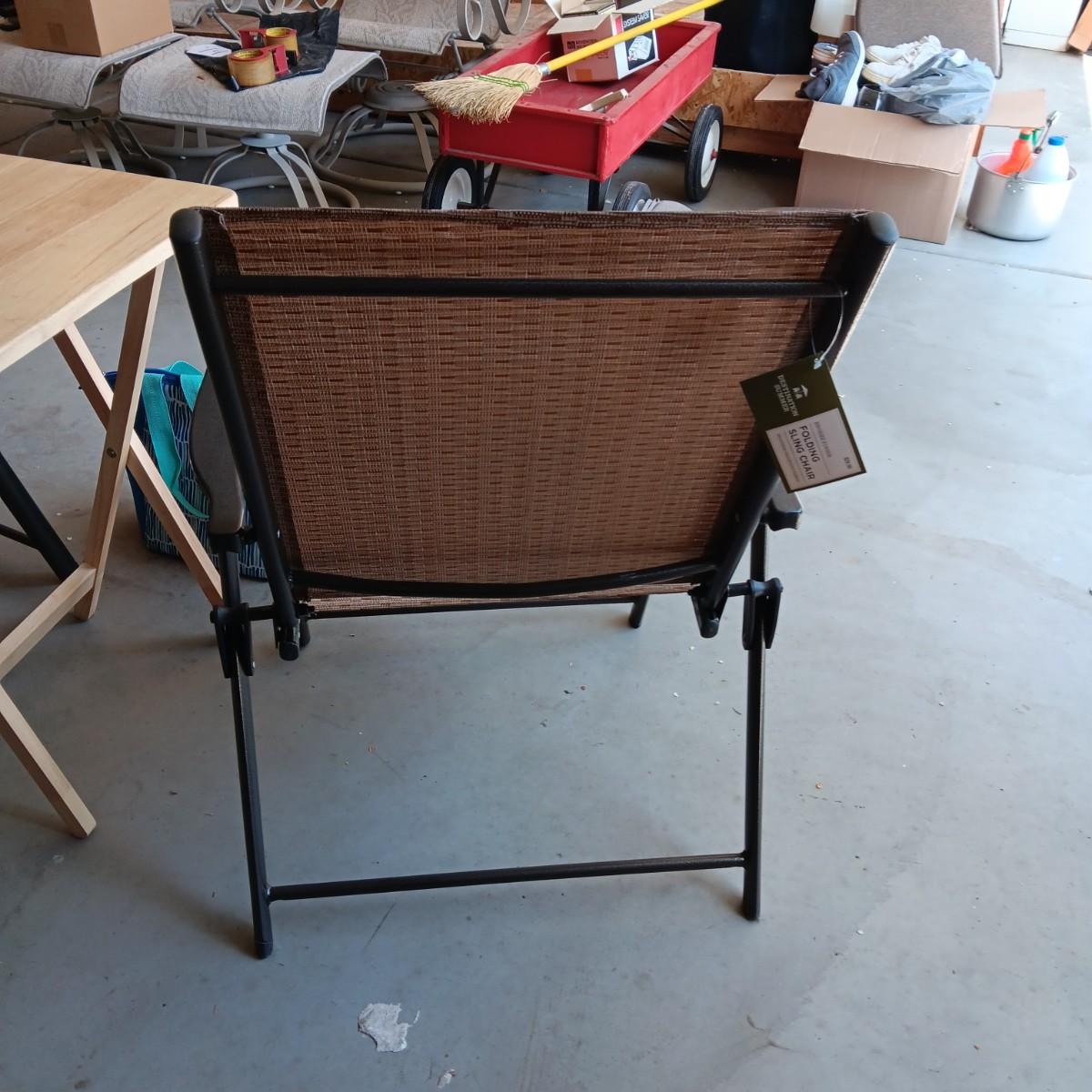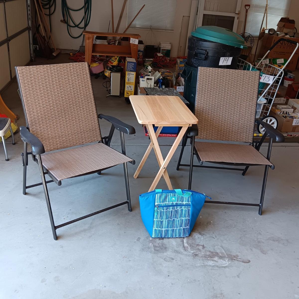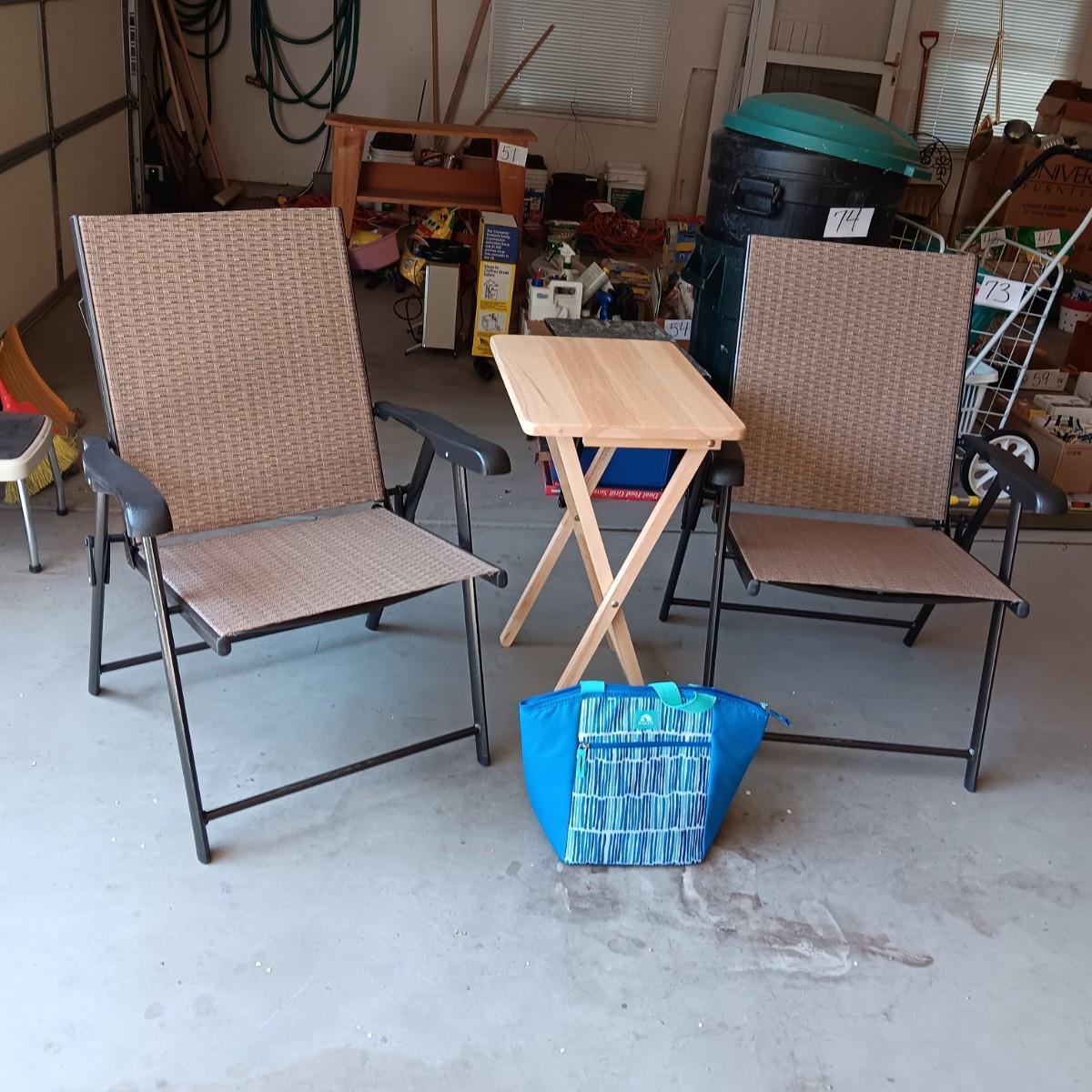 2 NEW FOLDING SLING CHAIRS, SOFT SIDED COOLER AND A FOLDING TABLE