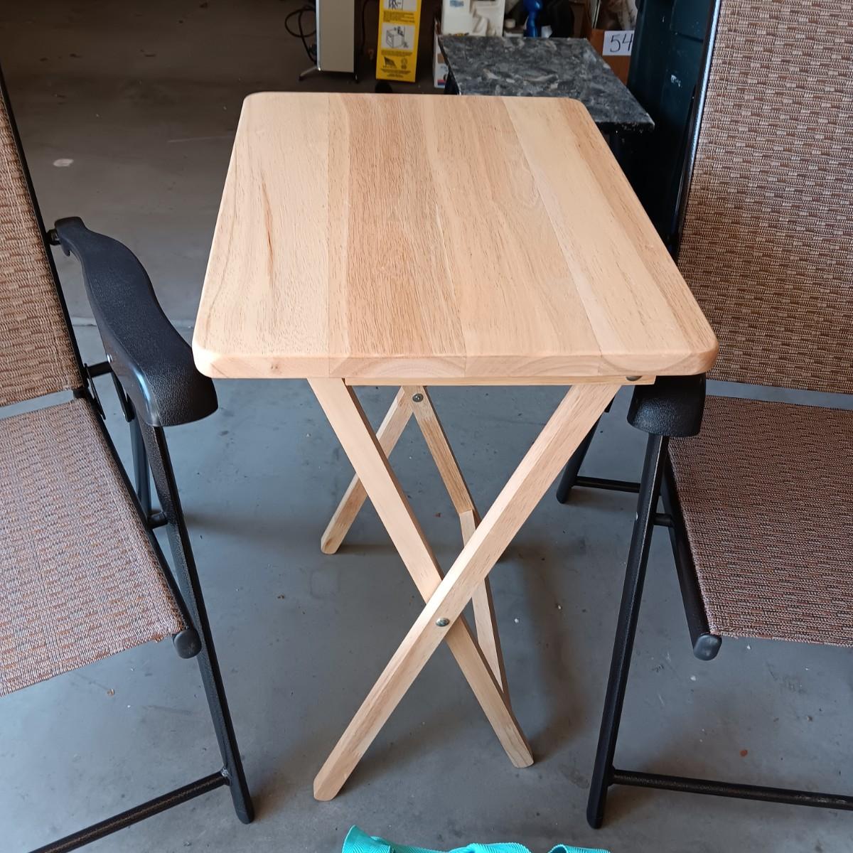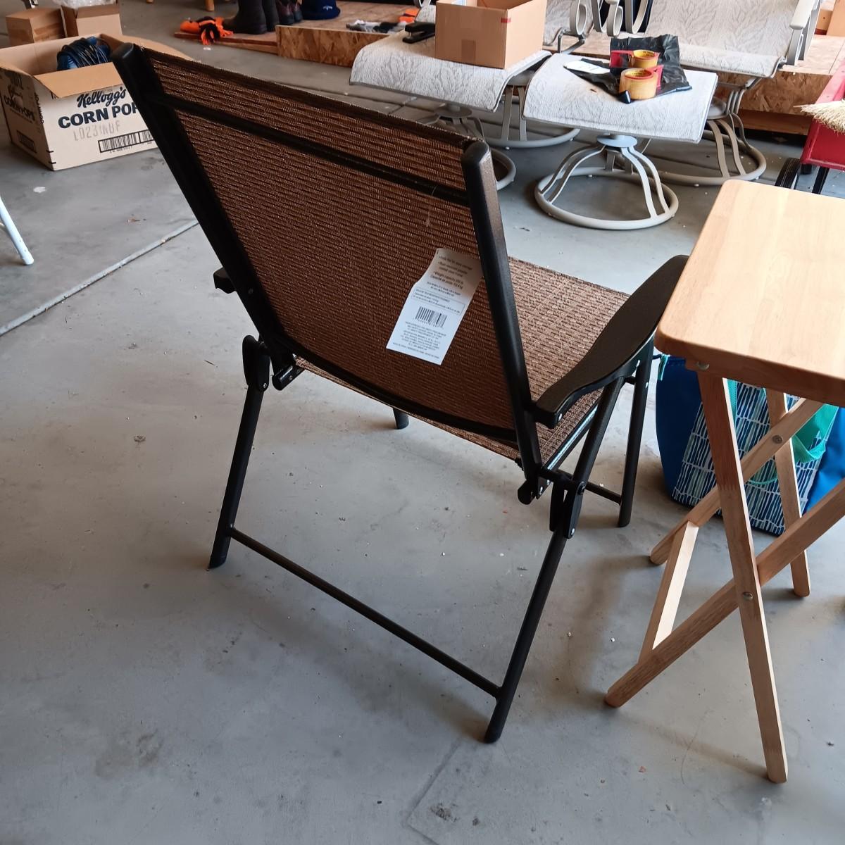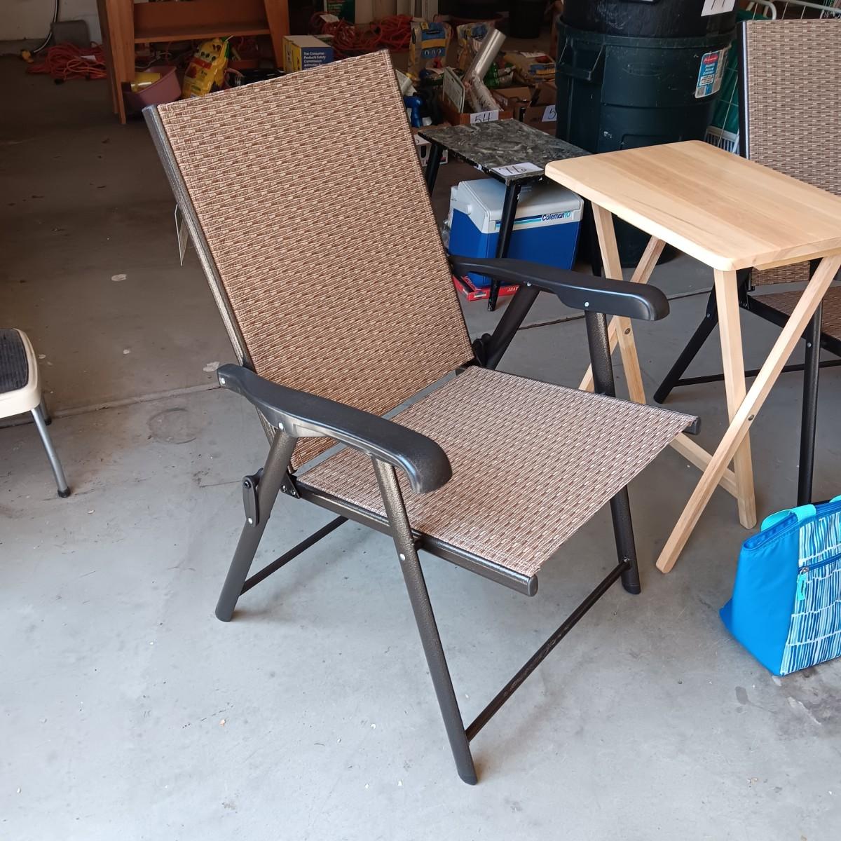 2 NEW FOLDING SLING CHAIRS, SOFT SIDED COOLER AND A FOLDING TABLE