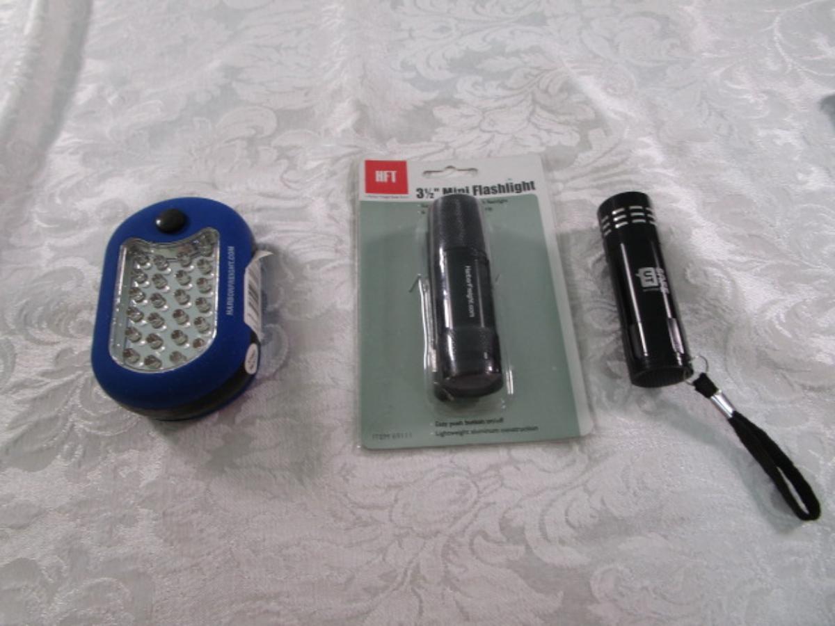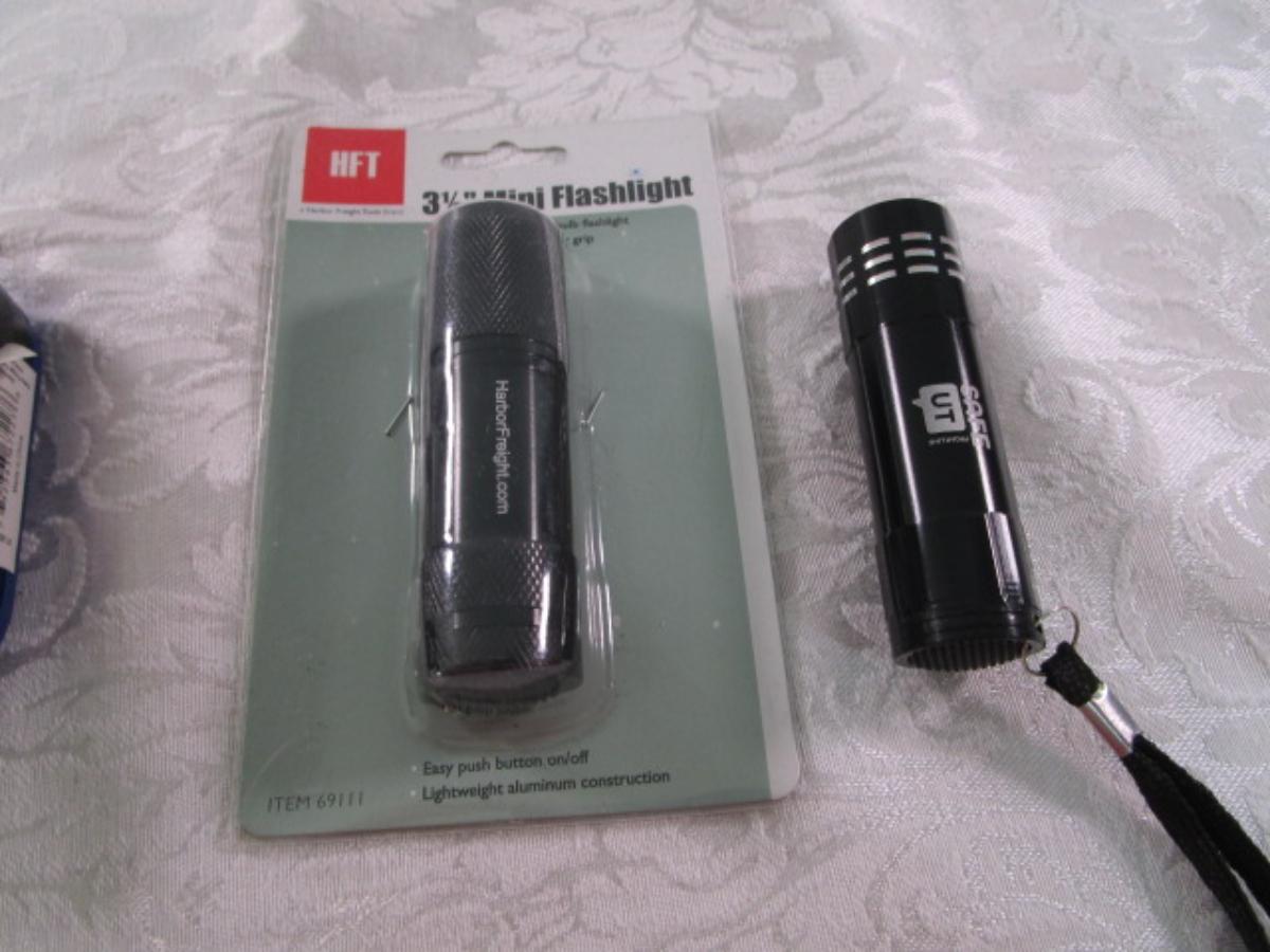 Mini flashlights take 3 AAA batteries not included, work light takes AAA batteries, See pictures