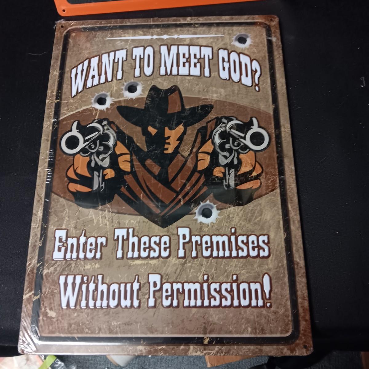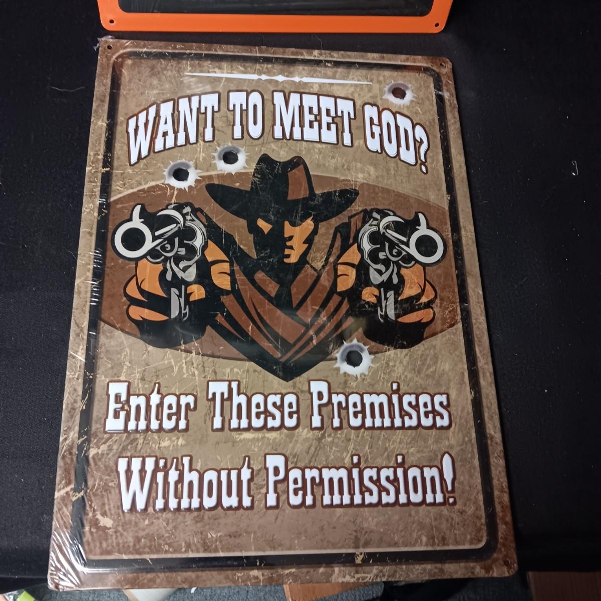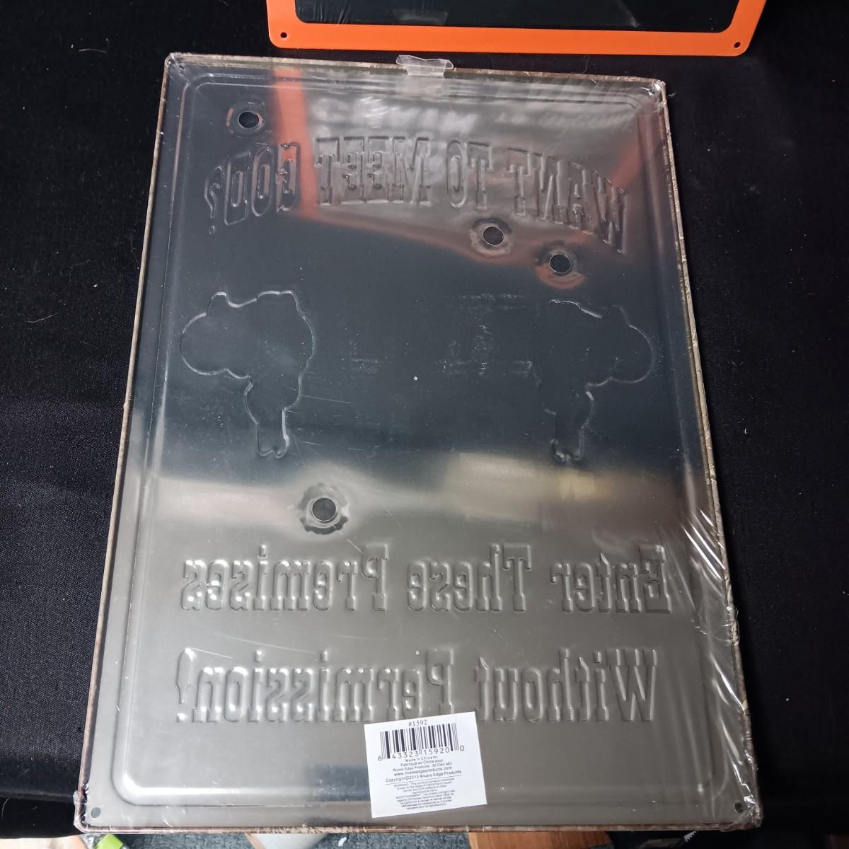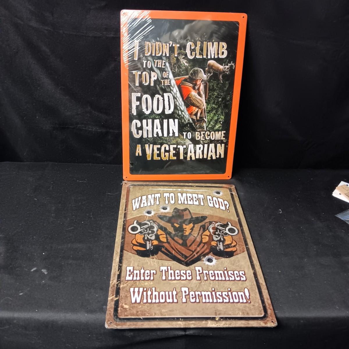 2 NEW TIN SIGNS WITH RAISED LETTERING