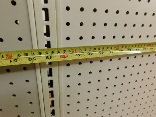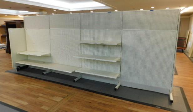 #2 Double Sided Gondola 4 Panel Shelving Peg Board Extended Hght. 16'x6.5' This is a 4 panel set at 4' each panel. Includes extended peg board for additional display space. End cap peg board as well. At time of publication each gondola has 30 total shelves varying depth. These units are extremely clean and well kept.