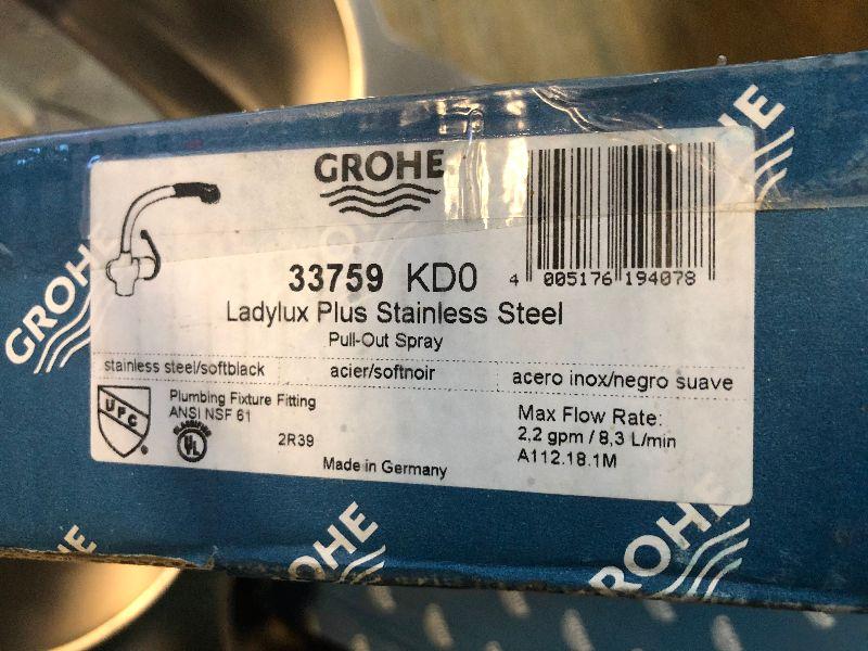 NEW, GROHE faucet. Ladylux Plus Stainless Steel & soft black. Soft touch pull-out spray head switches from stream to spray. GROHE SilkMove ensures smooth, precise handle motion. Compatible with GROHE Foot Control 30310000.