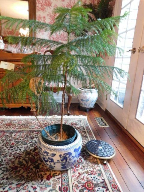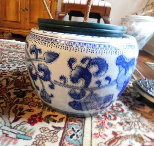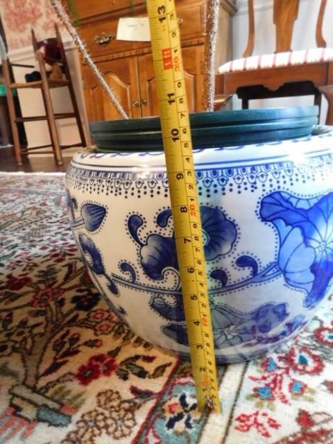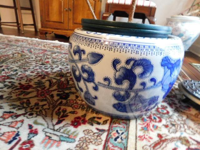 2 of 3: Ceramic Jardinere Blue with White Asian Design 10"