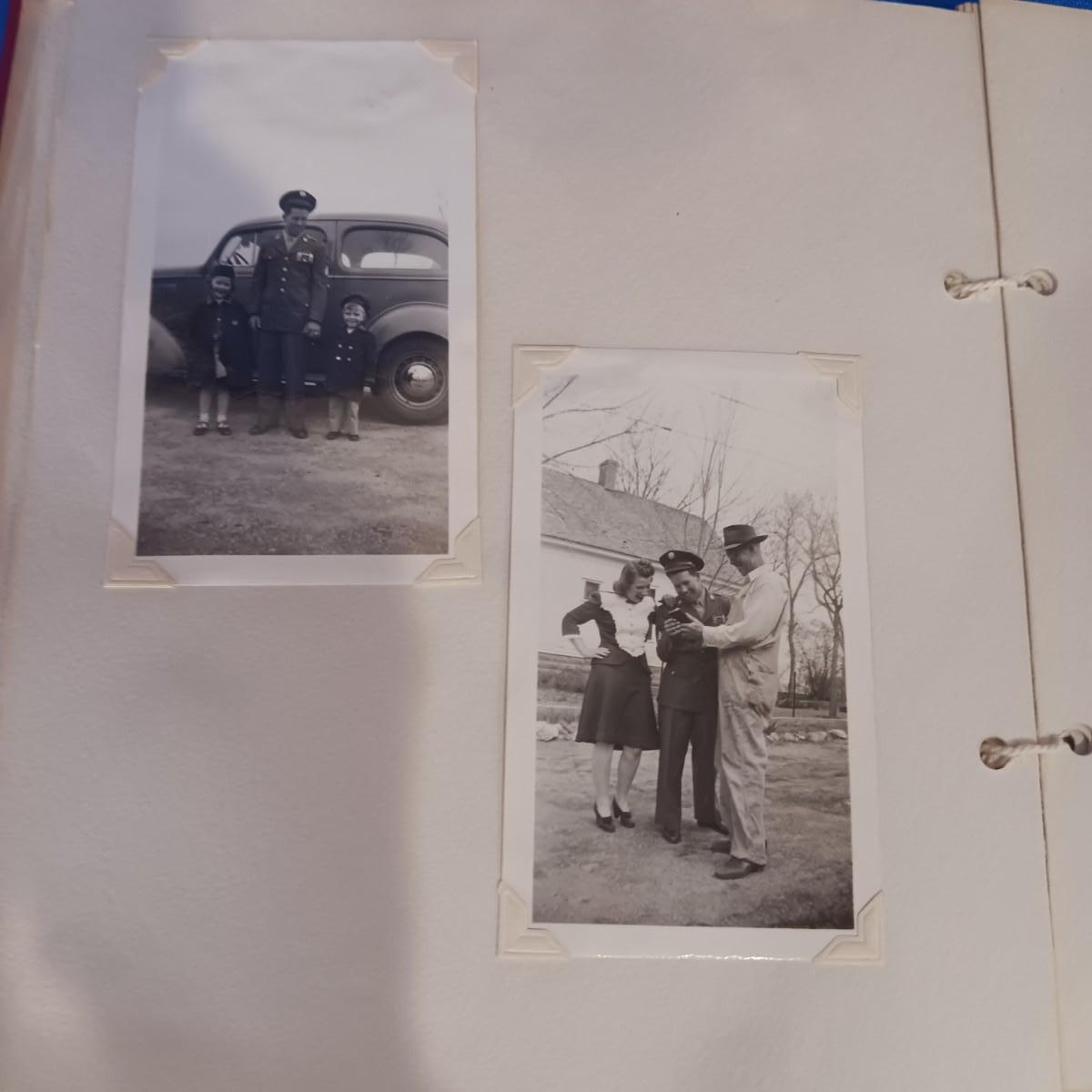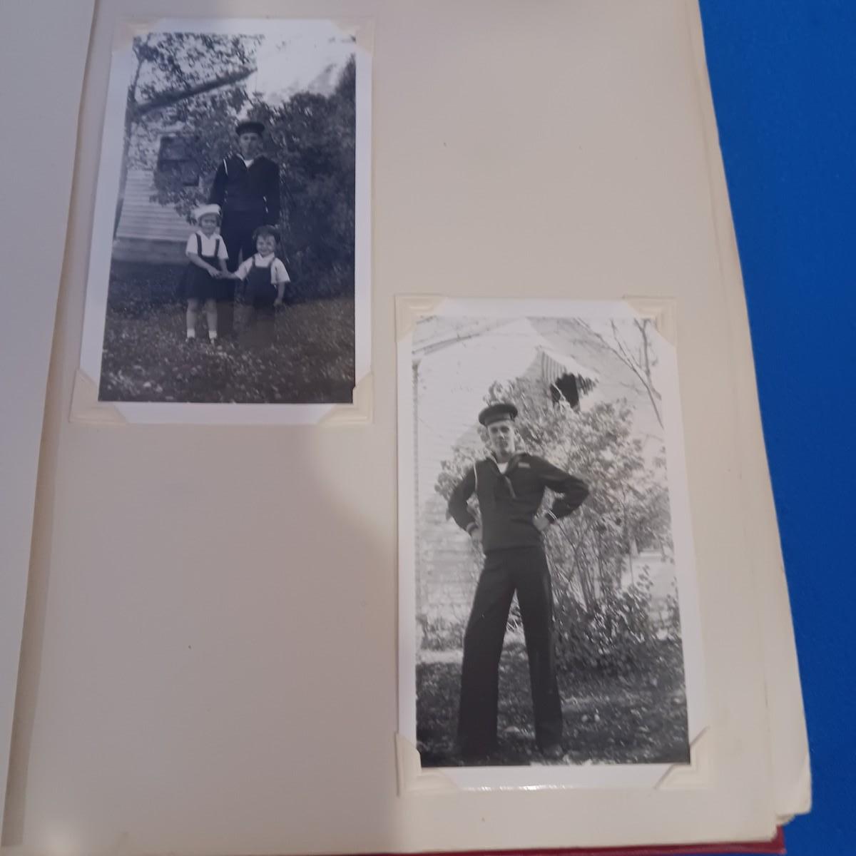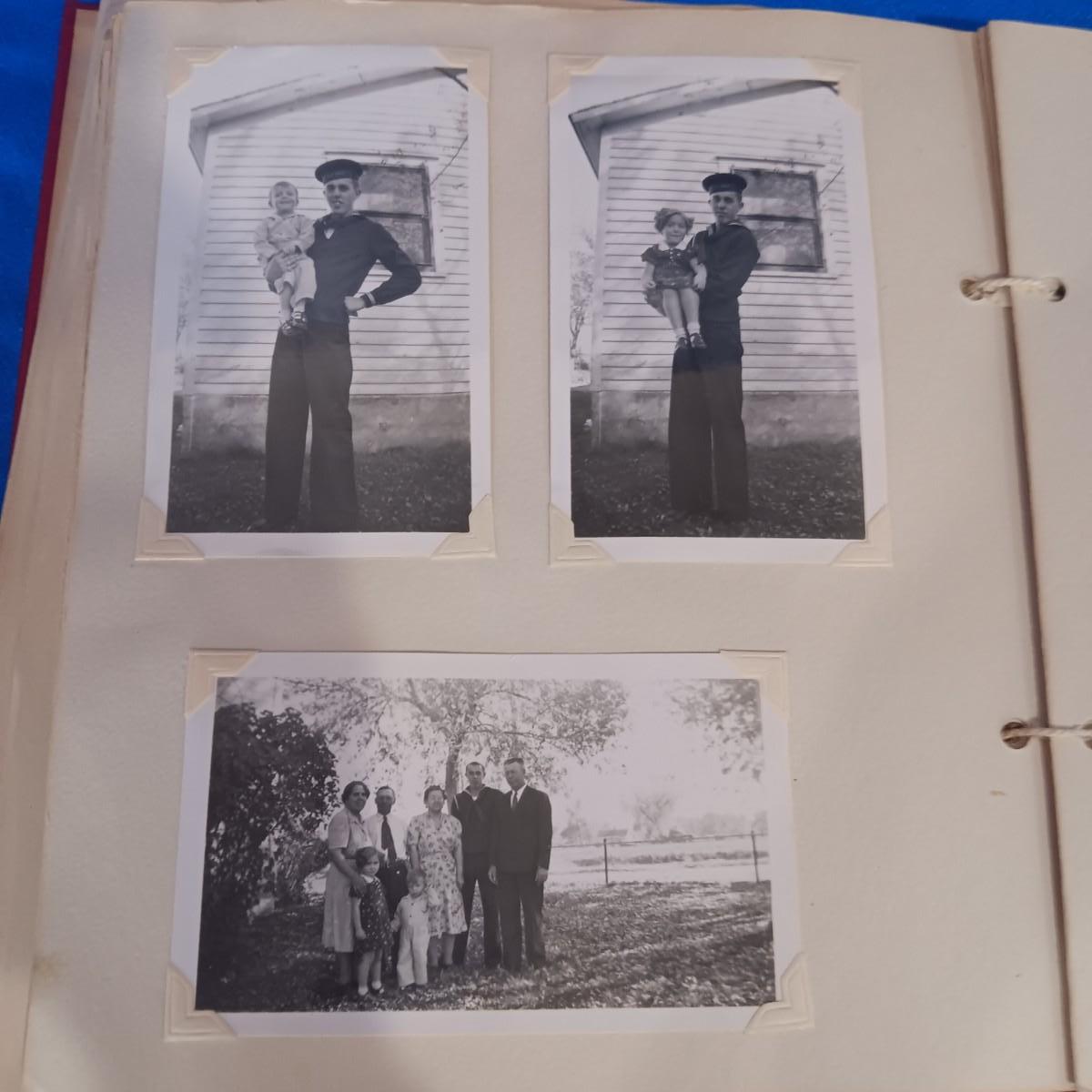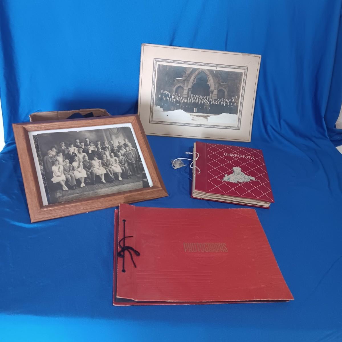 2 OLD GROUP PHOTOS, PHOTO ALBUM FILLED WITH PICTURES AND A SCRAP BOOK WITH A FEW PAGES FILLED