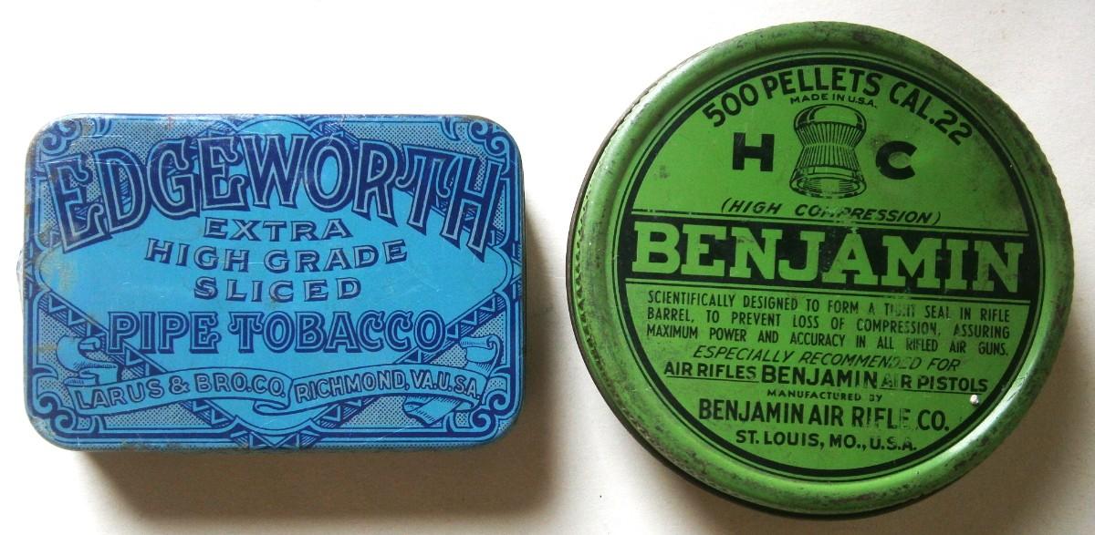 2 Older Tins, Benjamin Pellet Tin & EGEWORTH Tobacco Tin, 4 1/8 in. diameter, and 3 1/4 x 2 1/4 in., lithographed tin.