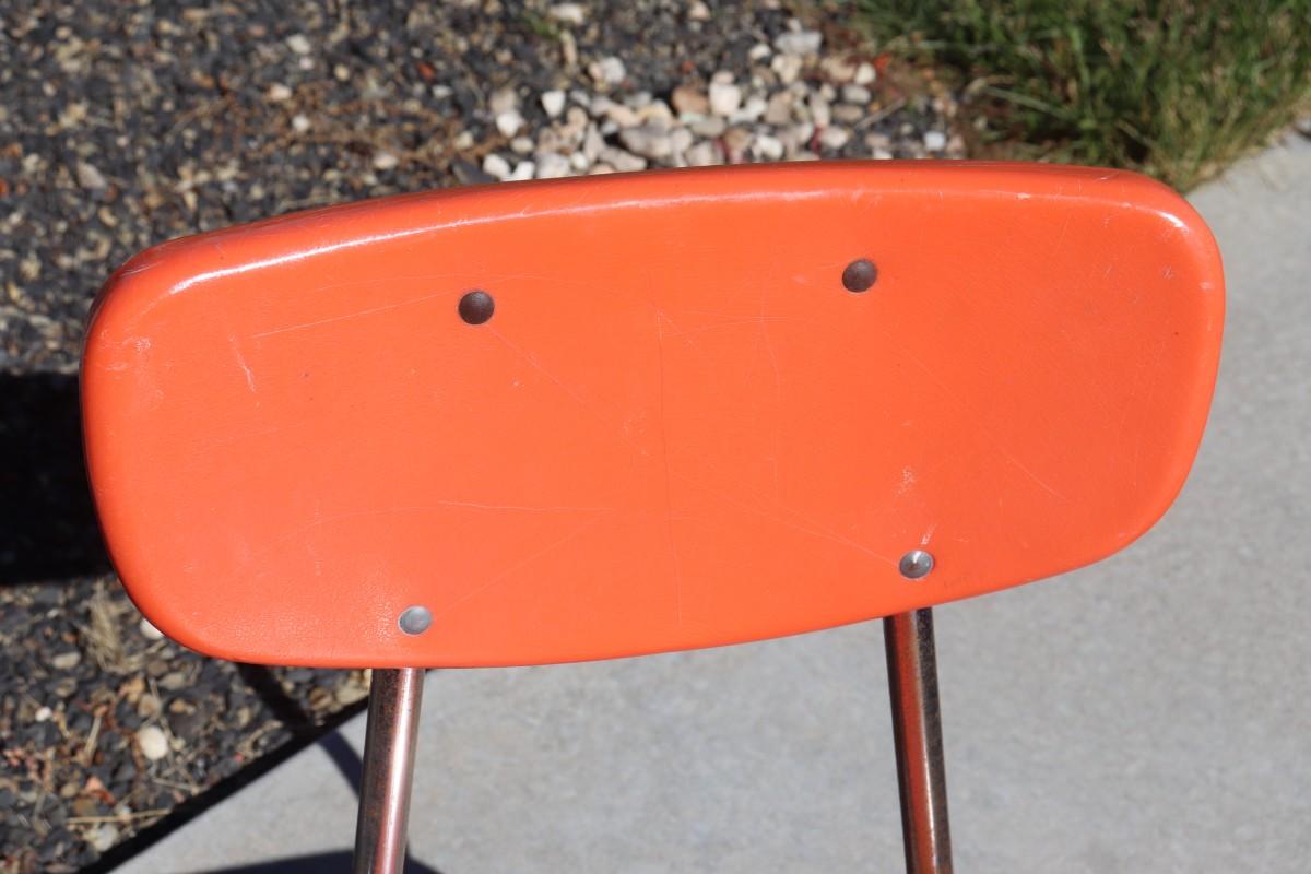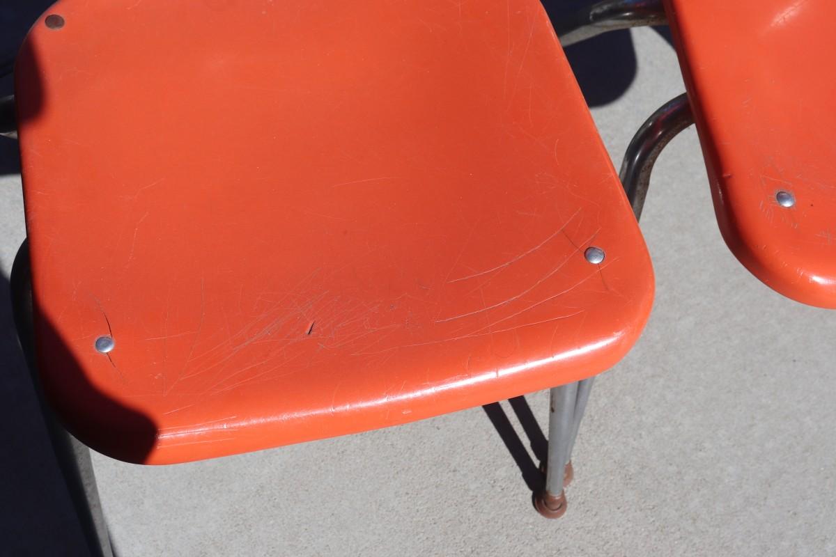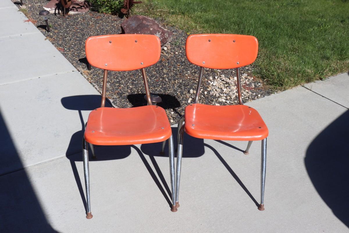 A pair of bright orange chairs designed for school-aged children, ideal for playrooms, study areas, or children's rooms.