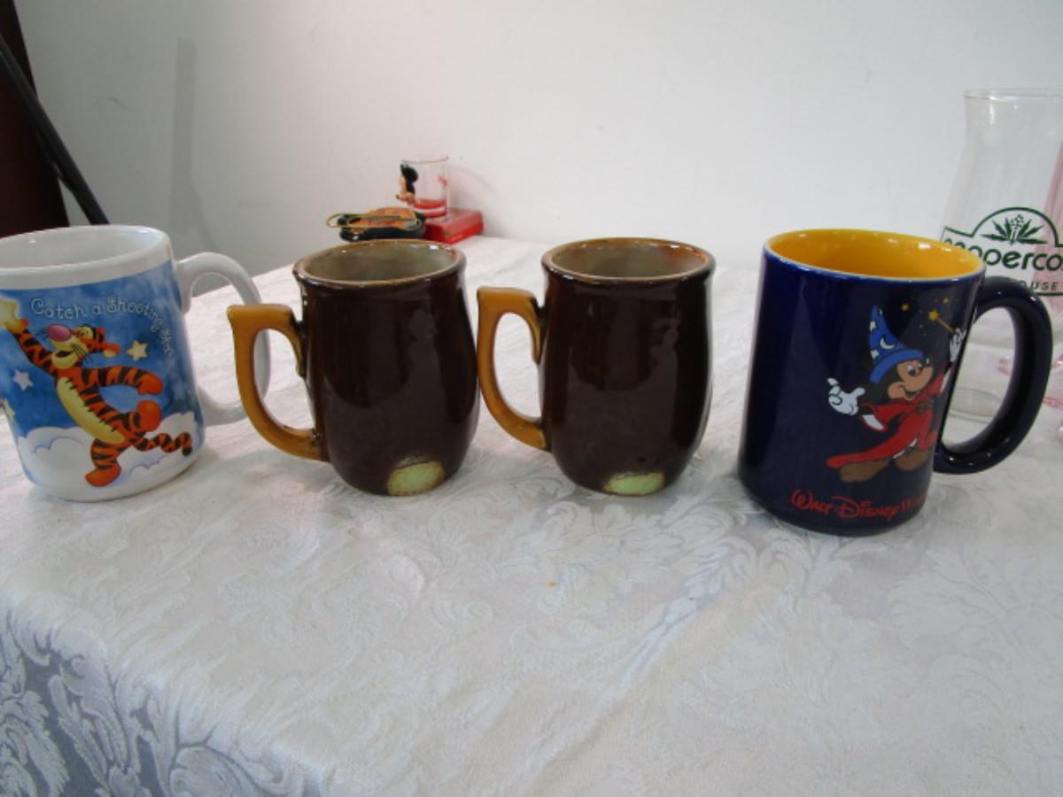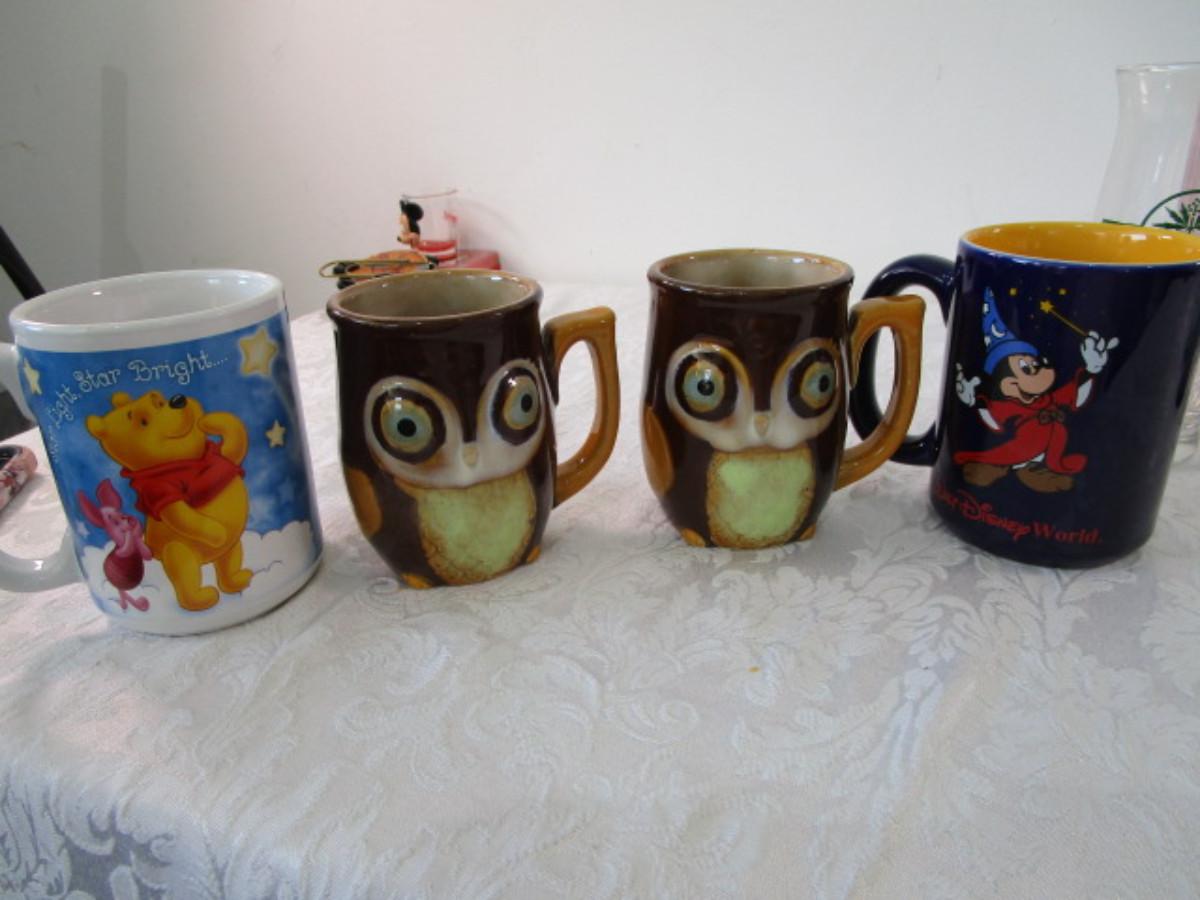 2 Owl mugs, 1 Mickey Mouse mug, 1 Winnie-the-Pooh mug