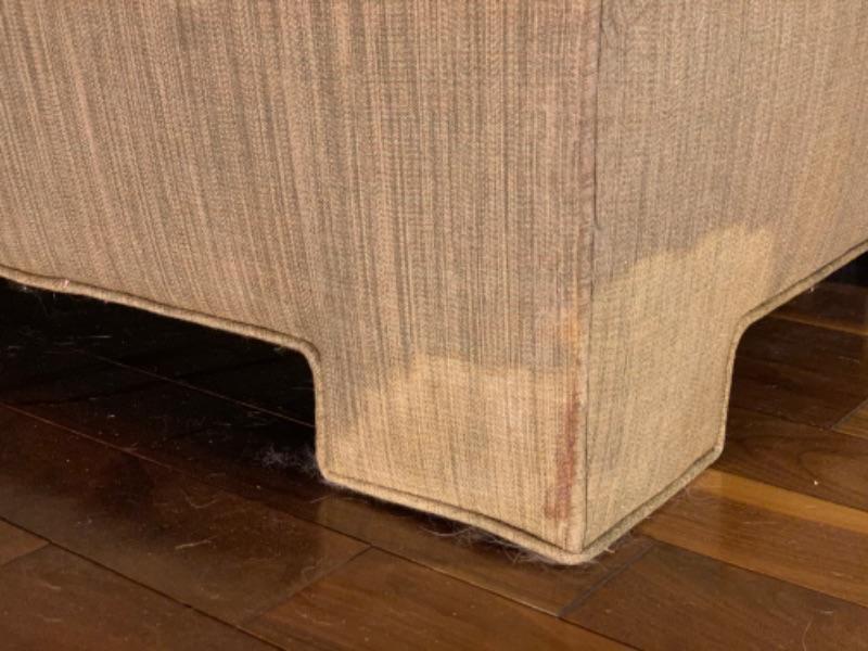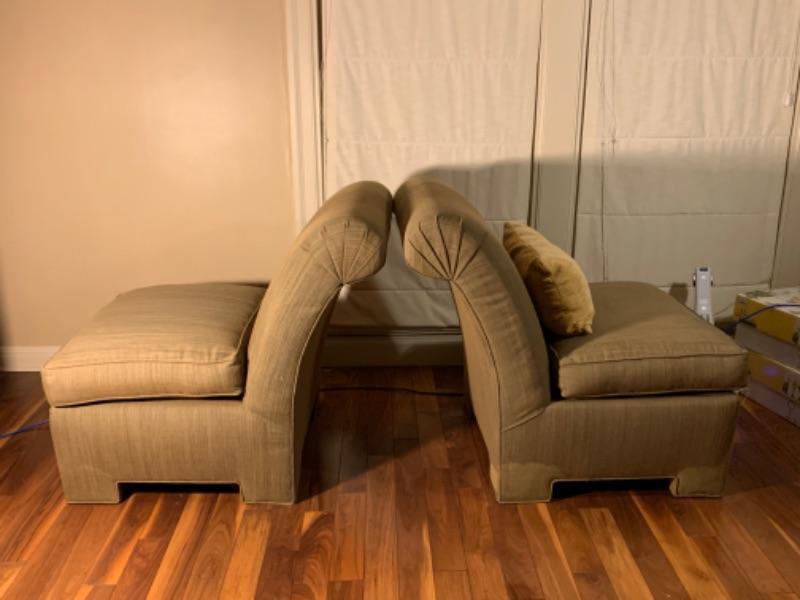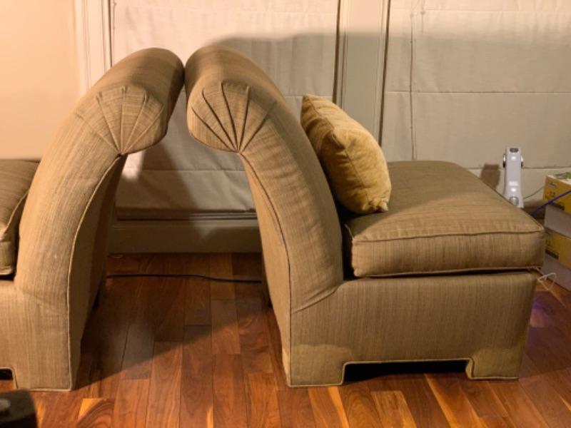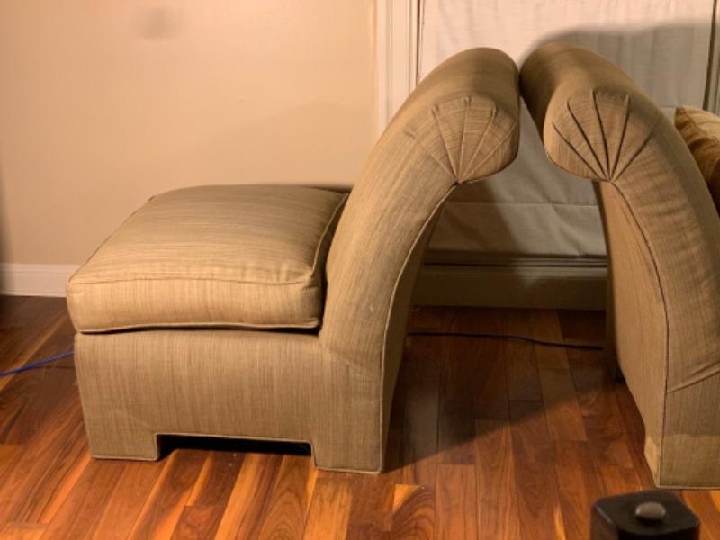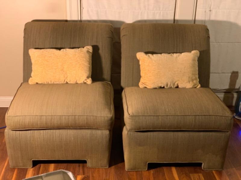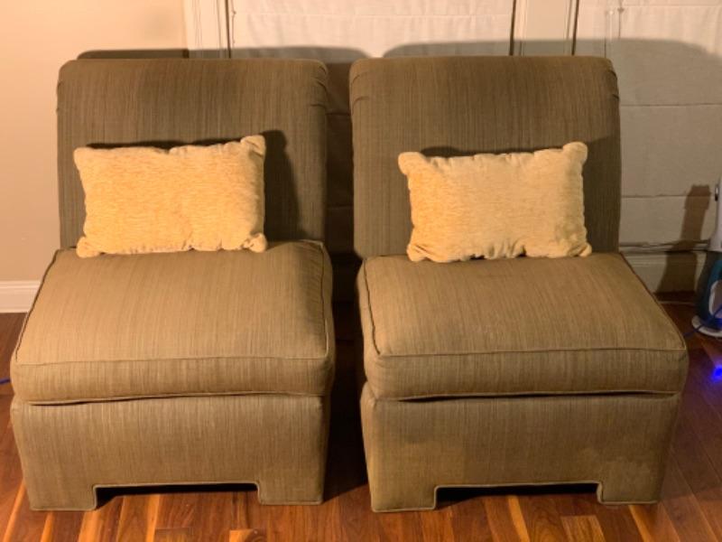 Pair of Upholstered Occasional Chairs with Rectangular Pillows. Some staining and fading on one chair. Was $65